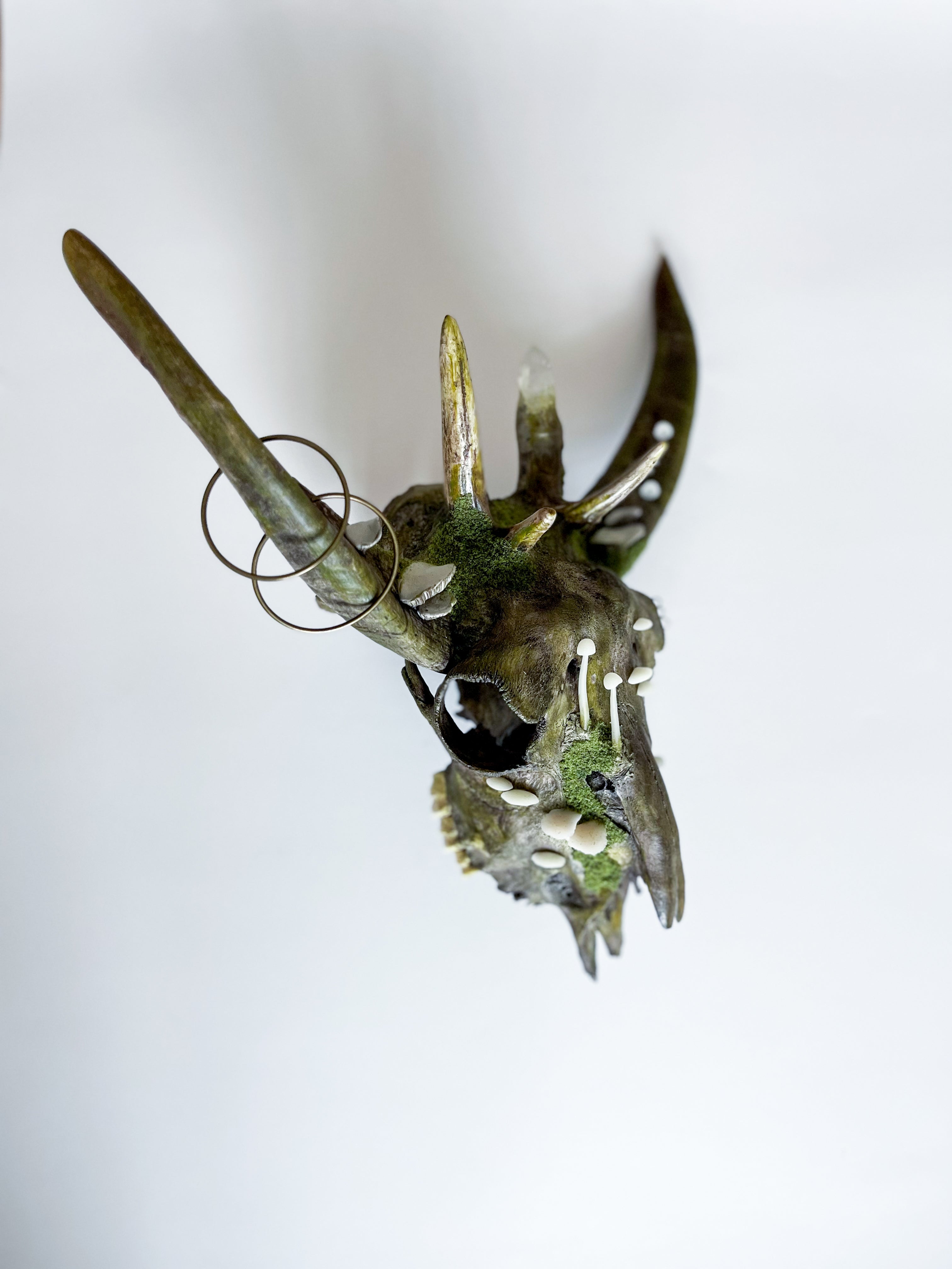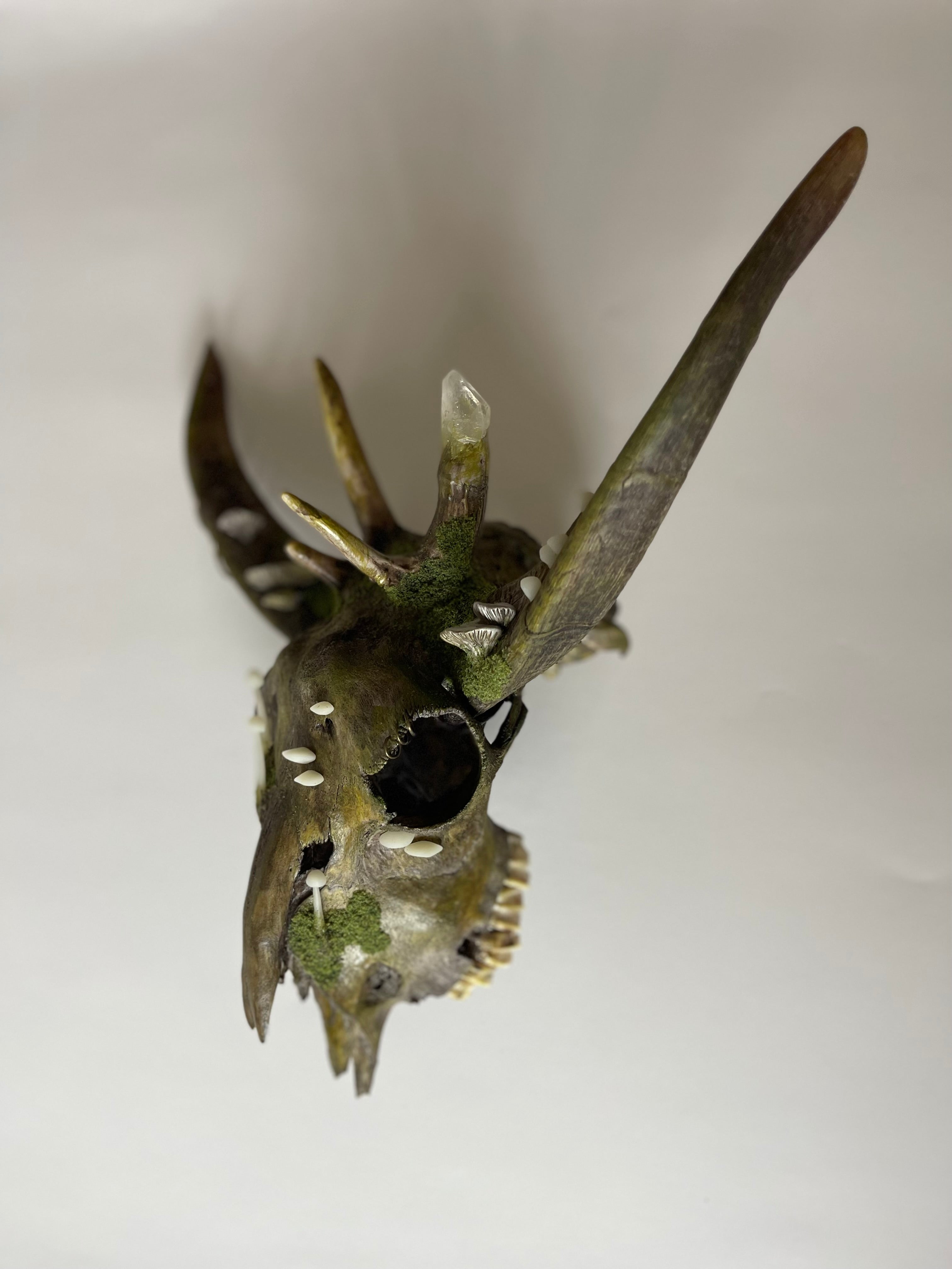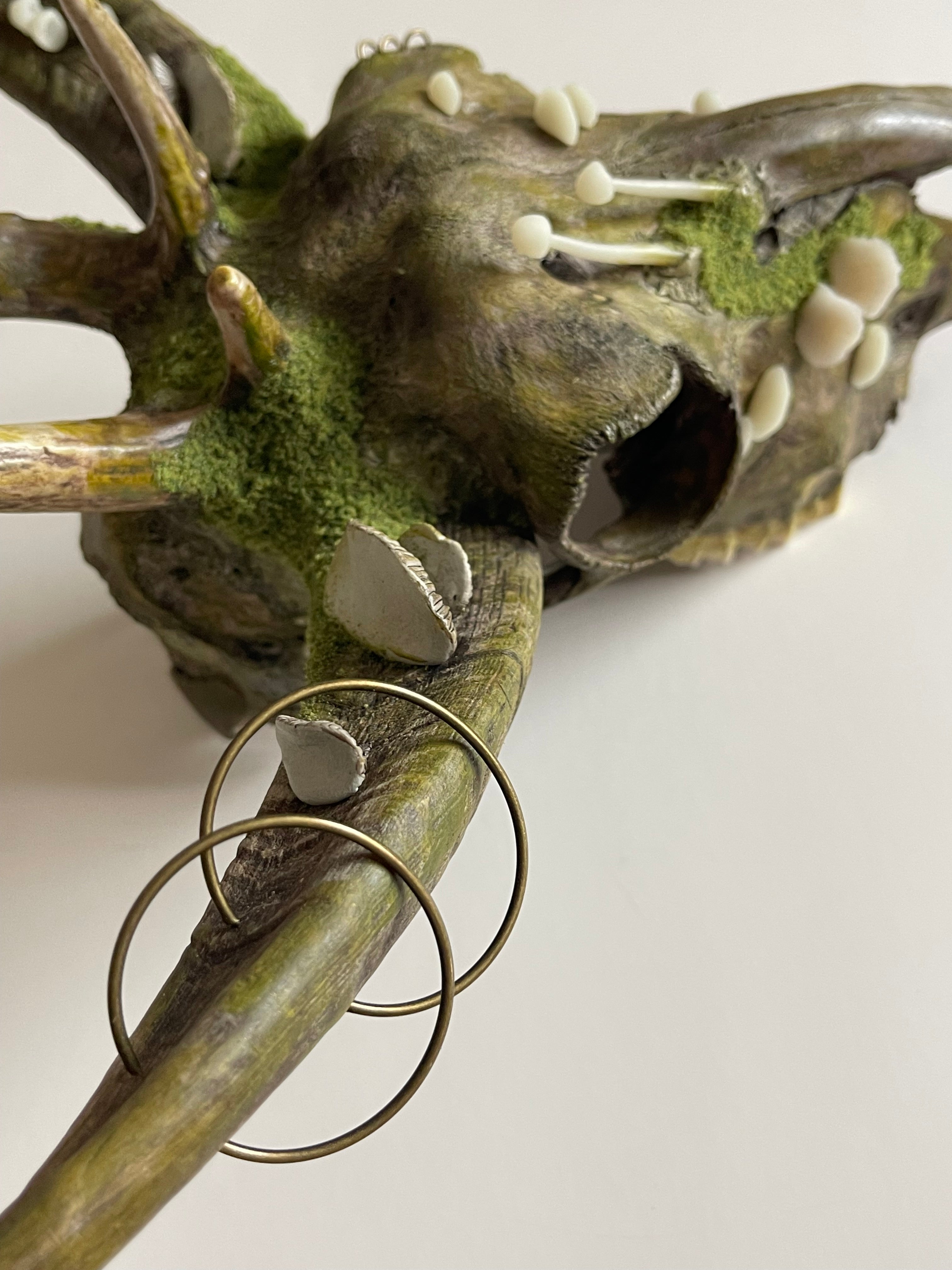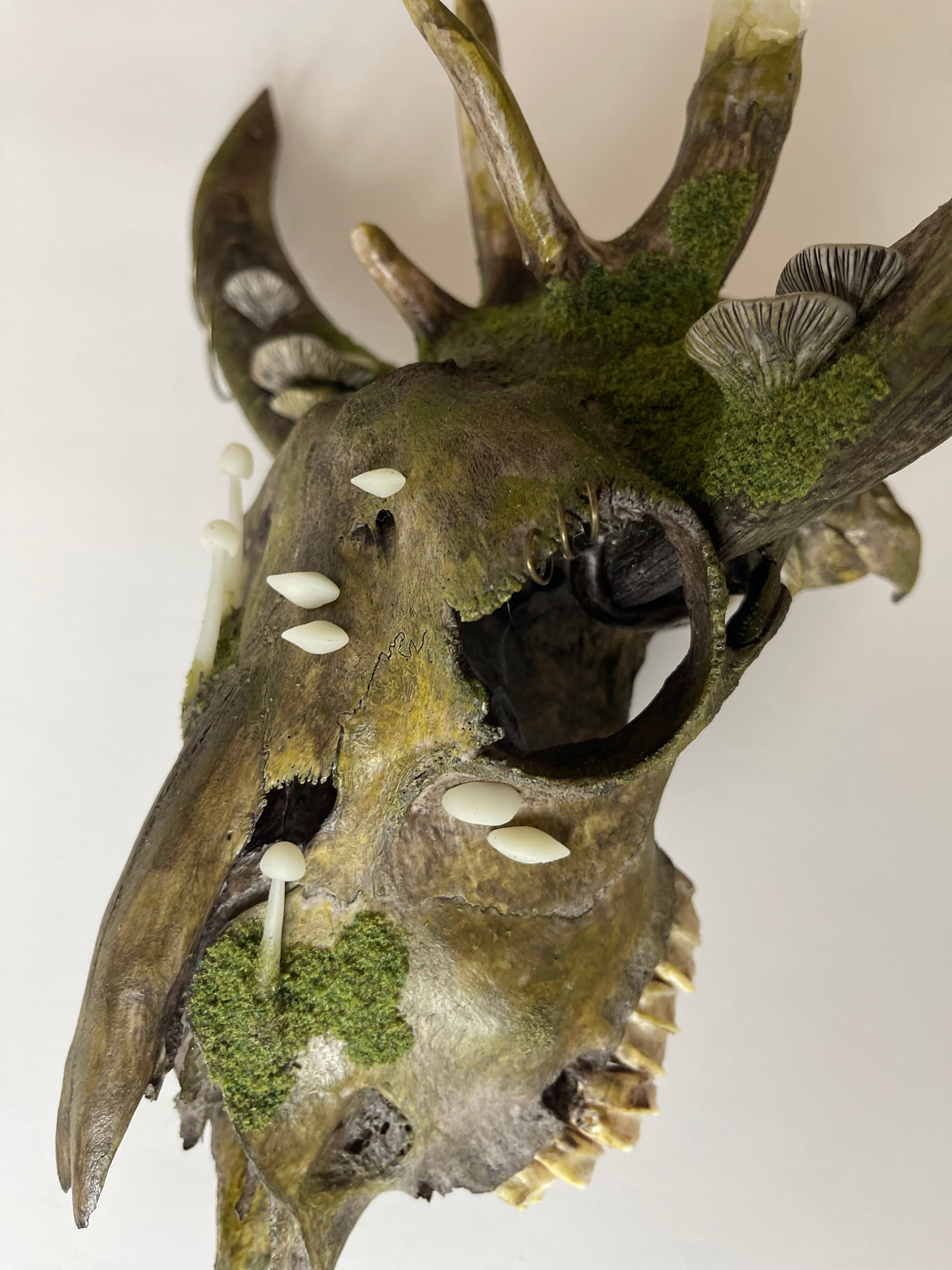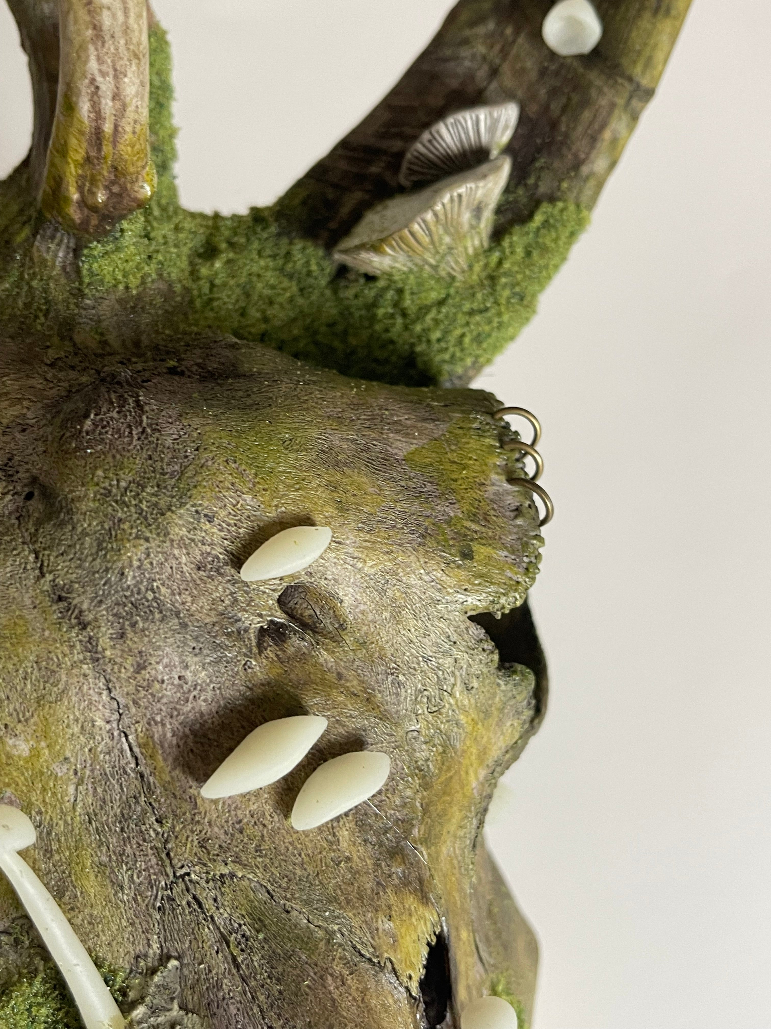 This beautiful piece is created using a forest found skull with attached reclaimed goat horns and deer antlers. Adorned with all matter of hand sculpted and painted forest growth.
