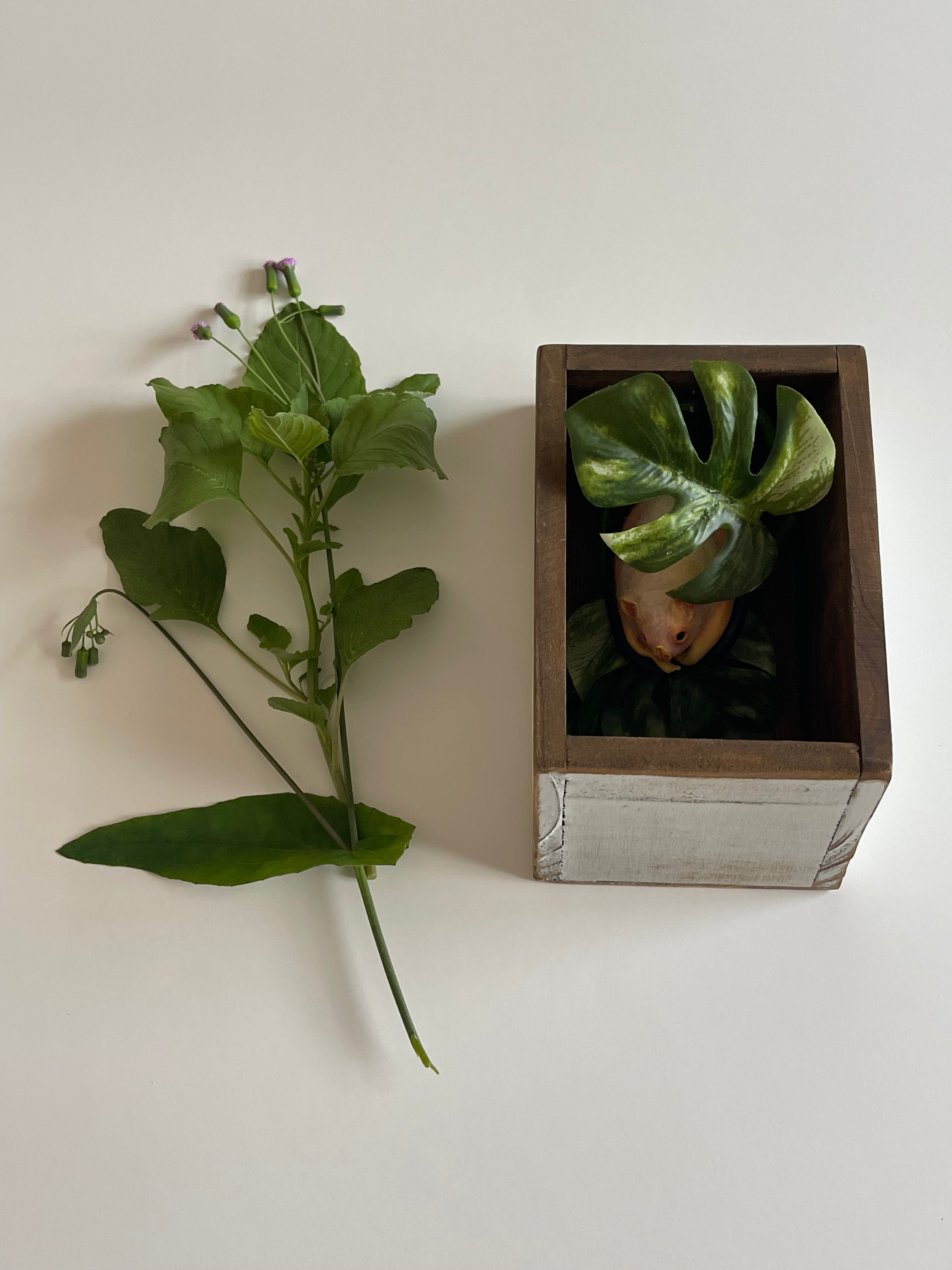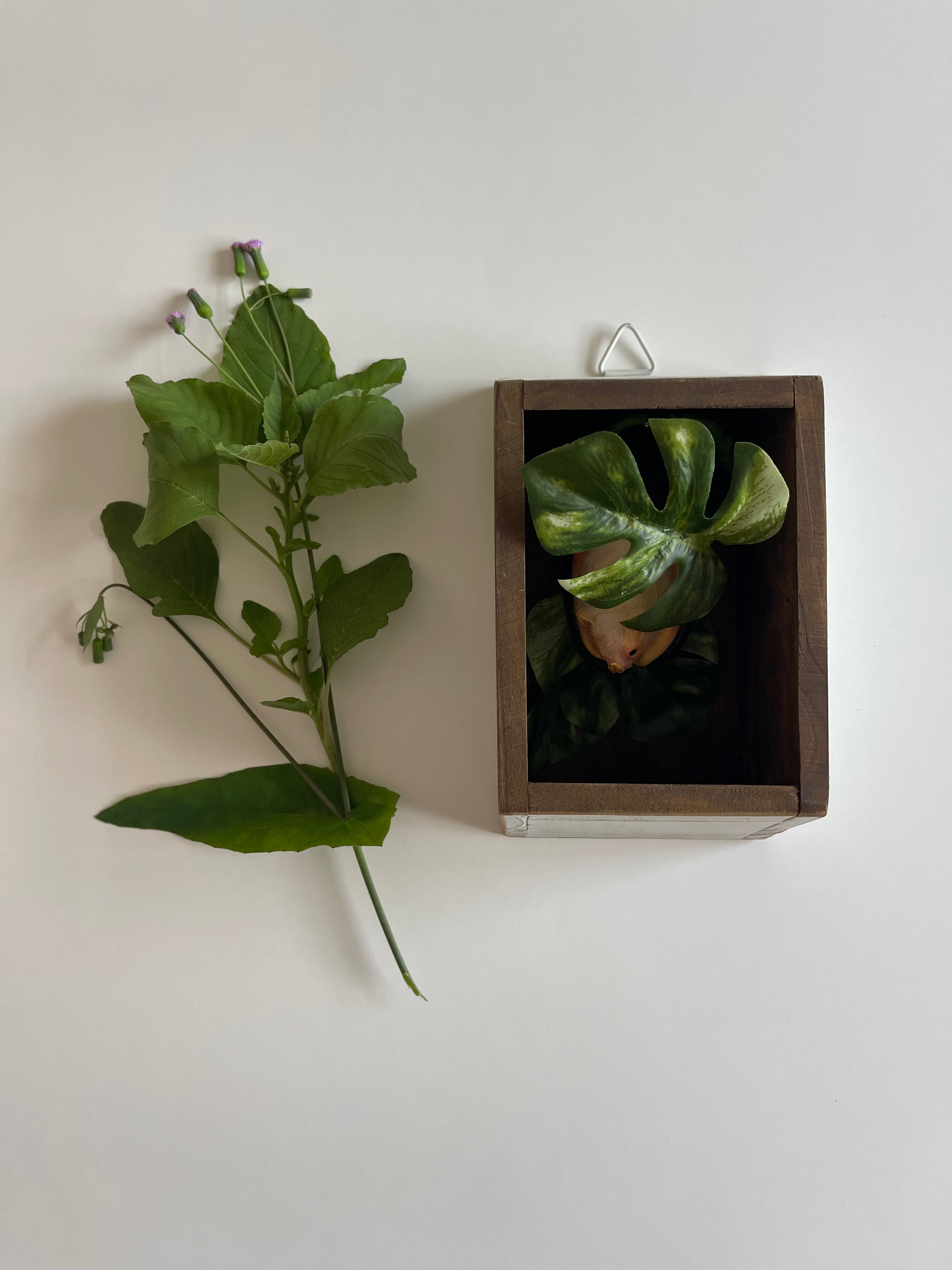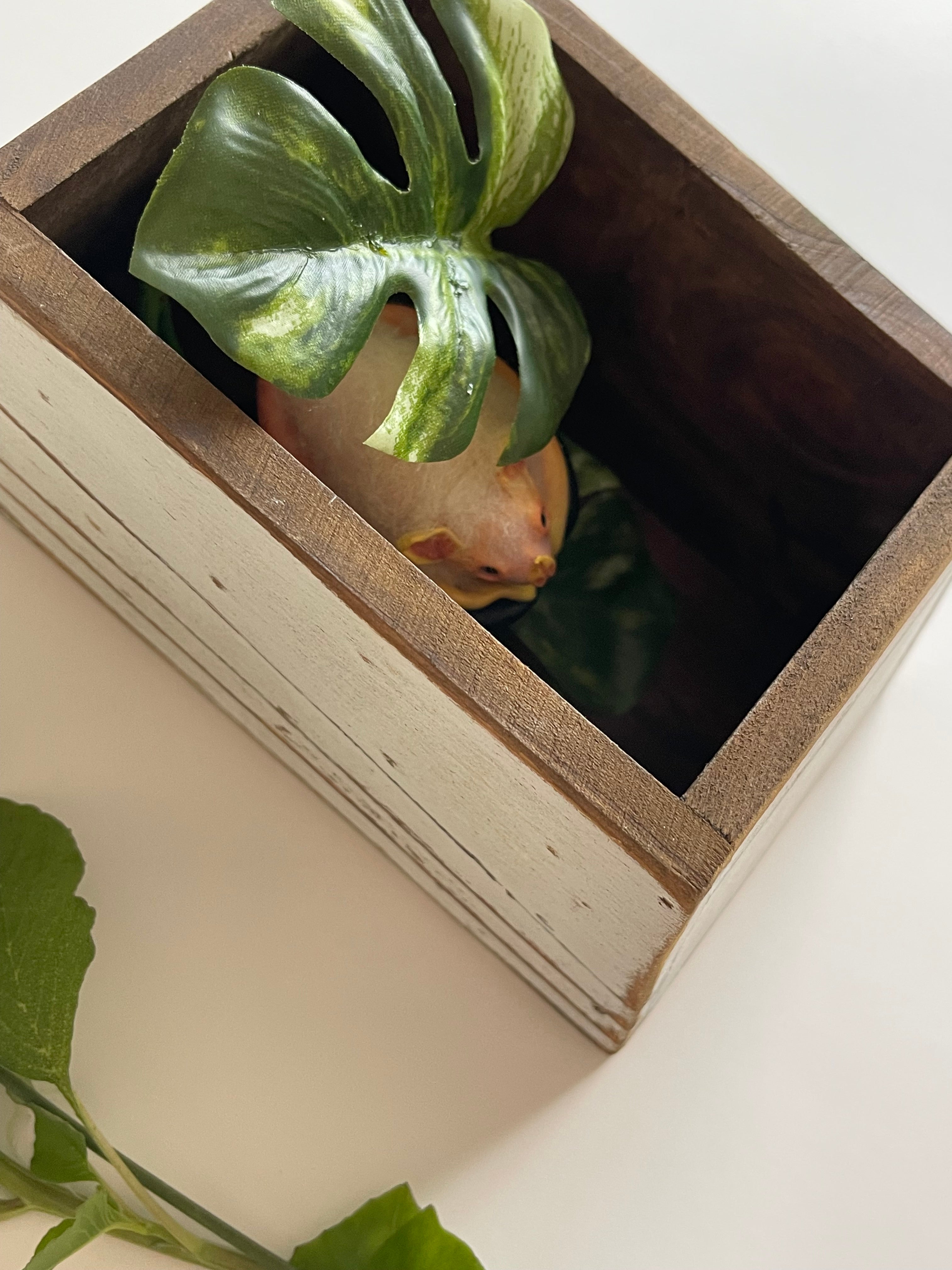 This bat box houses a Pygmy leaf nose bat who is nestled among faux flora.