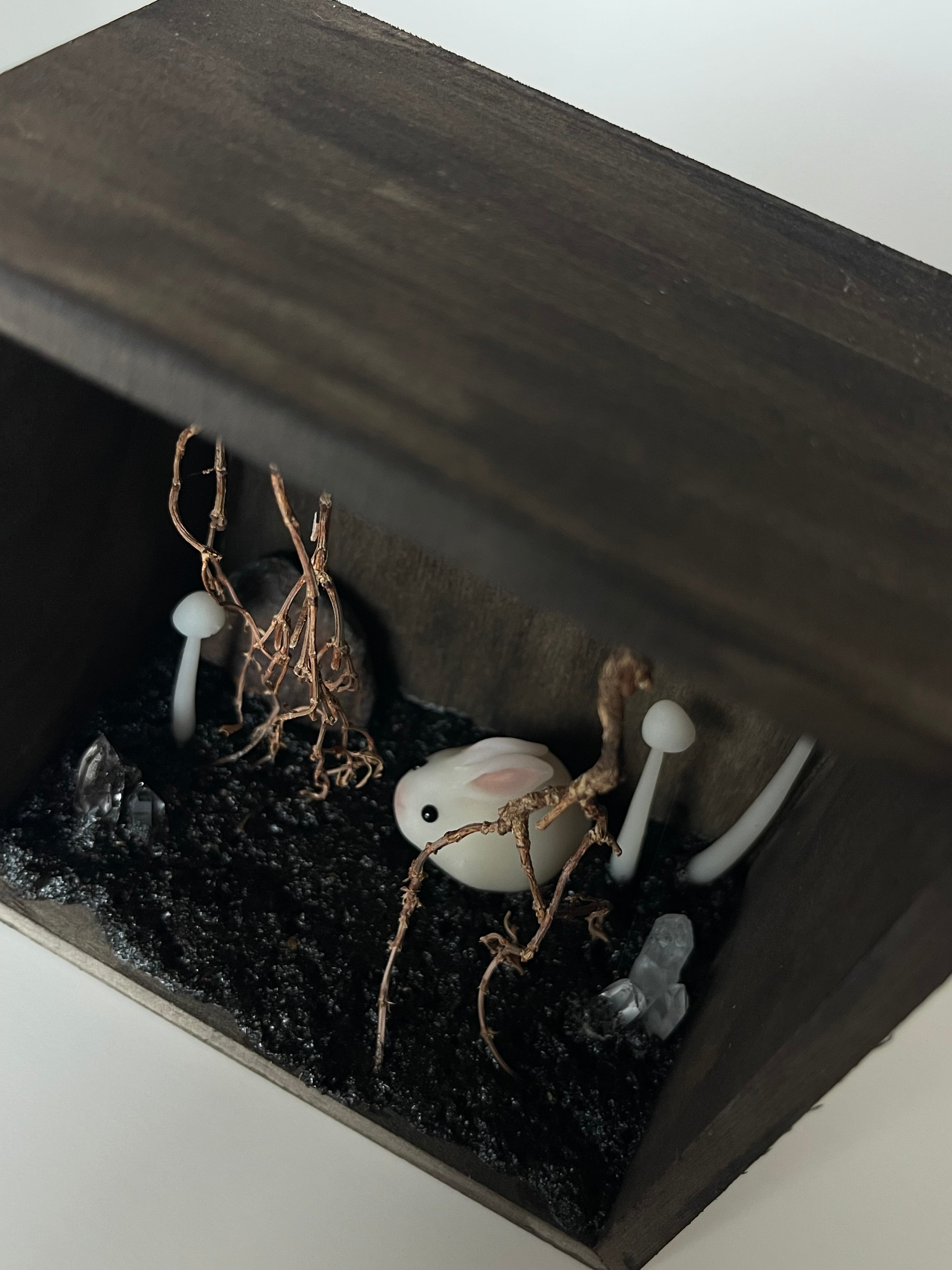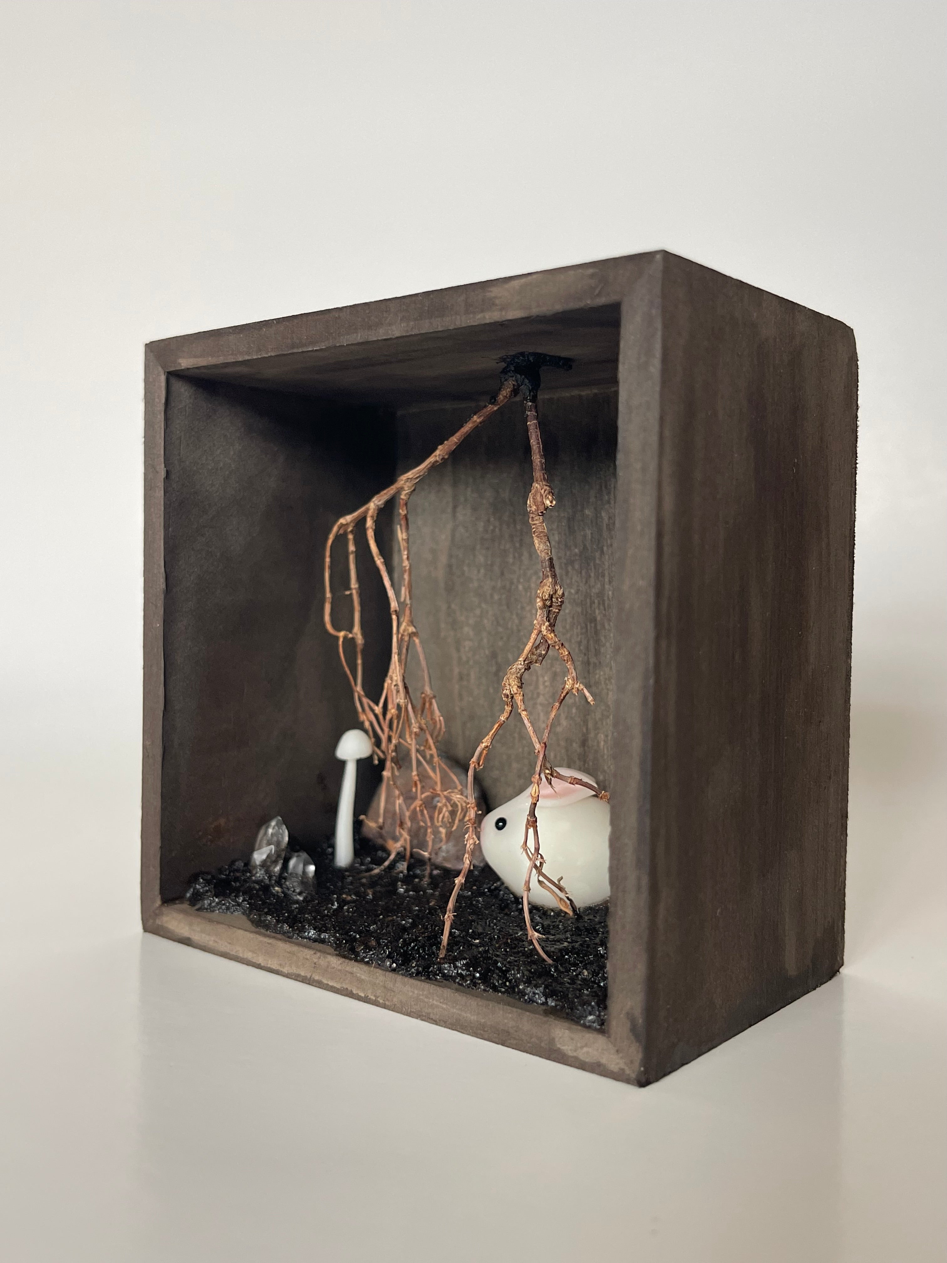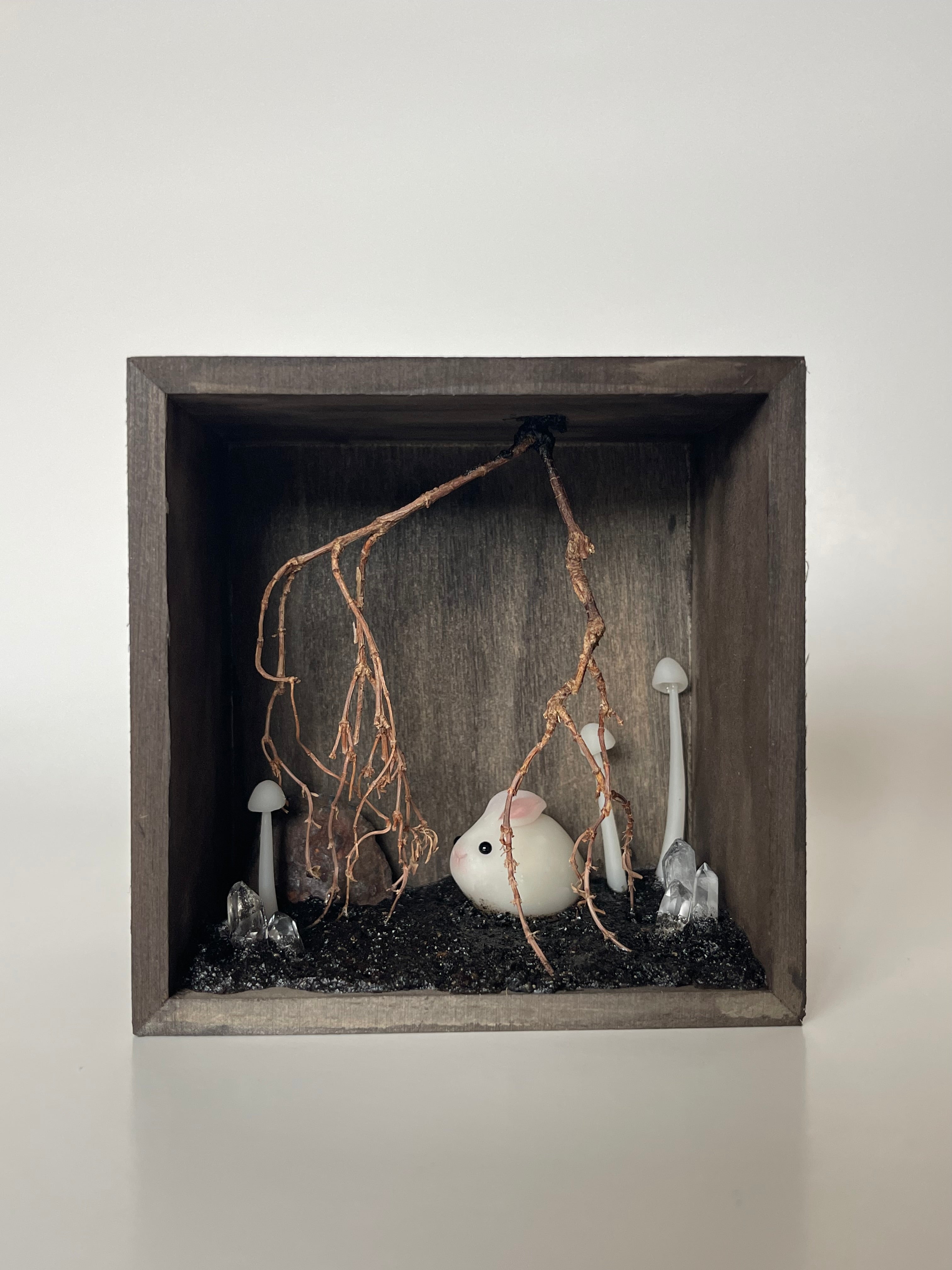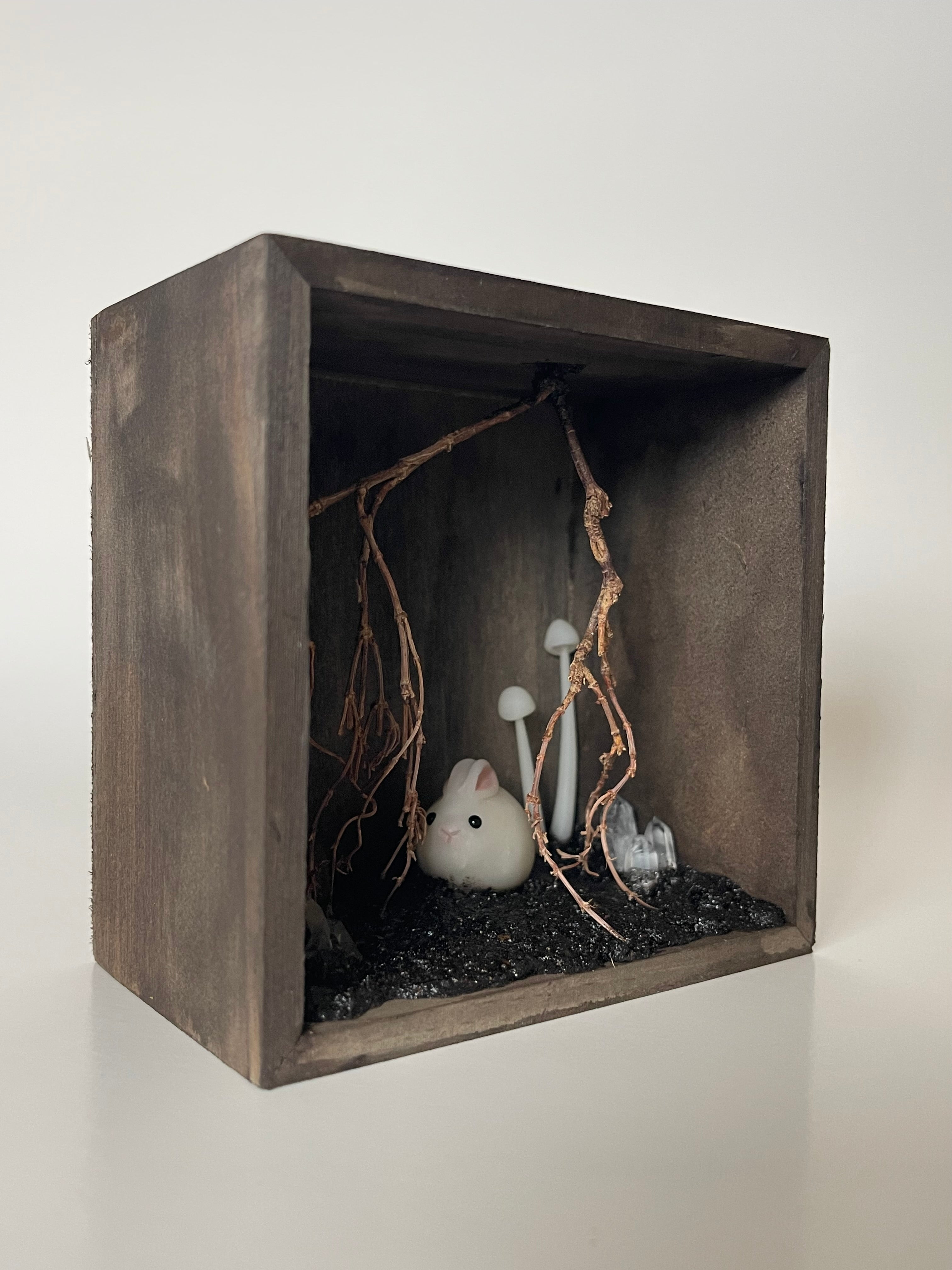 This beautiful little scene is set in a brown shadowbox, filled with a branch root system, clay mushrooms and crystals. The bunny is hand sculpted and painted with natural pigments.