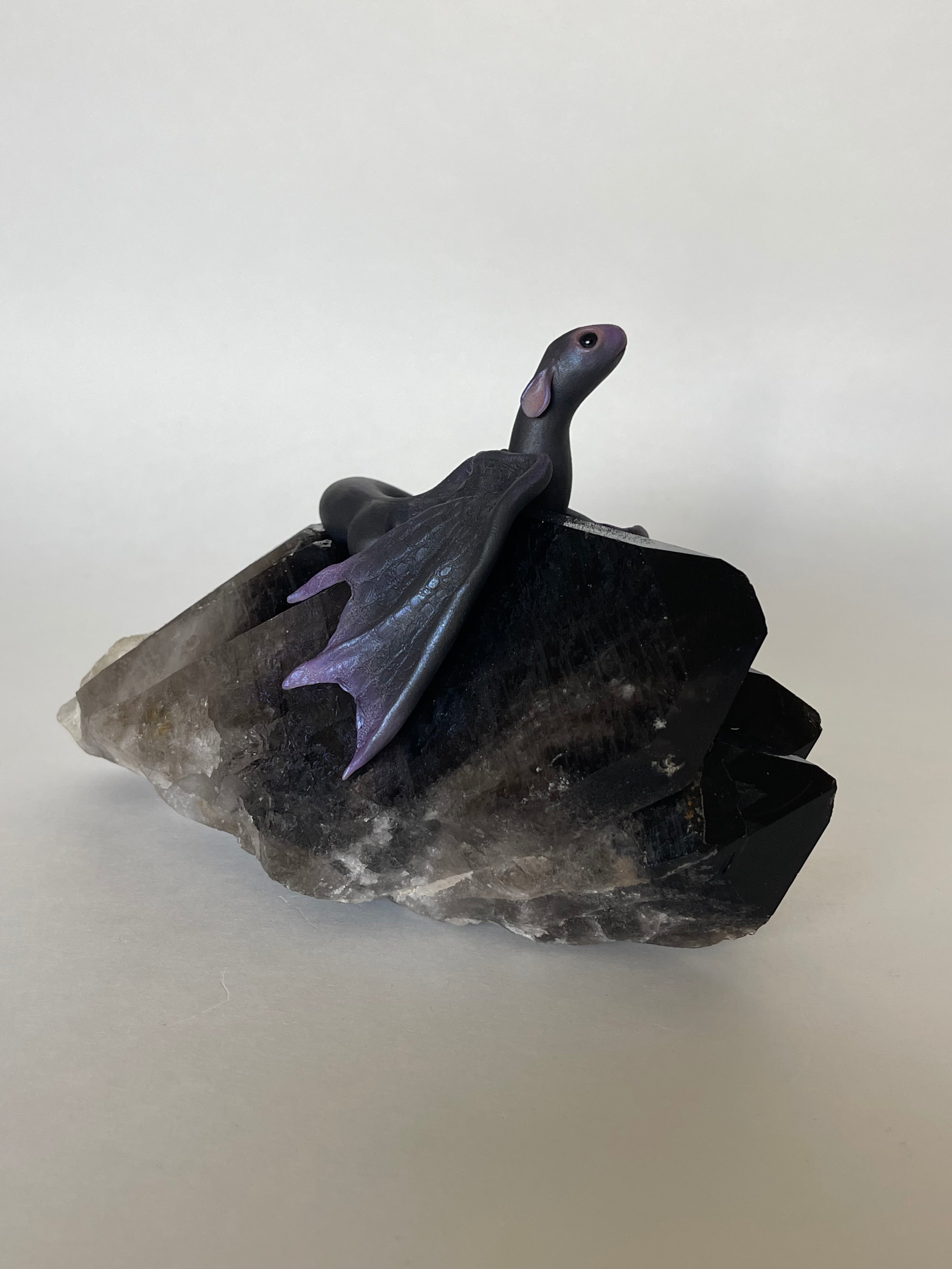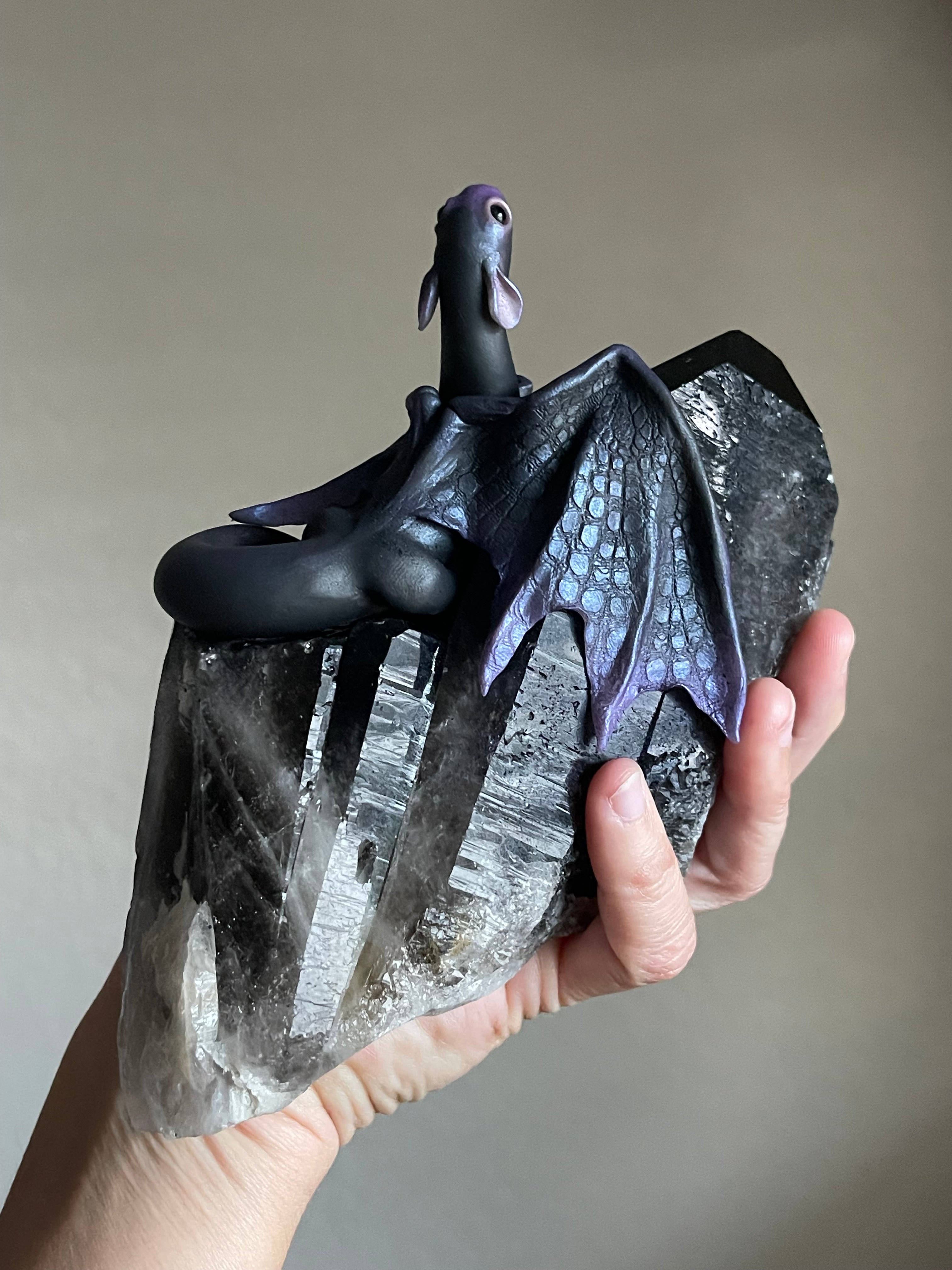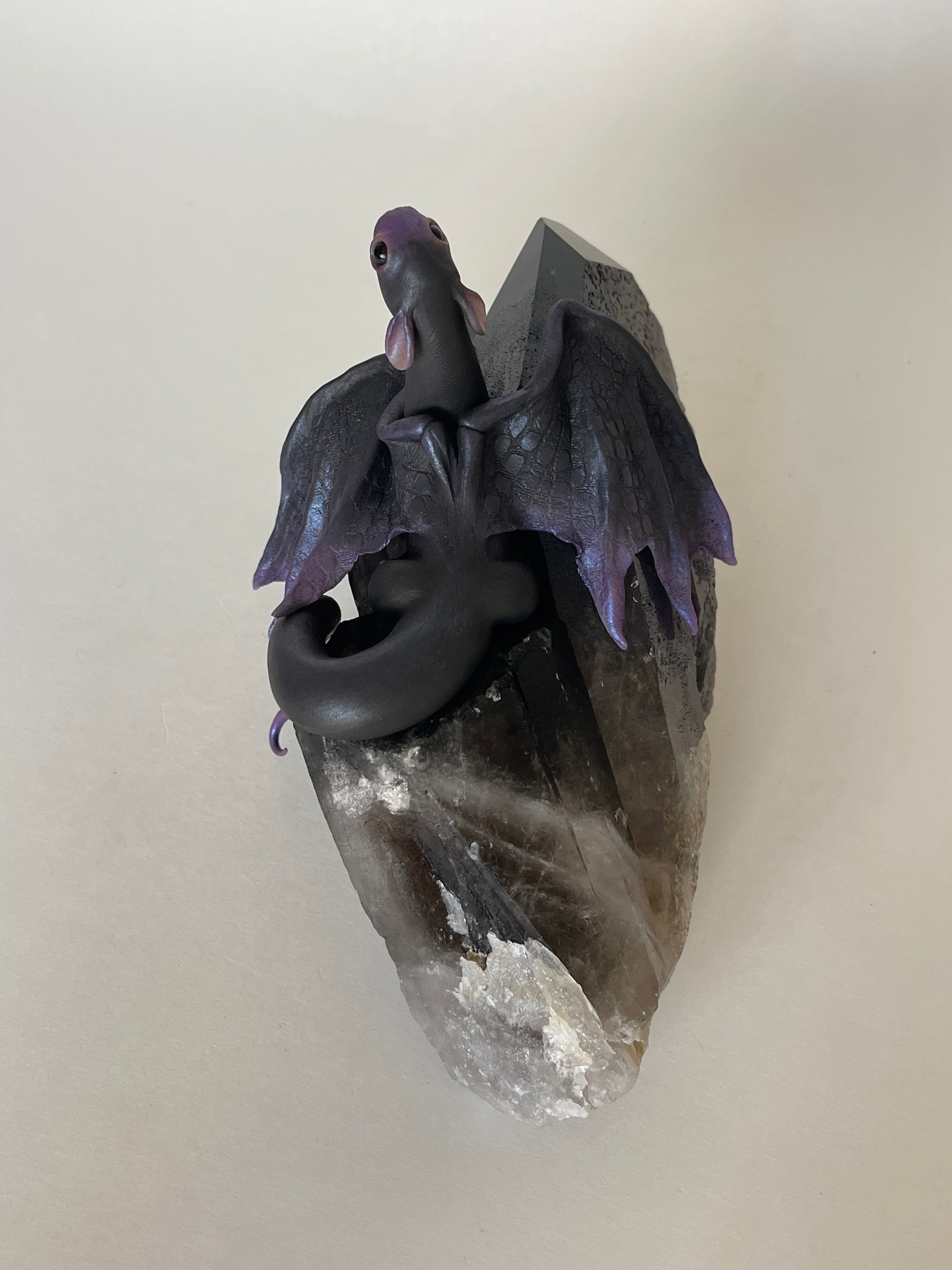 This gorgeous piece is a stand-alone sculpture. The dragon is hand sculpted from clay and painted using natural pigments. It rests on top of a beautifully unique smokey quartz point.