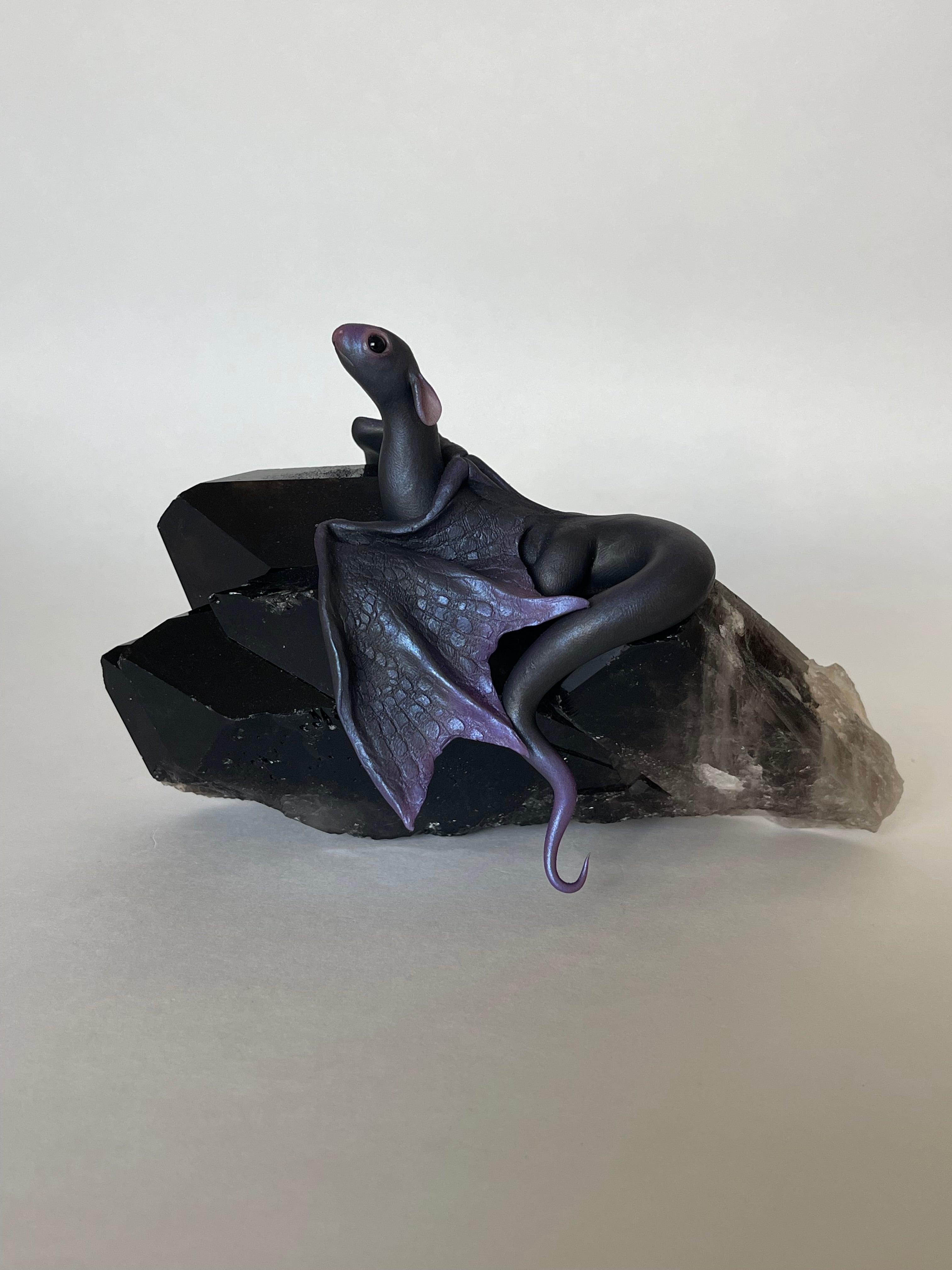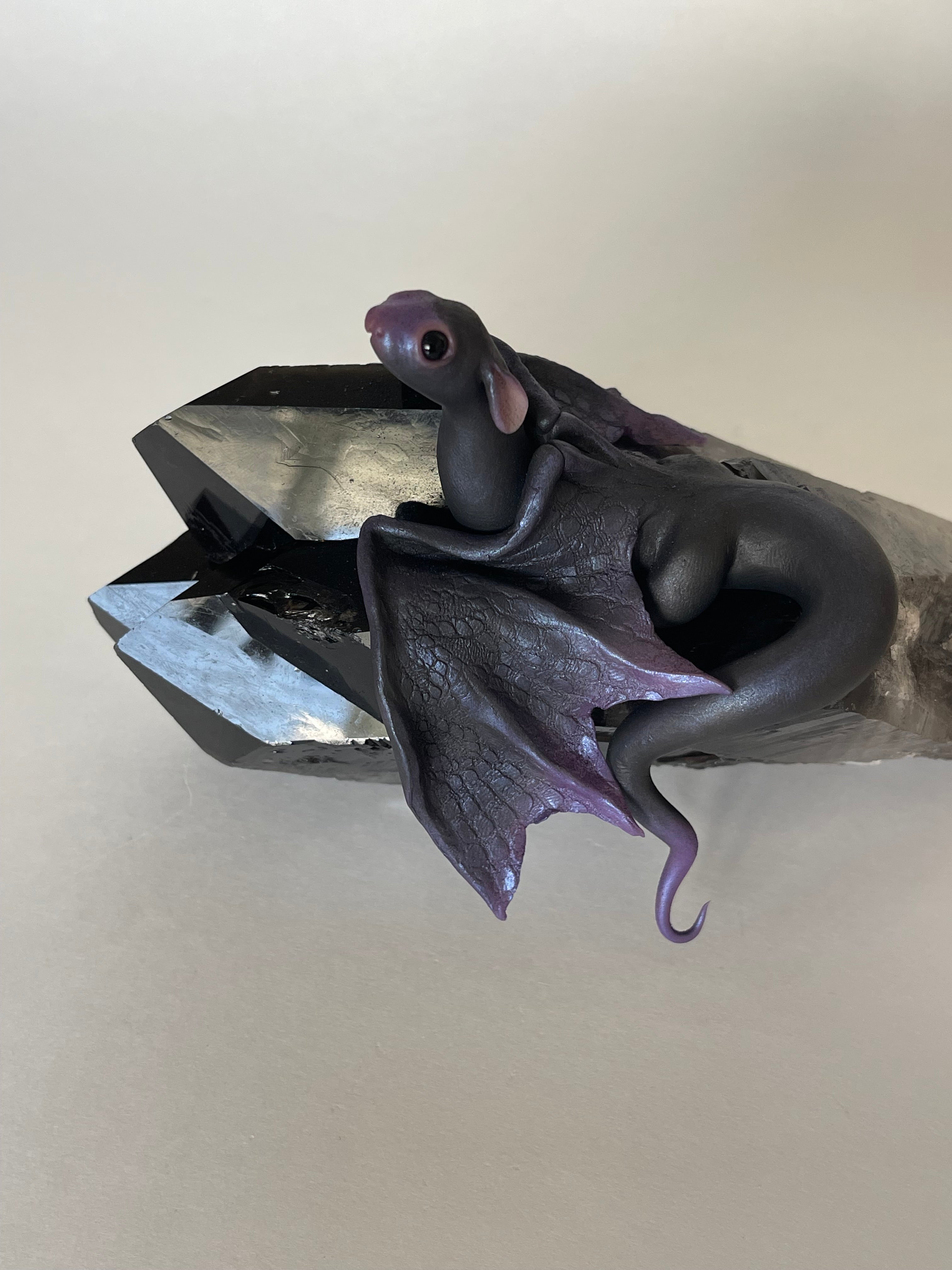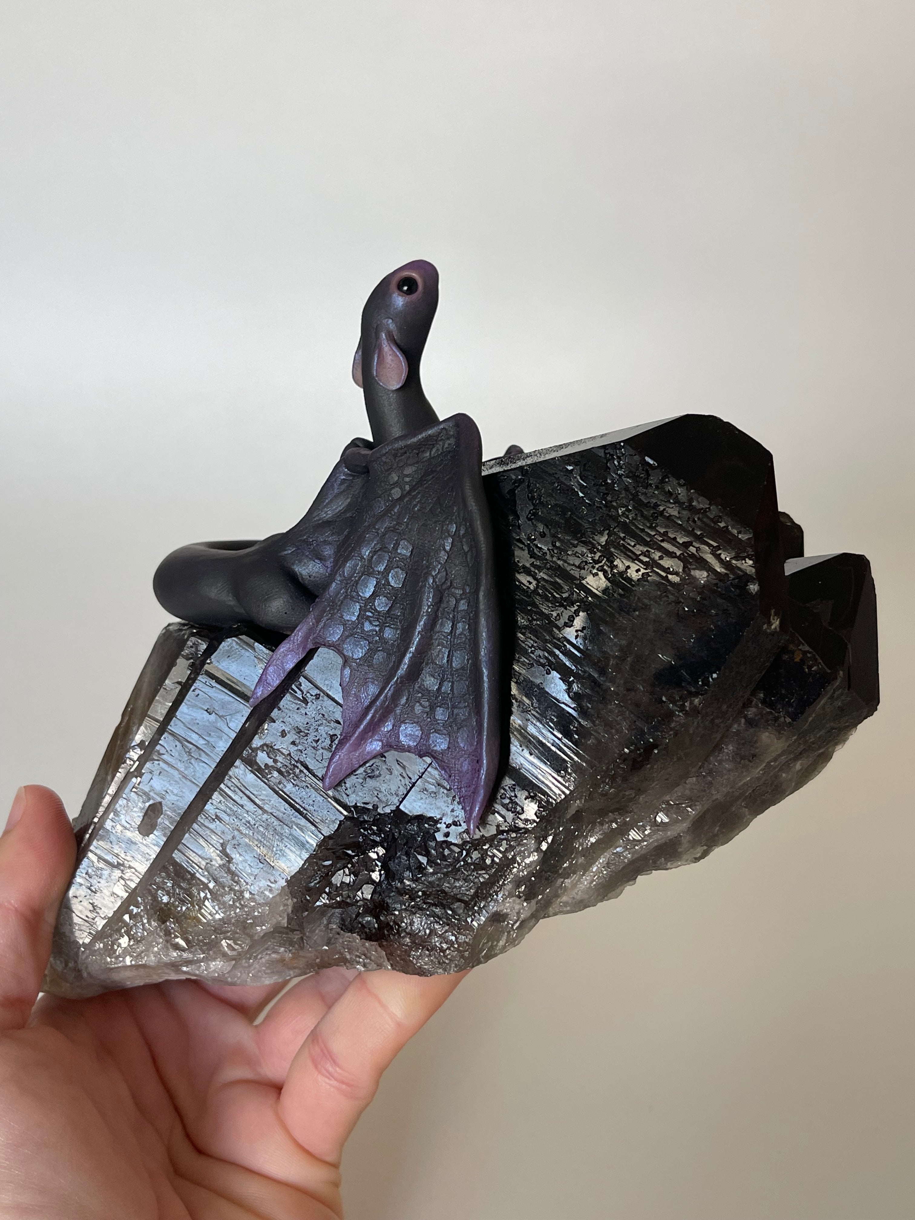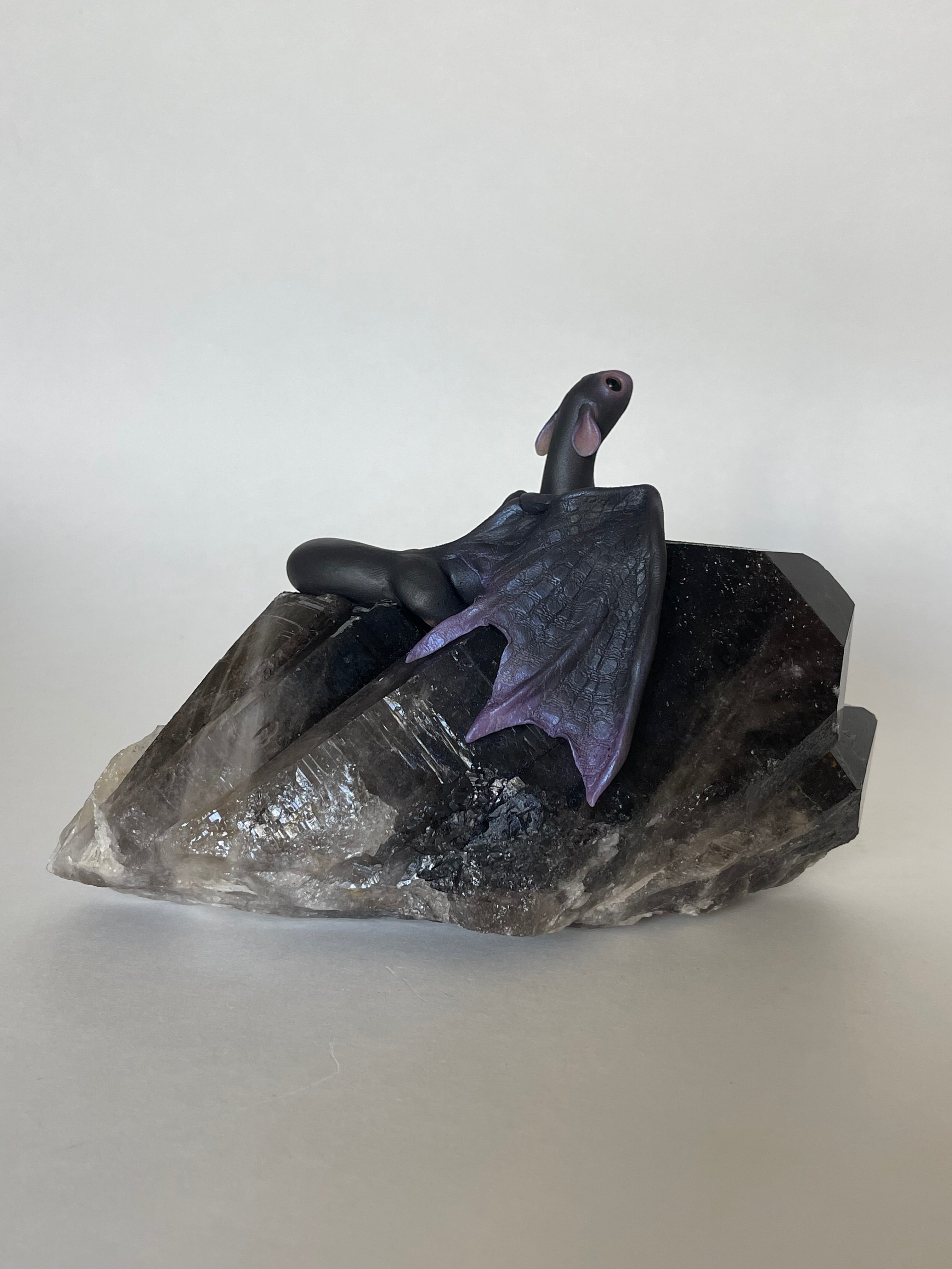 This gorgeous piece is a stand-alone sculpture. The dragon is hand sculpted from clay and painted using natural pigments. It rests on top of a beautifully unique smokey quartz point.