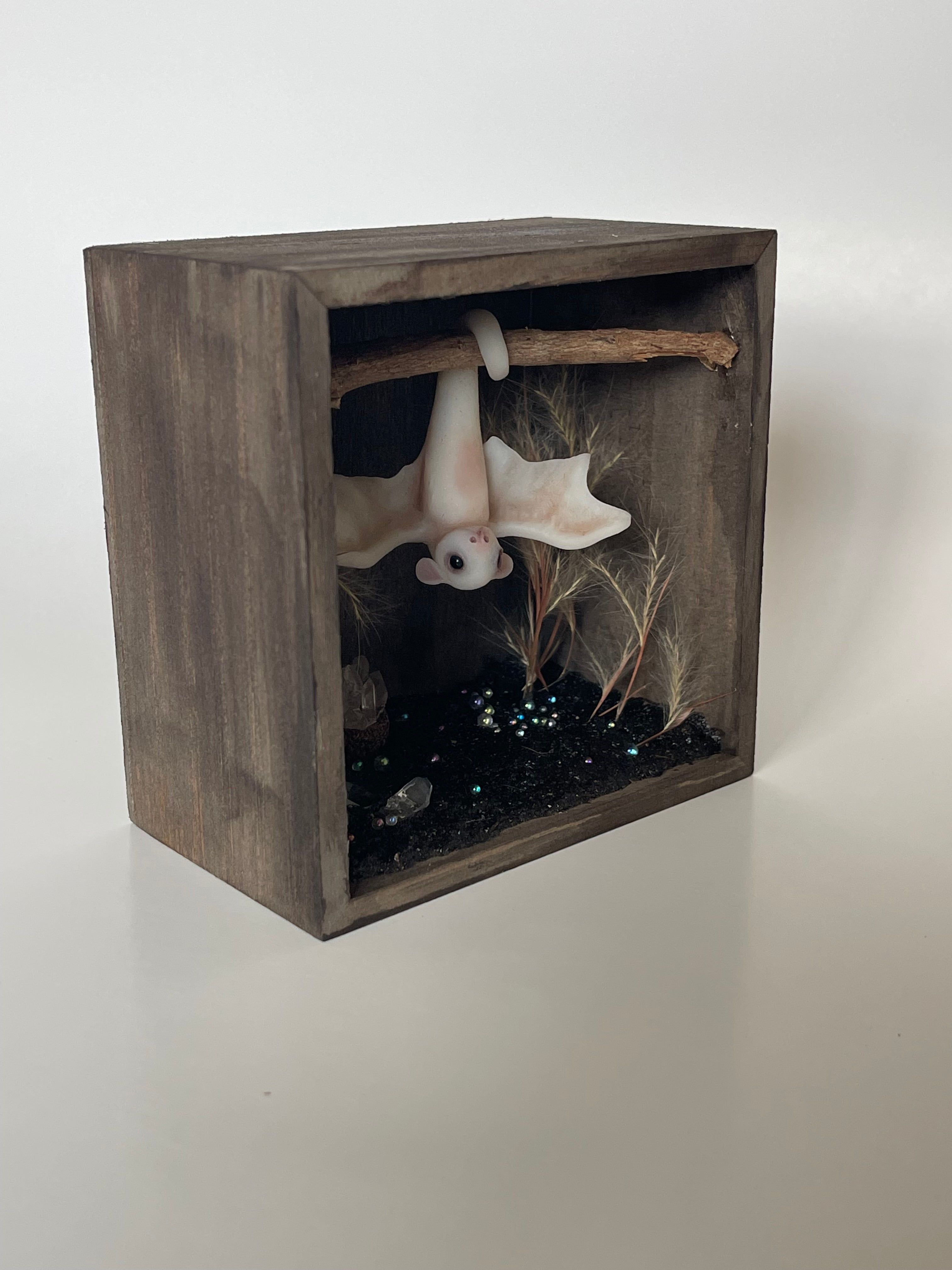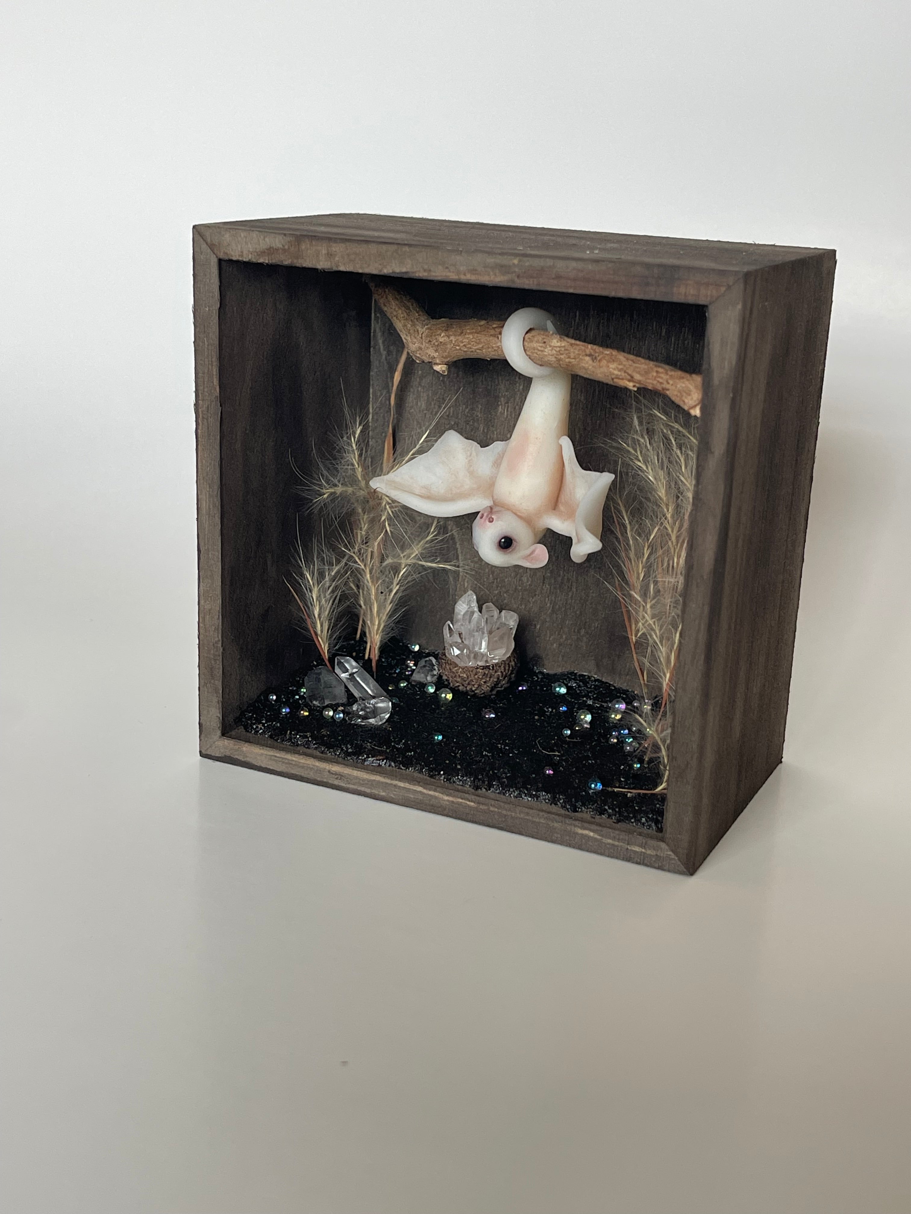 This beautiful little scene is set in a brown shadowbox, filled with grassy flora and crystals. The bat is hand sculpted on a branch.