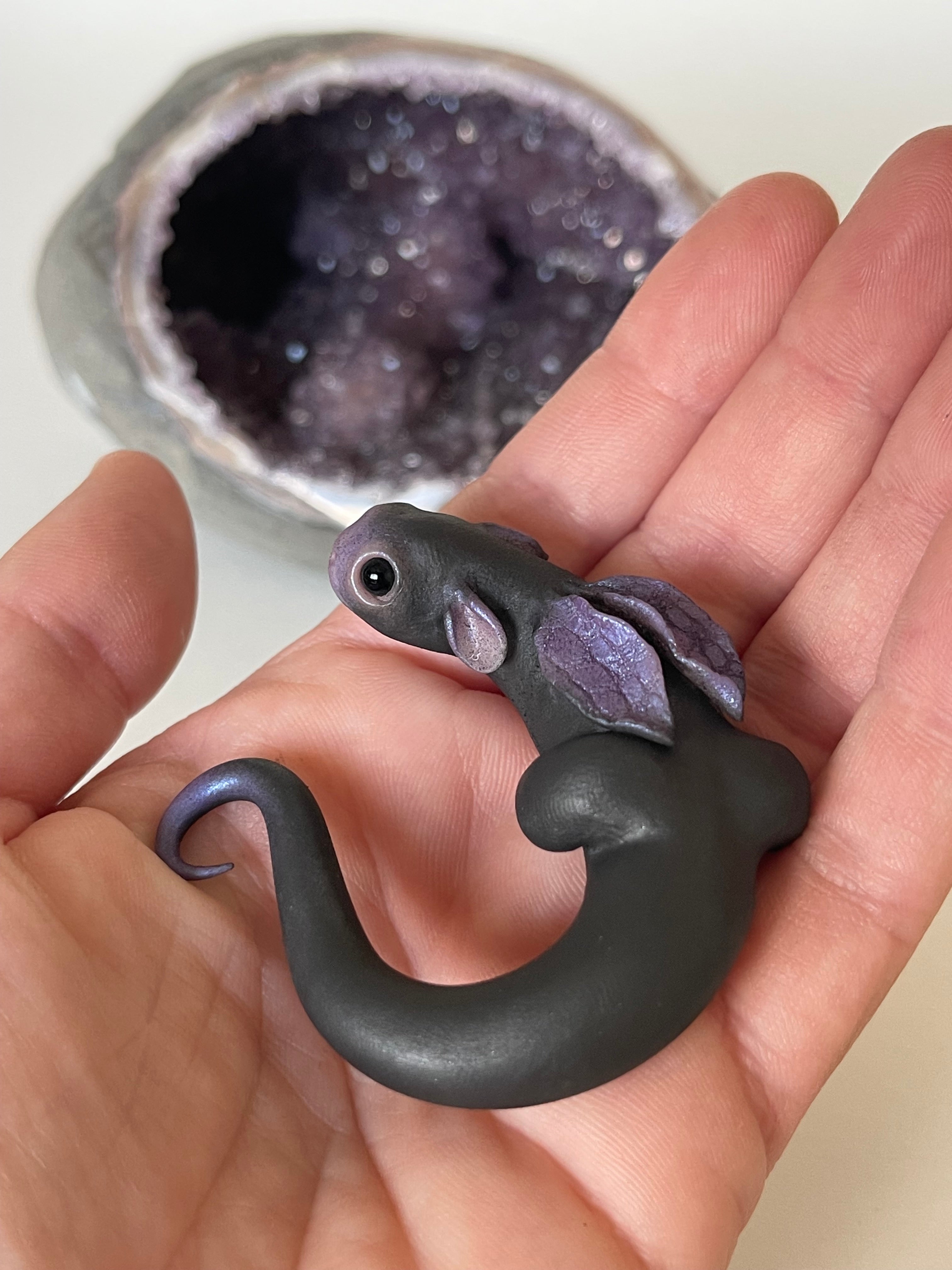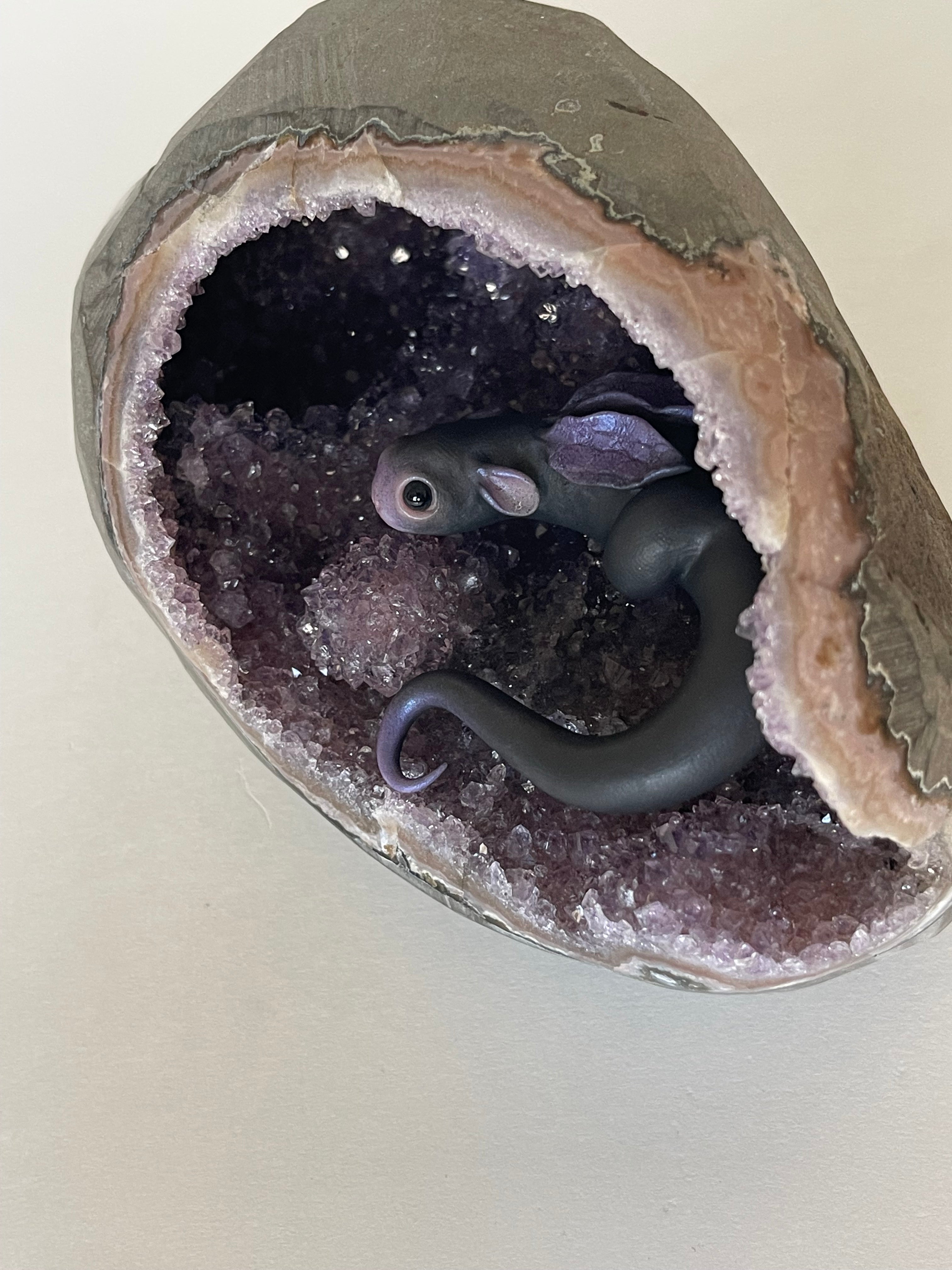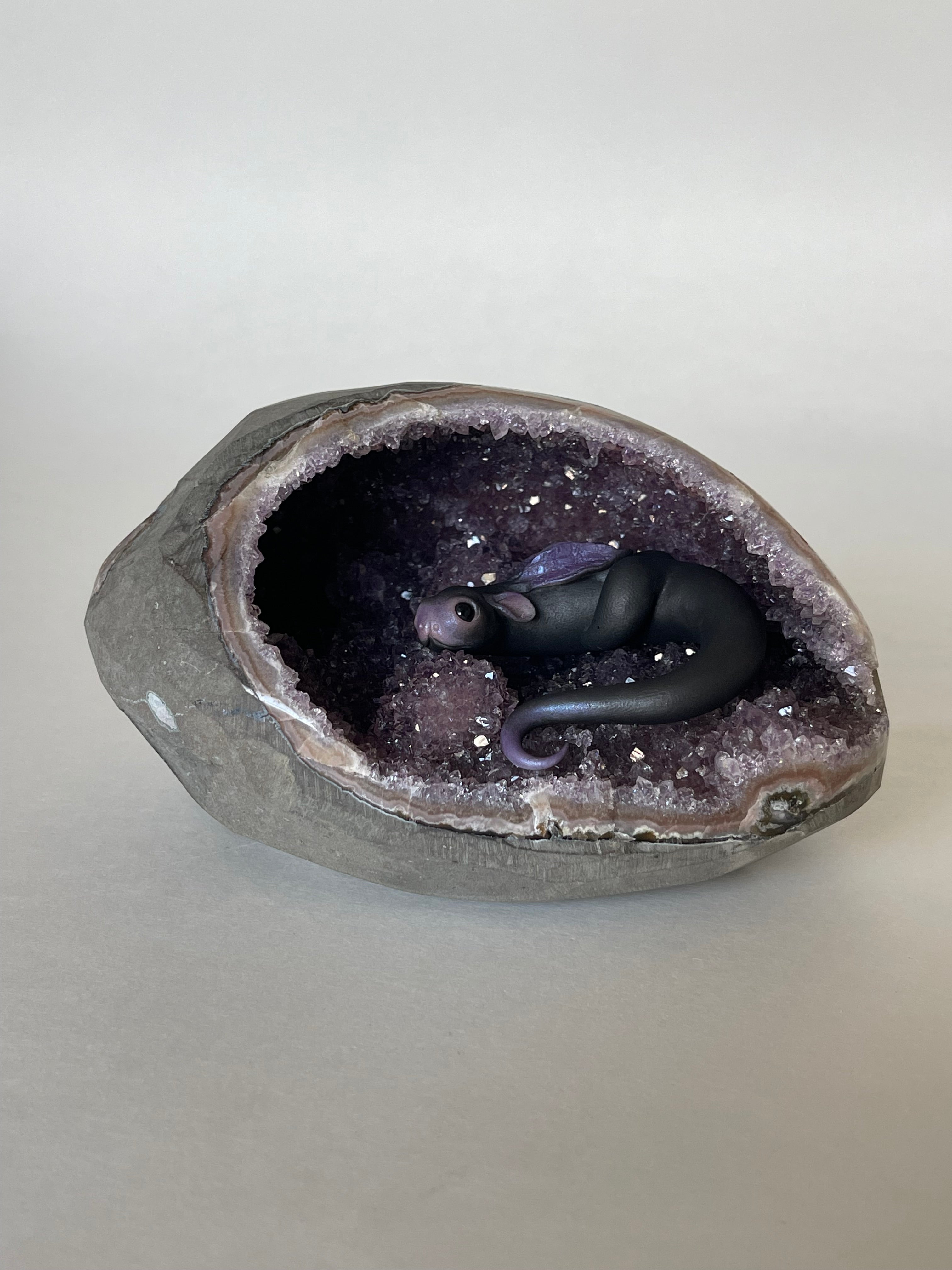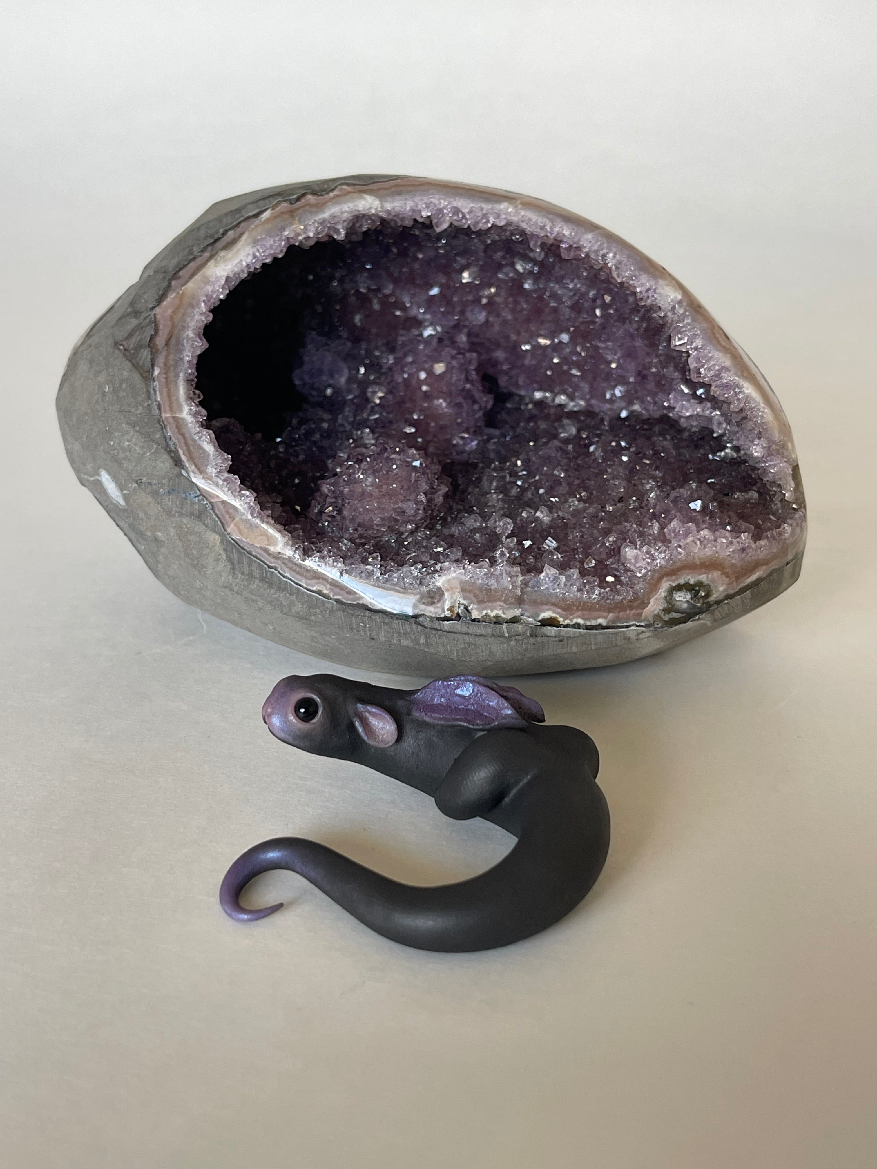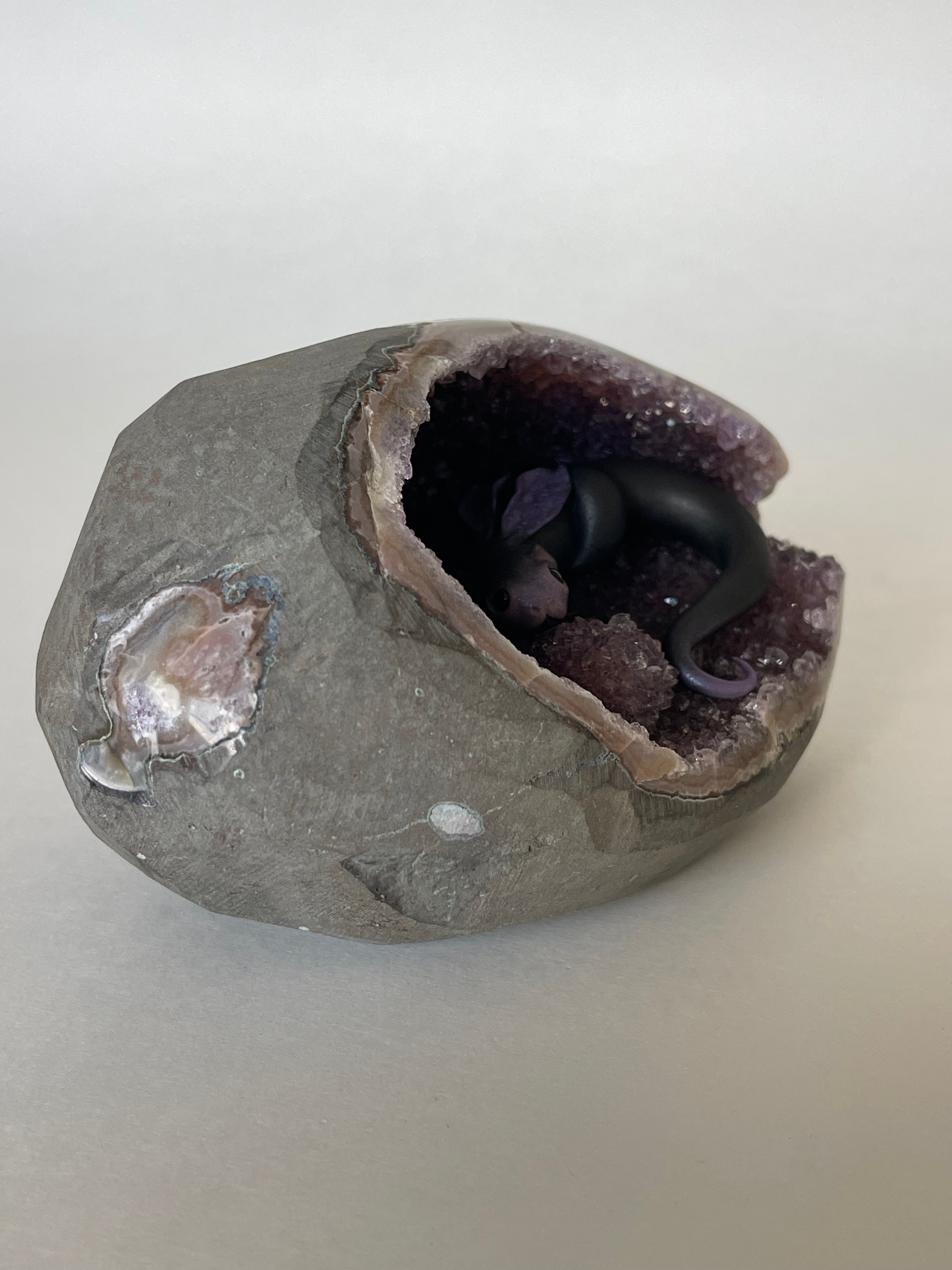 This gorgeous piece is a stand-alone sculpture. The dragon is hand sculpted from clay and painted using natural pigments. It rests in a Uruguay amethyst geode.