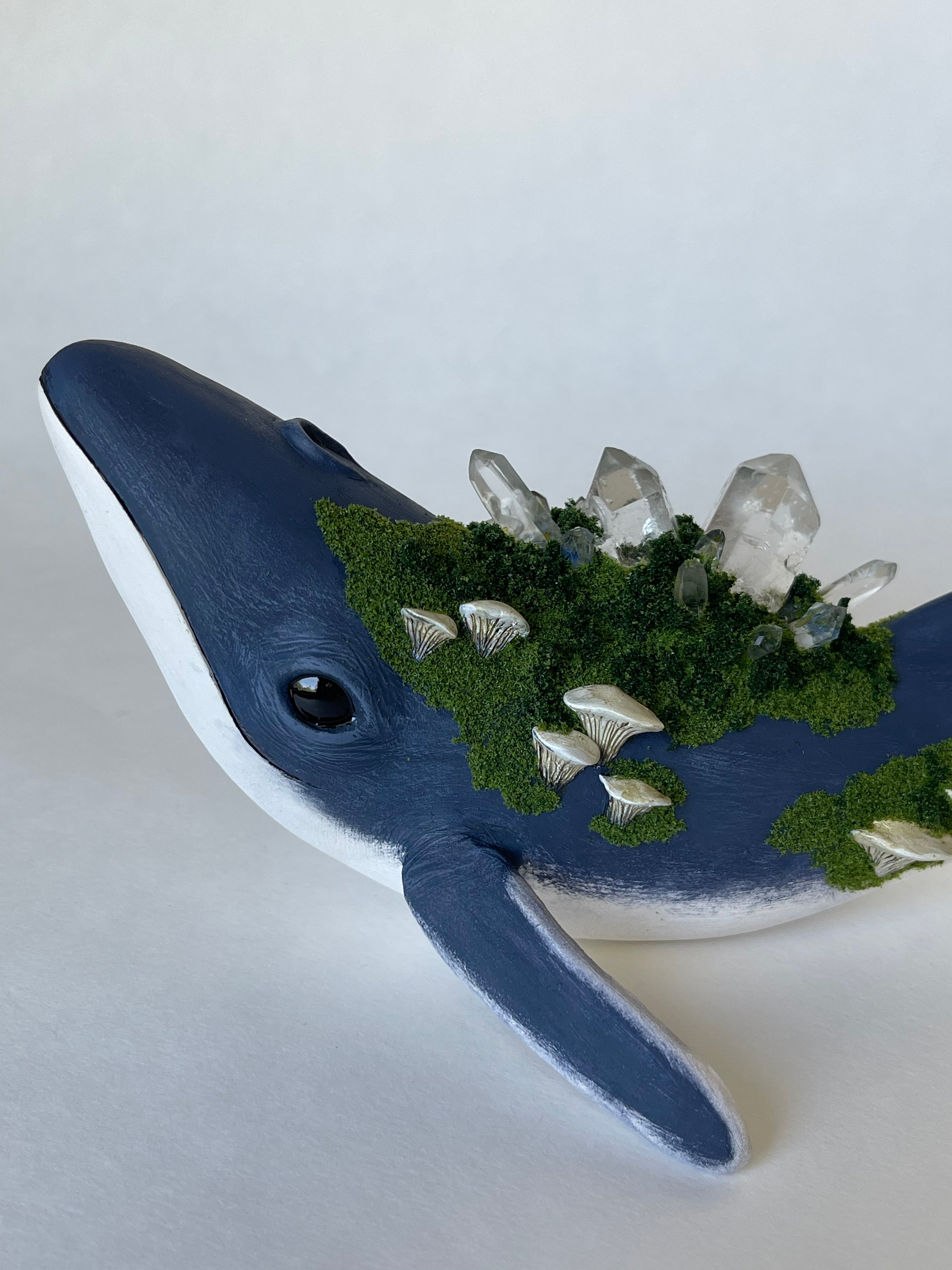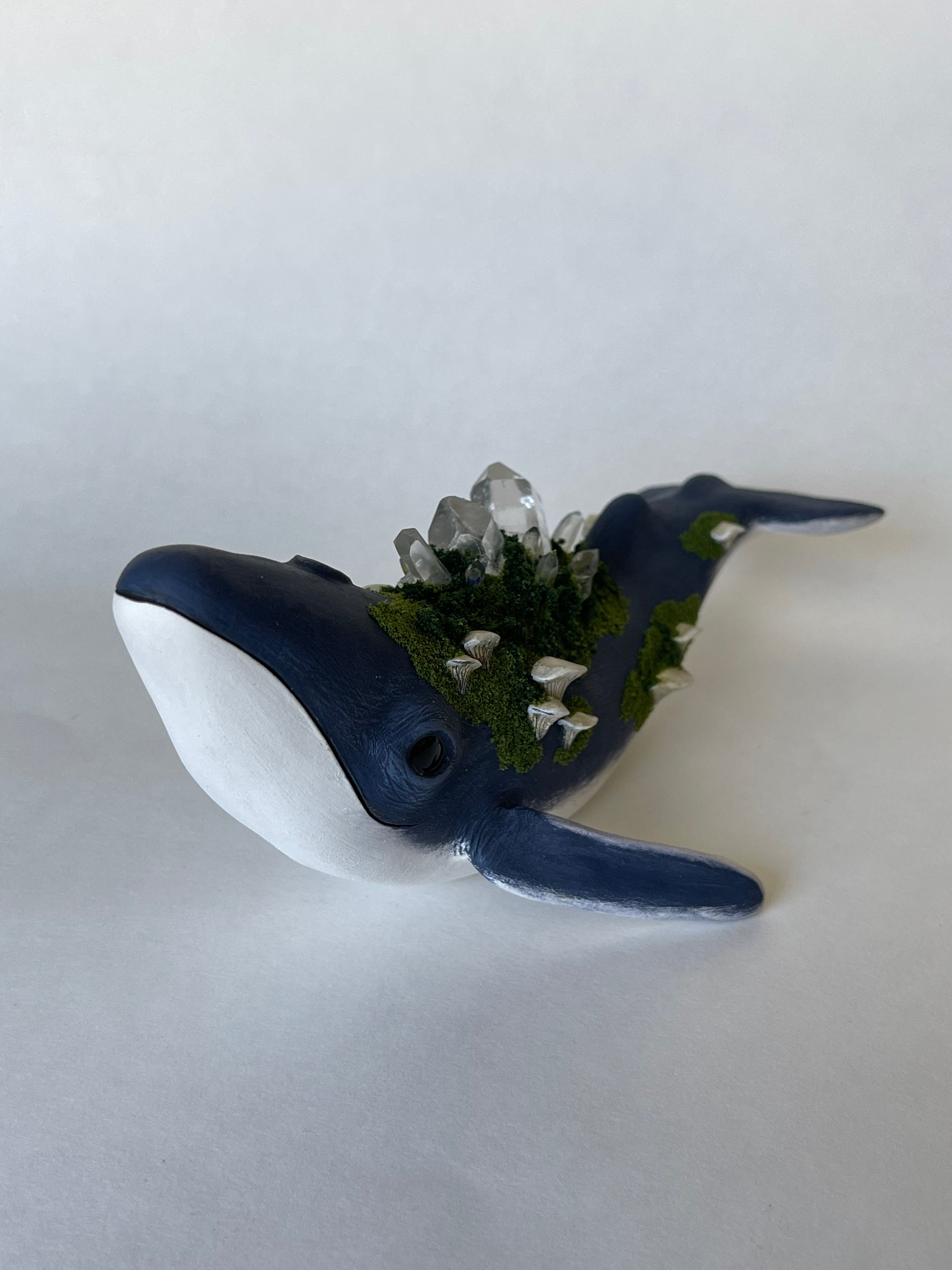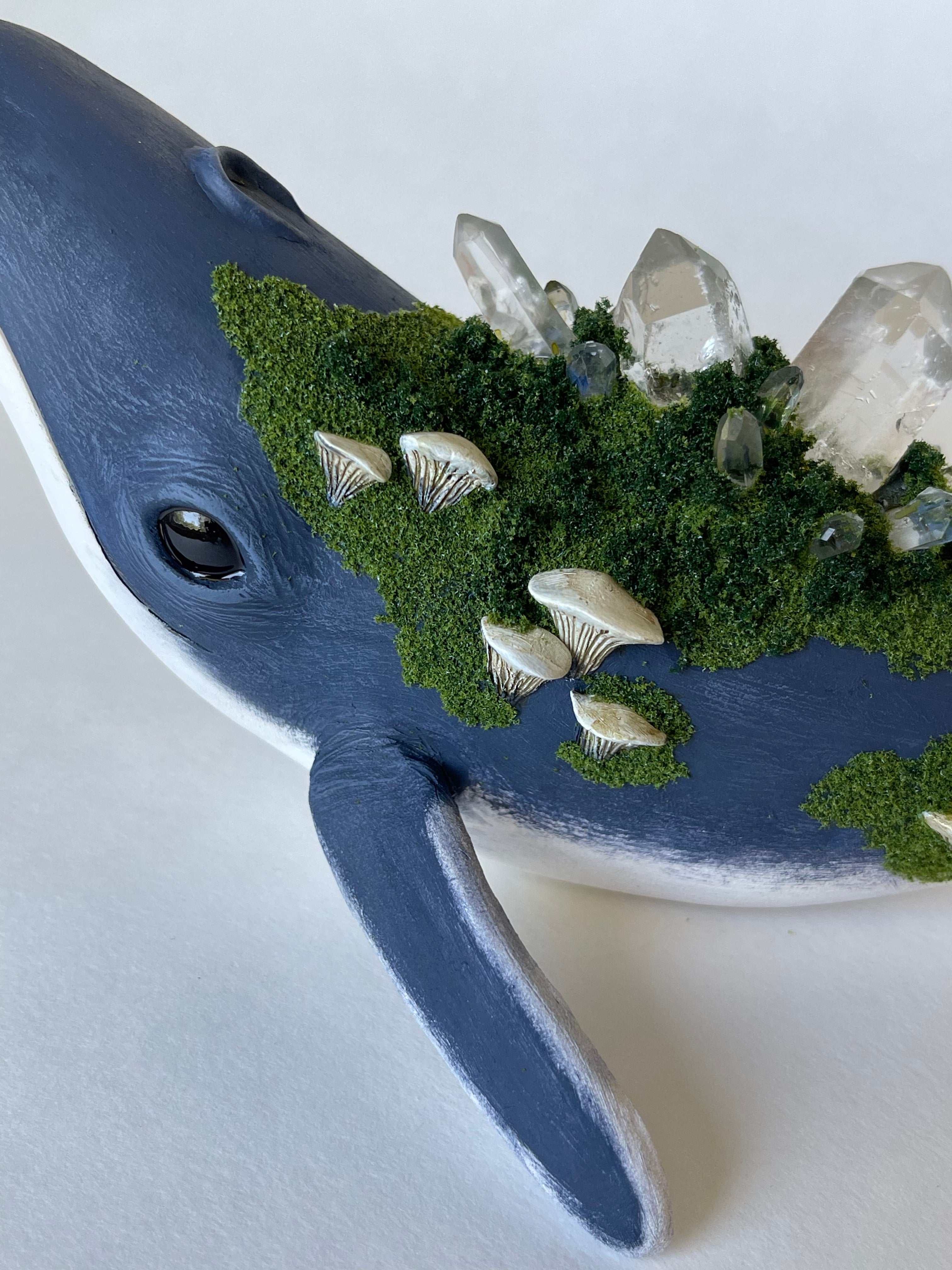 The whales are sculpted and fired in a kiln in my garage. They are then hand painted. Crystals are set on the whales back. Small mushrooms are sculpted and securely set among mossy texture.
