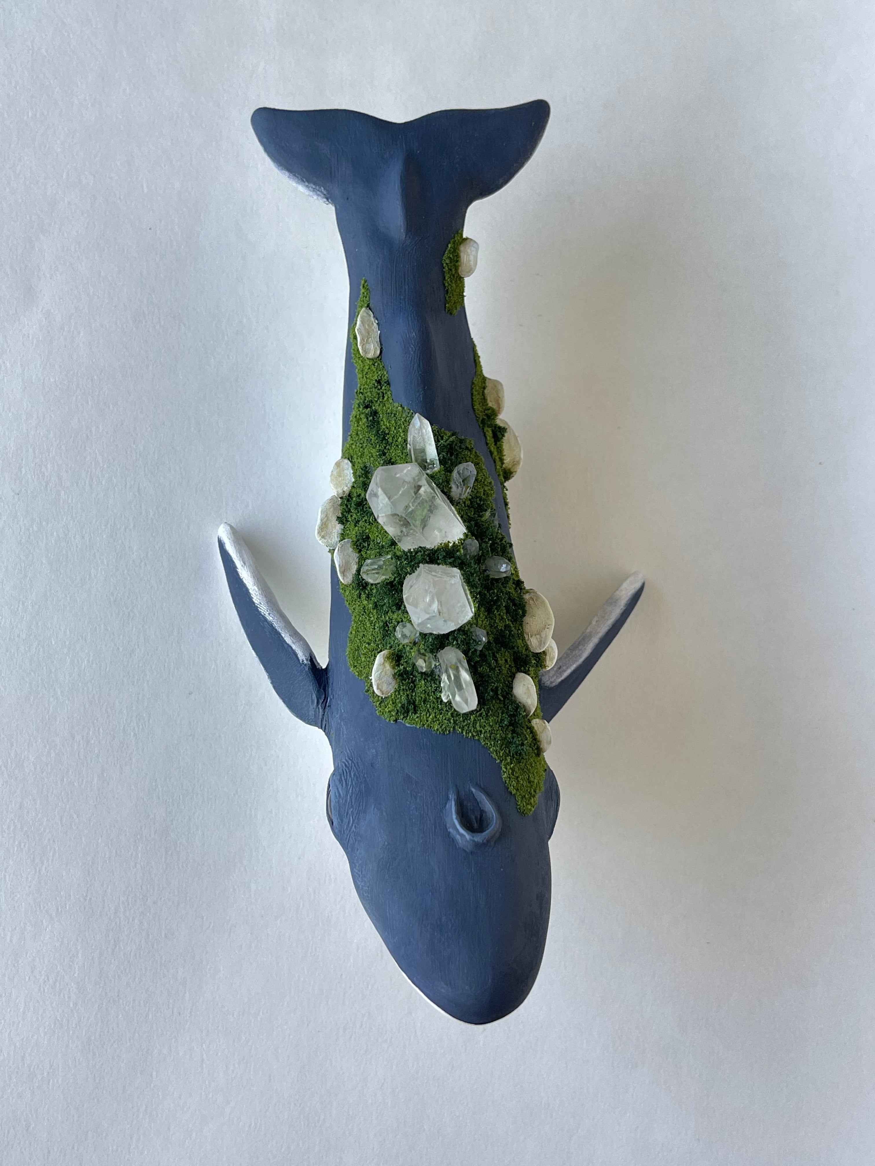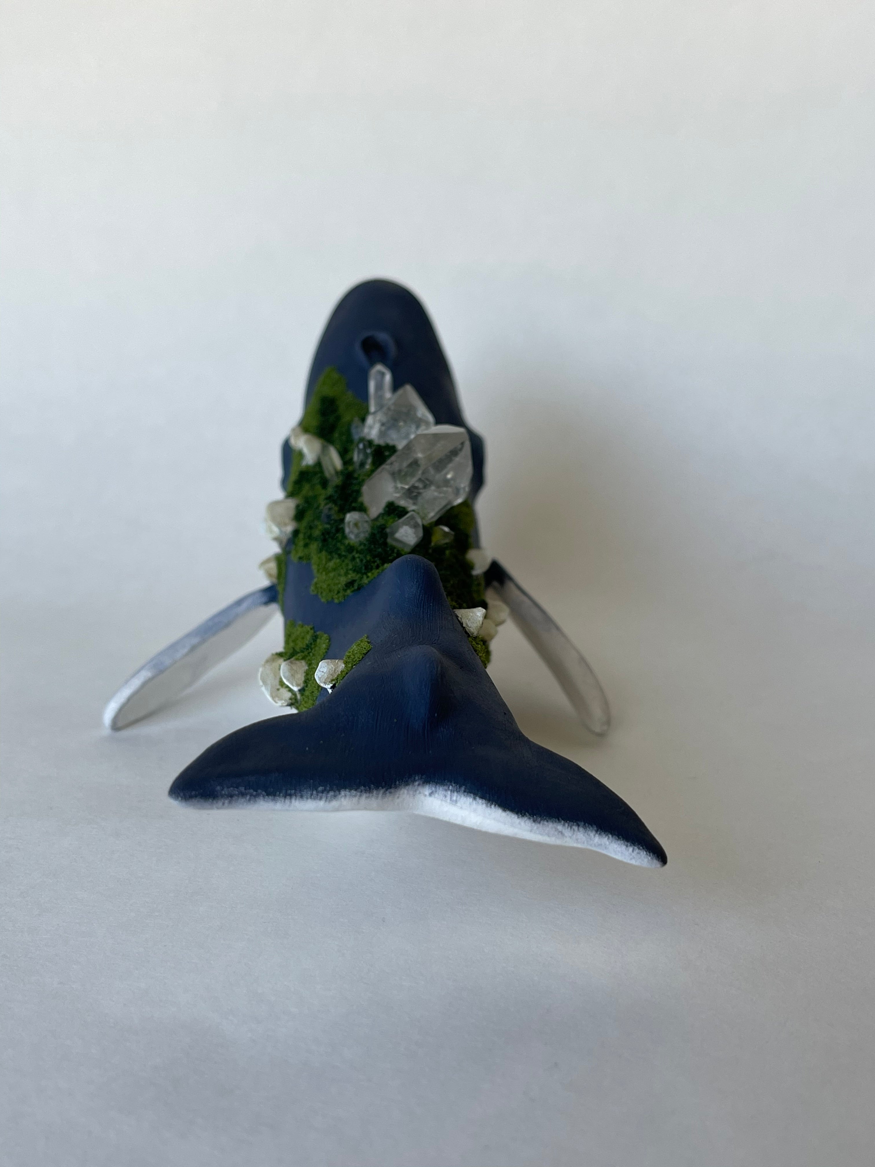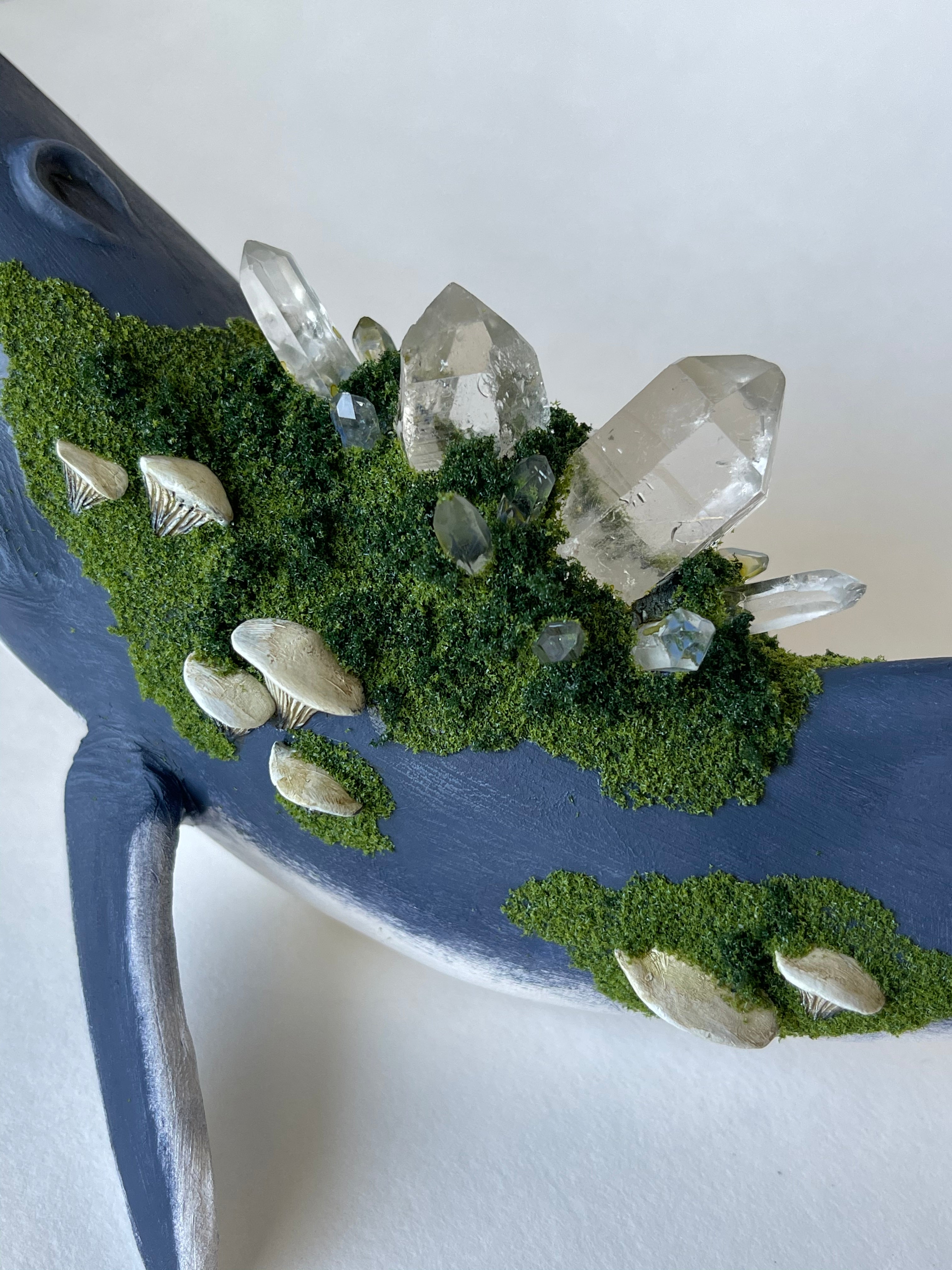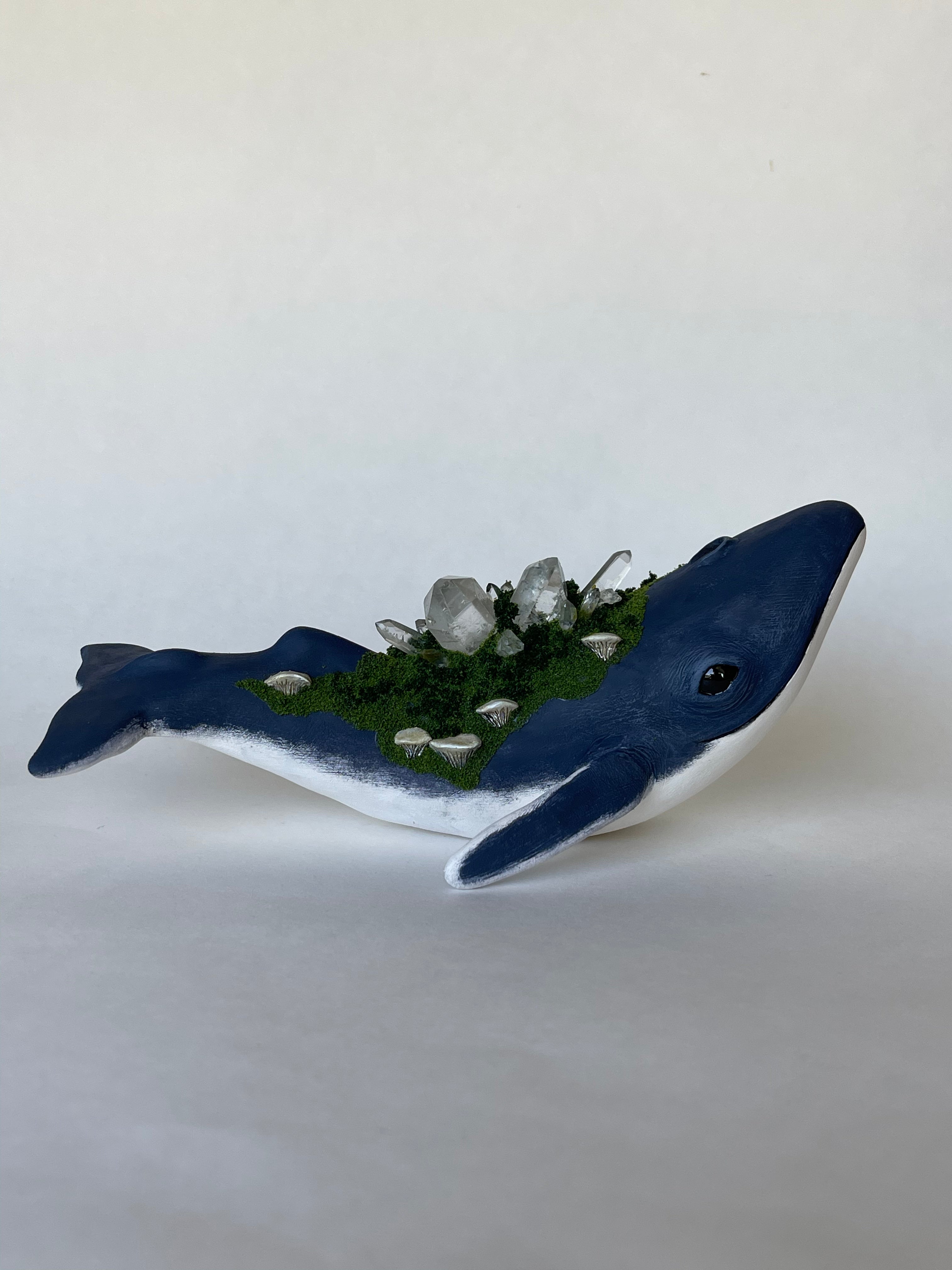The whales are sculpted and fired in a kiln in my garage. They are then hand painted. Crystals are set on the whales back. Small mushrooms are sculpted and securely set among mossy texture.