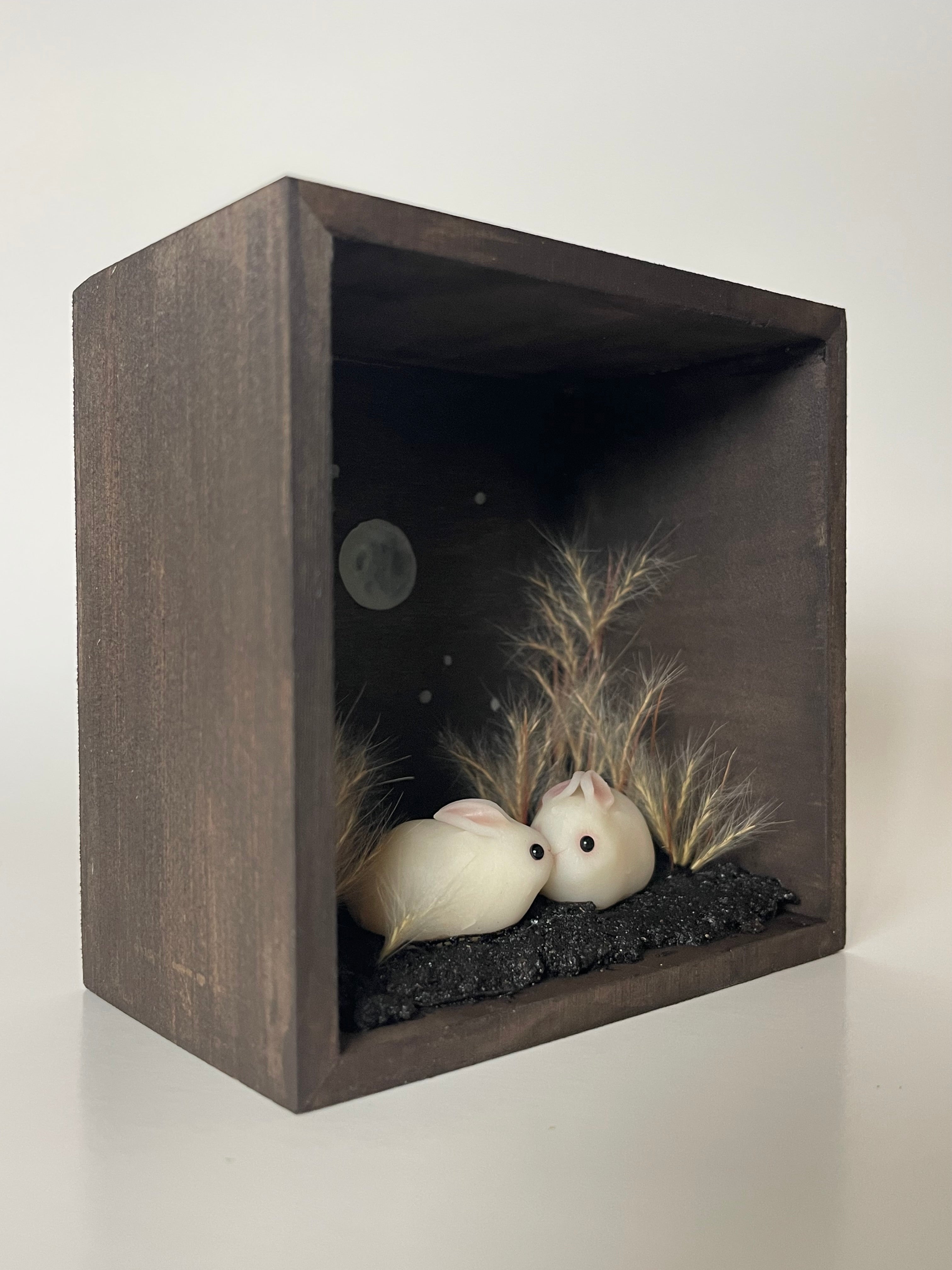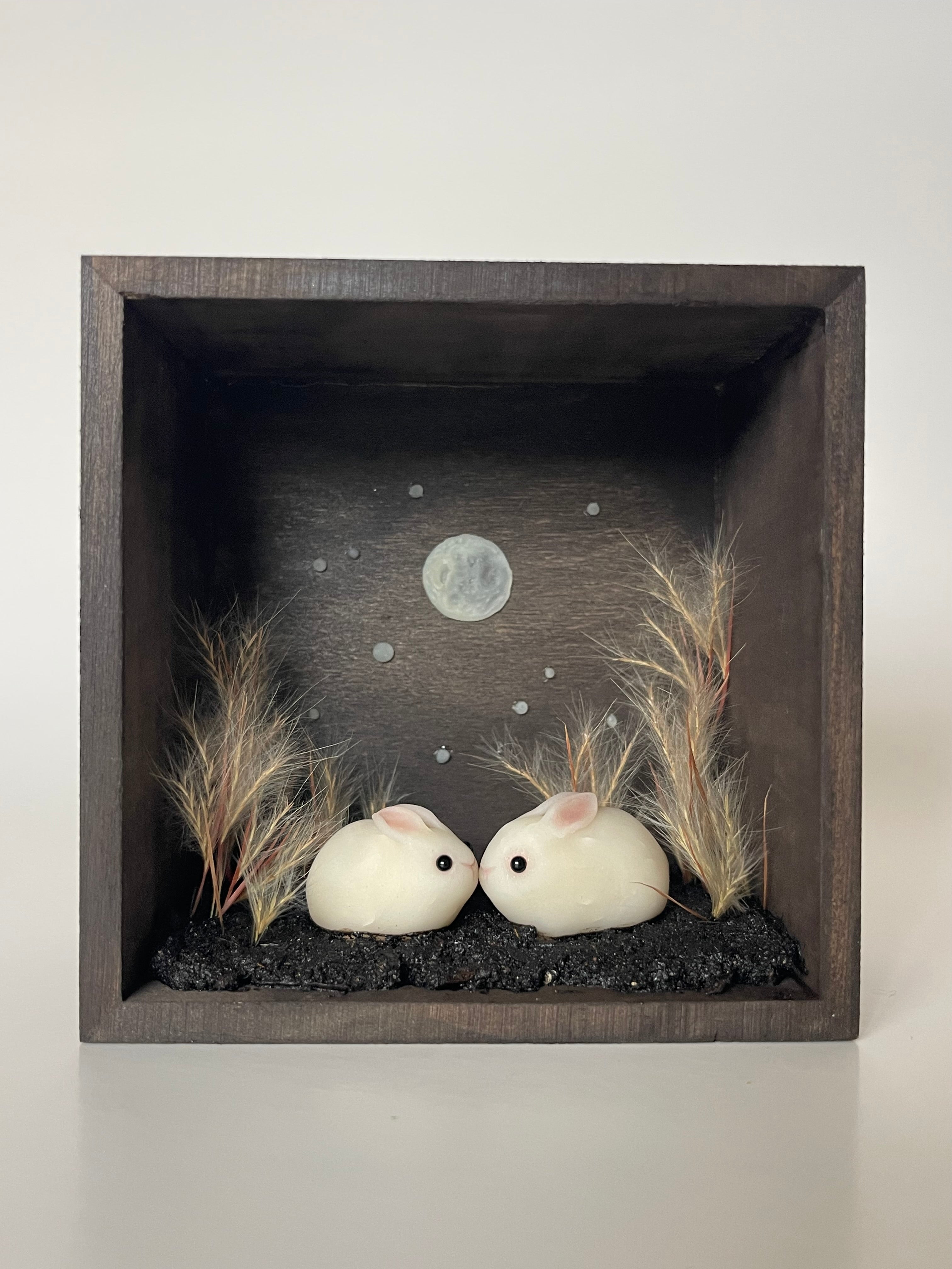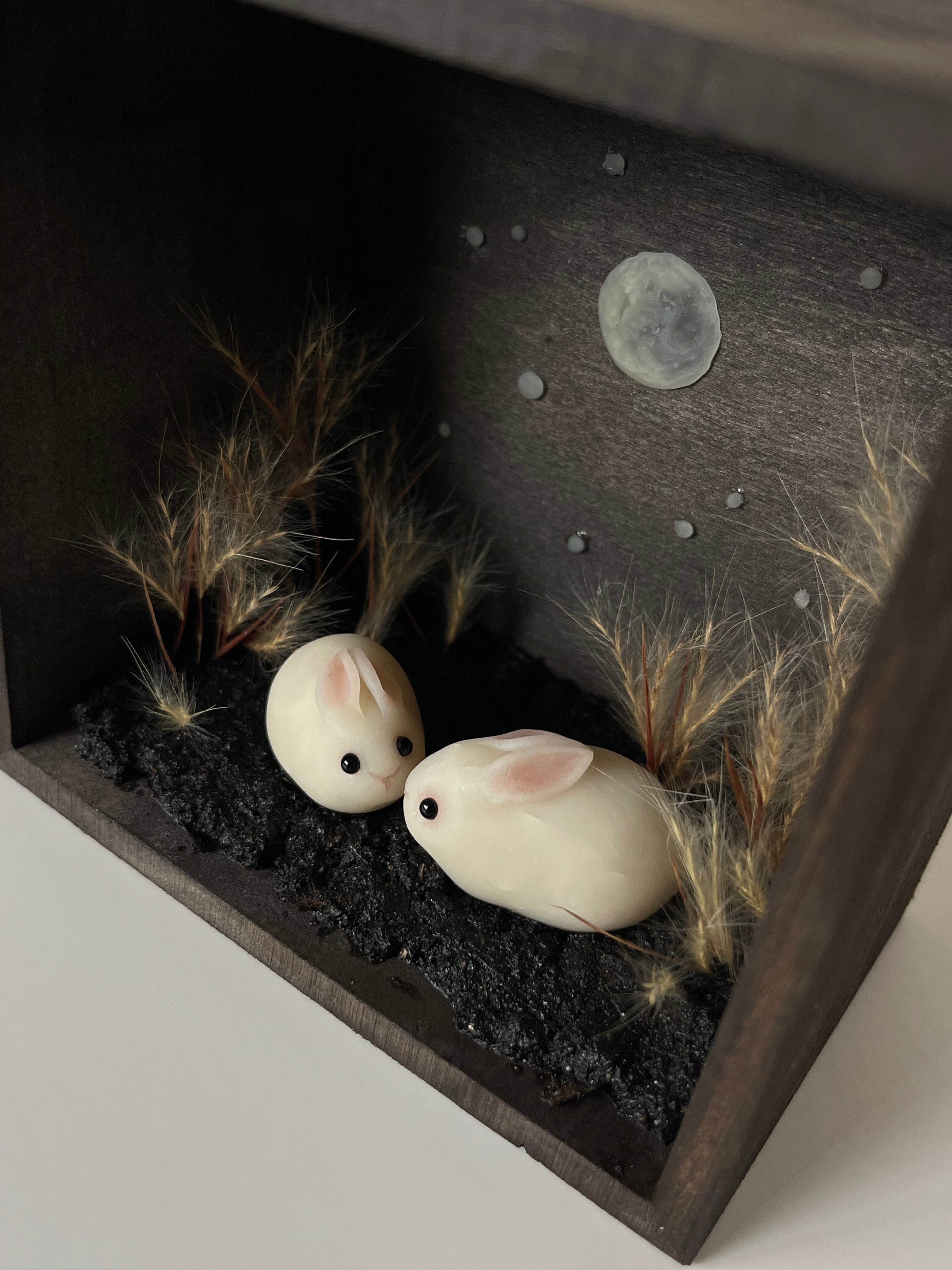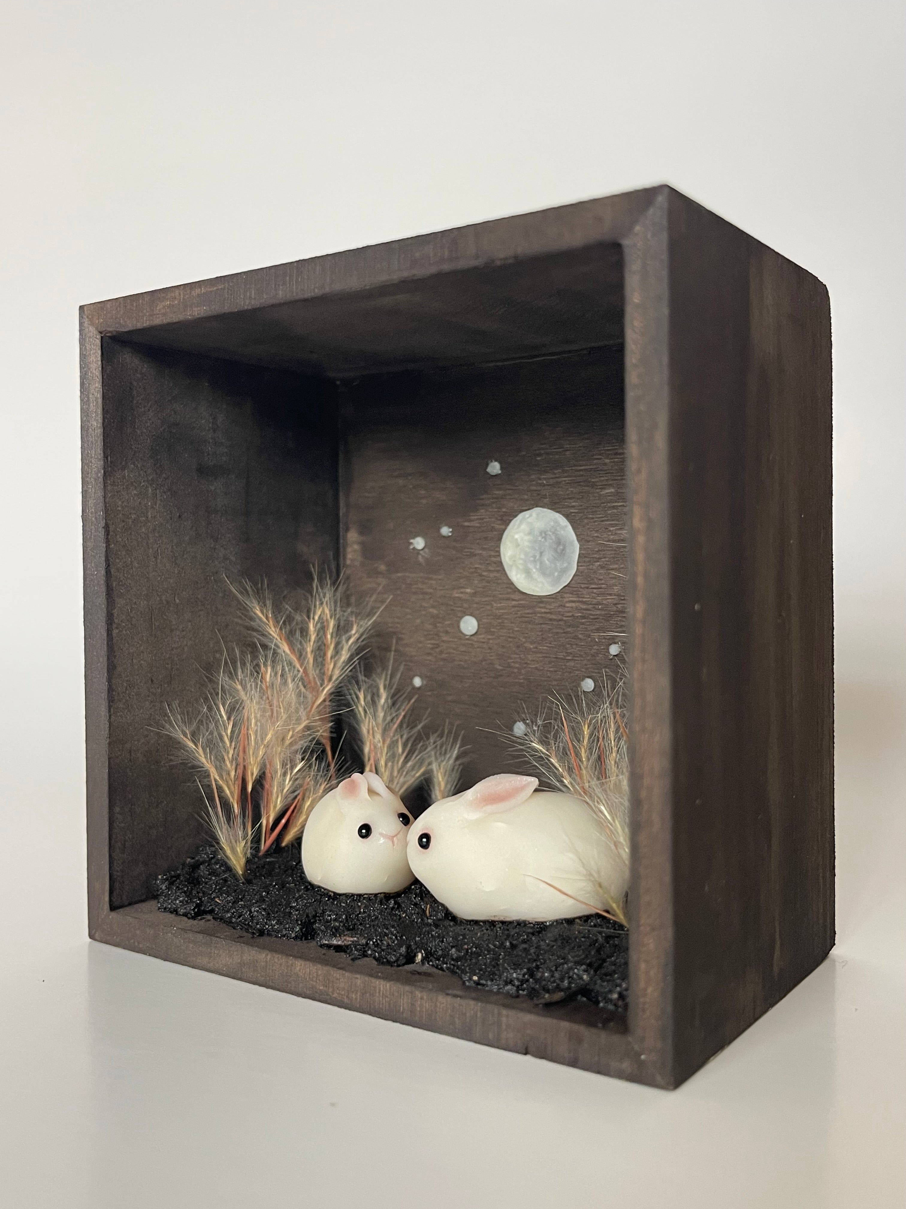 This beautiful little scene is set in a brown shadowbox, filled with grassy flora and a glowing moon and star scene. The bunny is hand sculpted and painted with natural pigments.