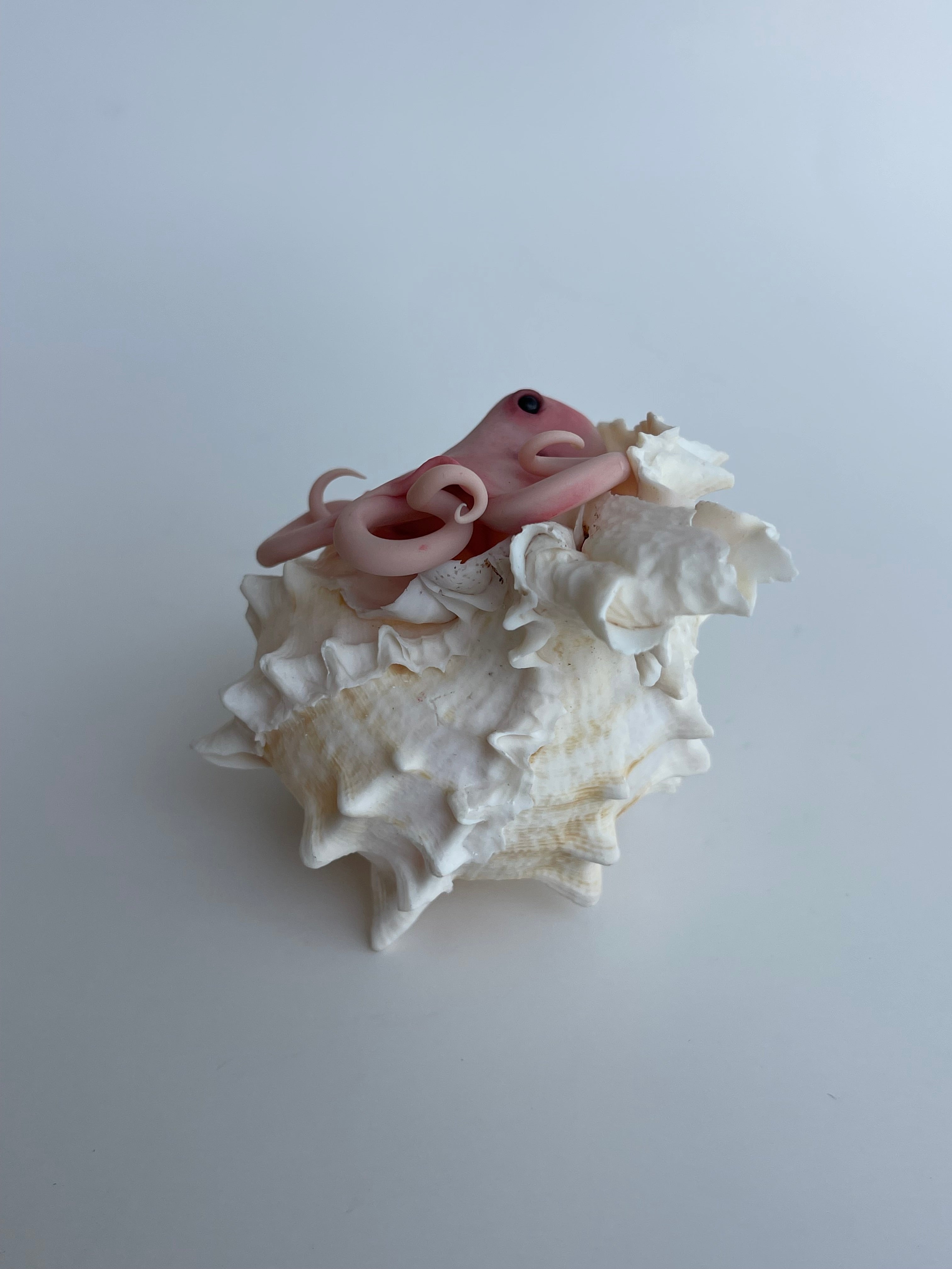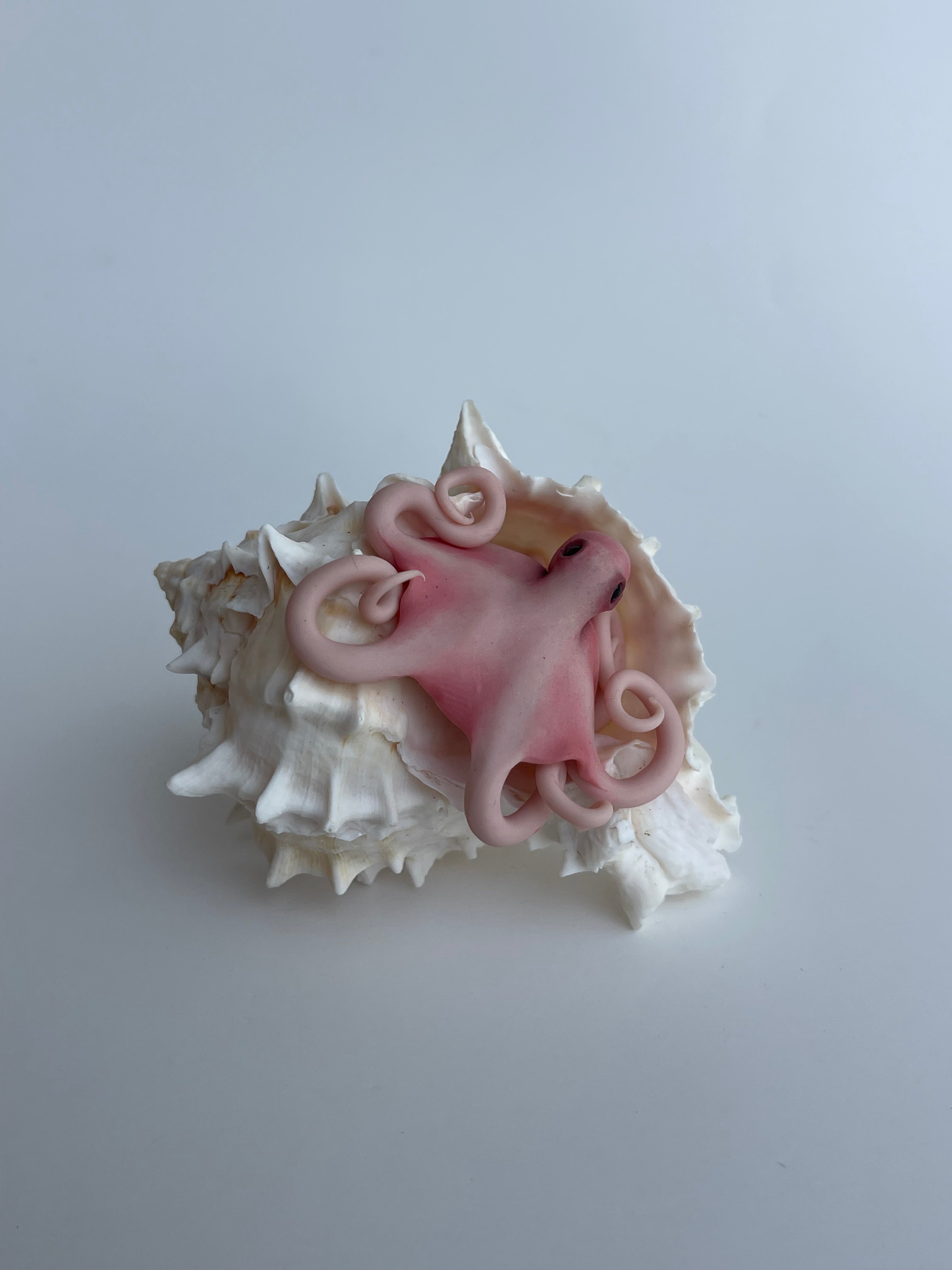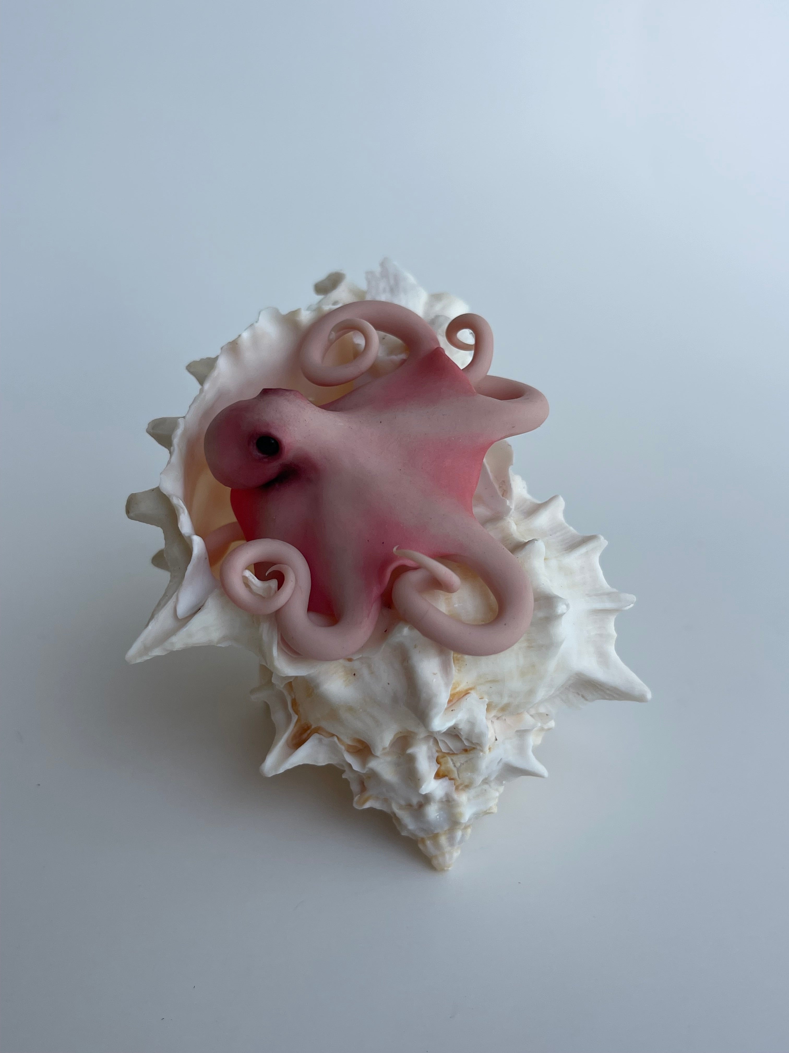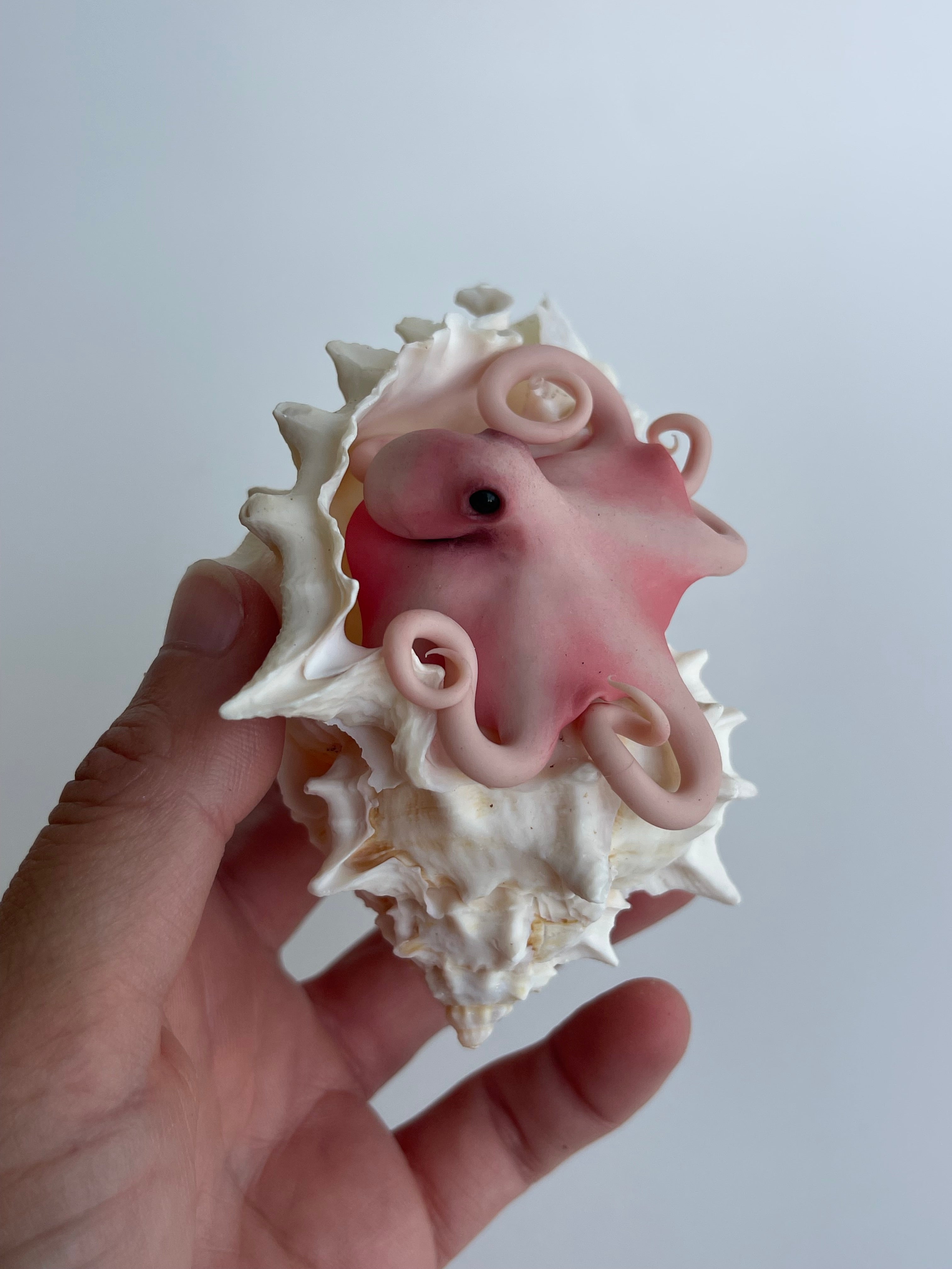 This gorgeous piece is a small, stand-alone sculpture. The octopus is hand sculpted from clay and painted using natural pigments. It resides in a beautiful murex shell.