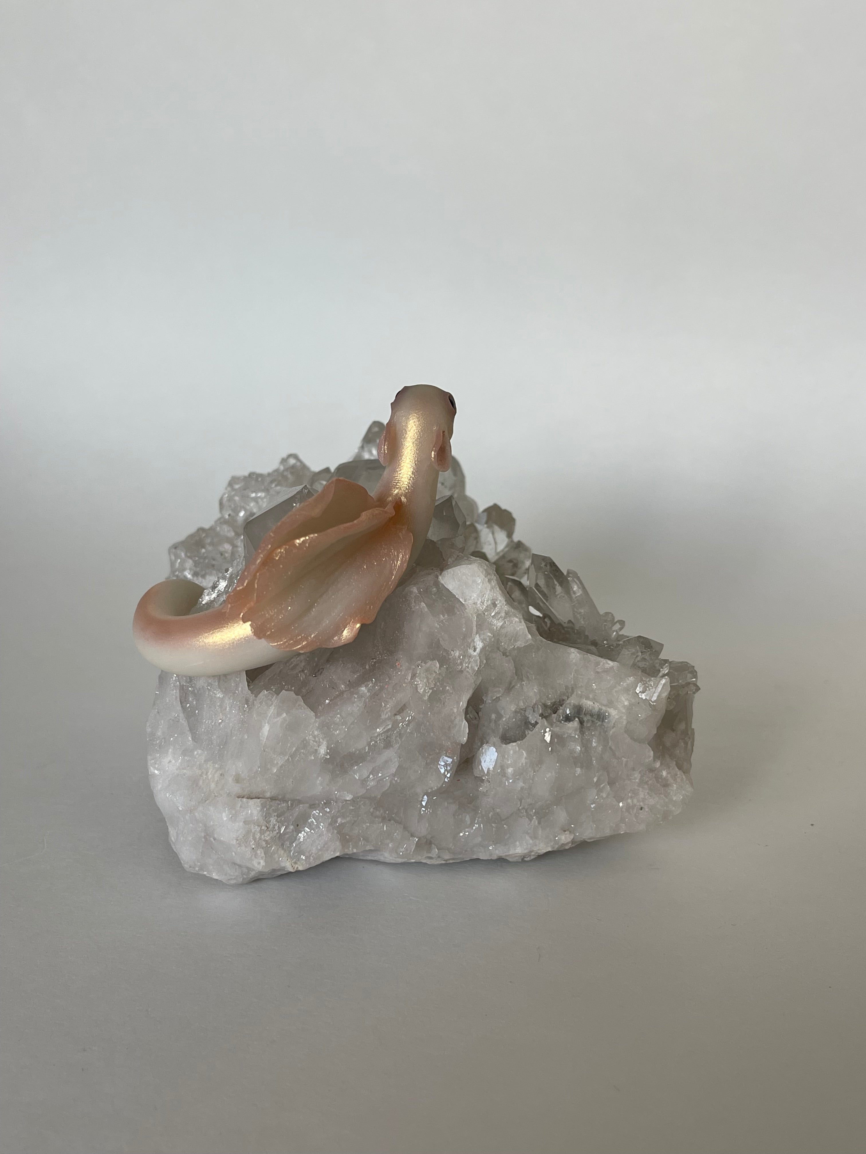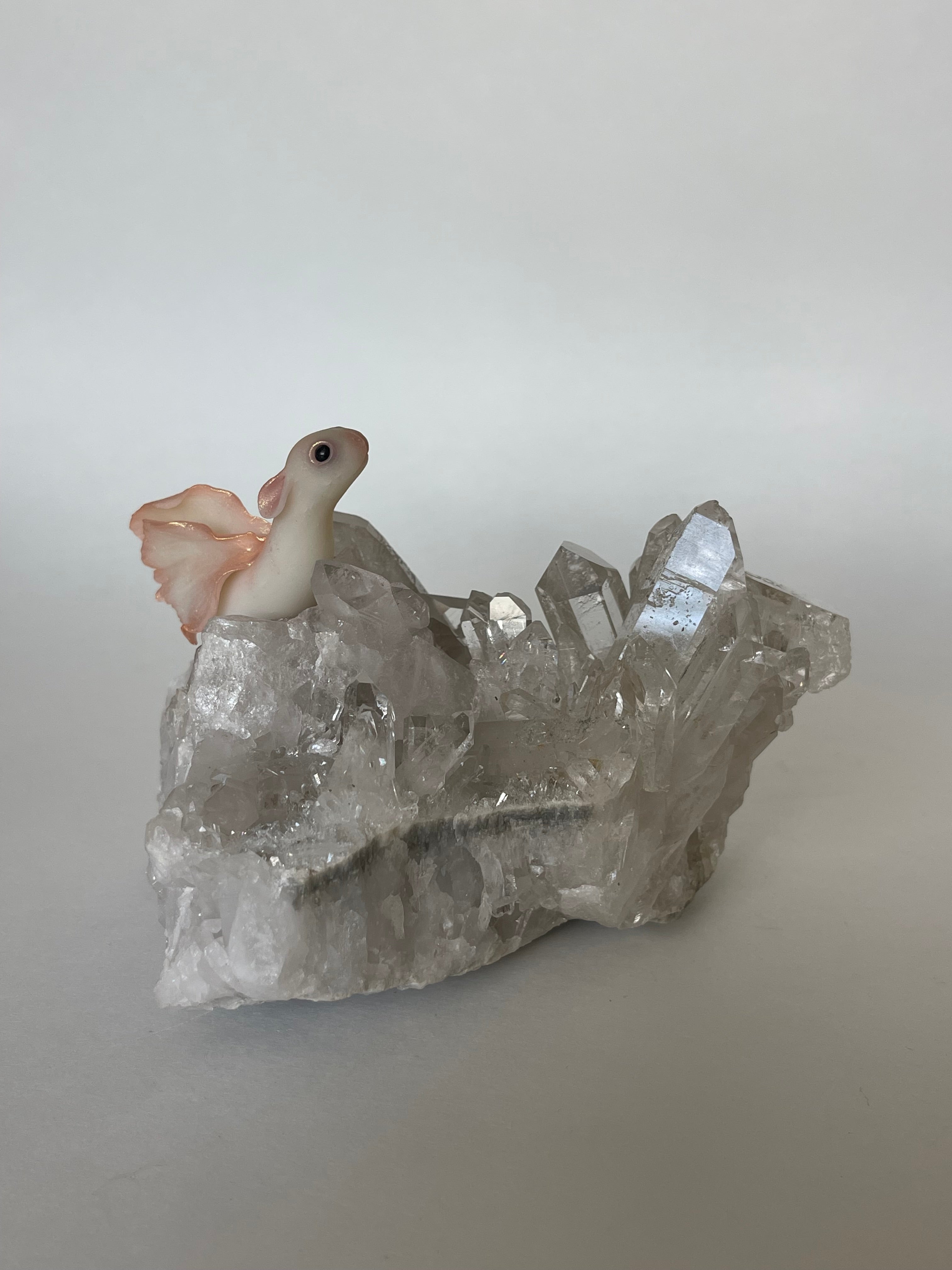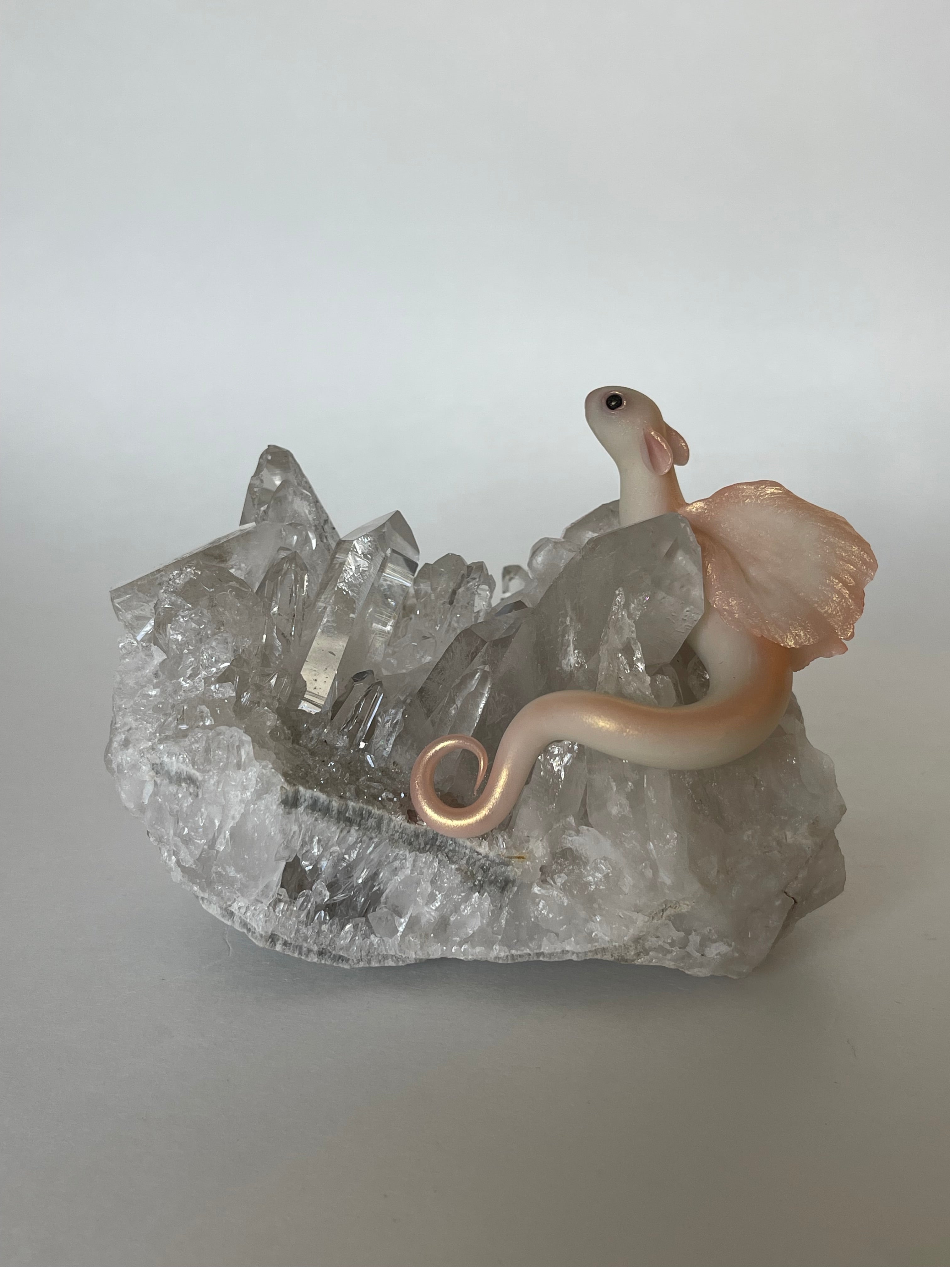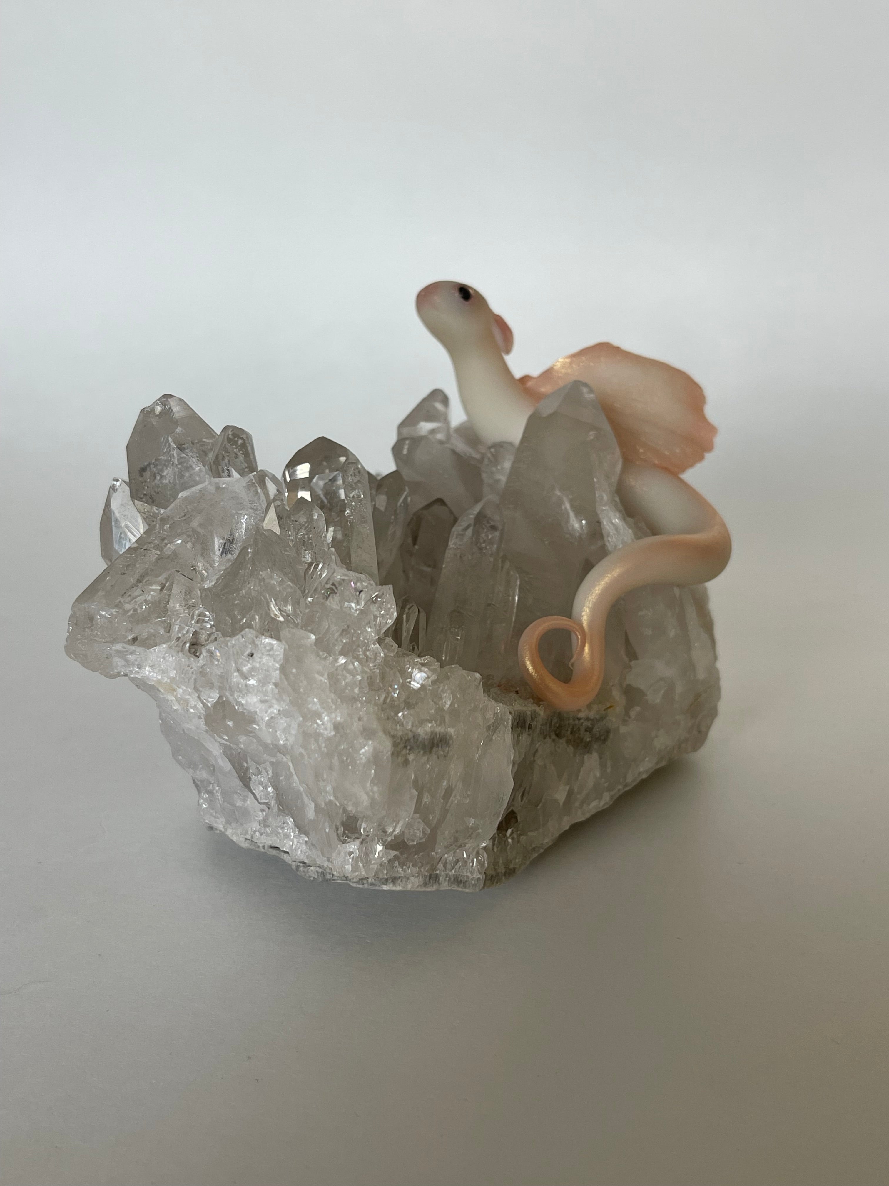 This gorgeous piece is a stand-alone lighted sculpture. The dragon is hand sculpted from clay and painted using natural pigments. It rests on top of a beautifully unique quartz cluster.
