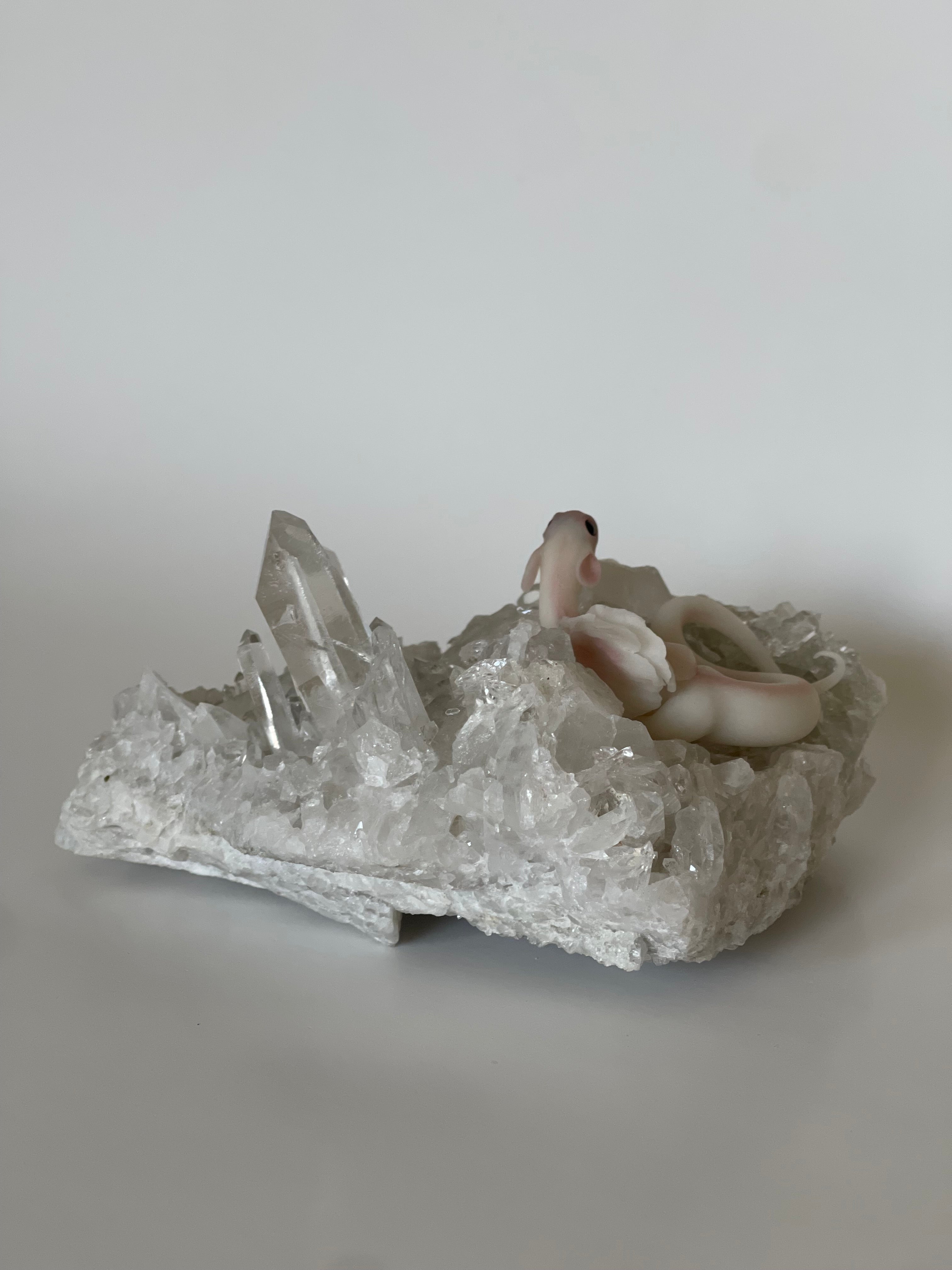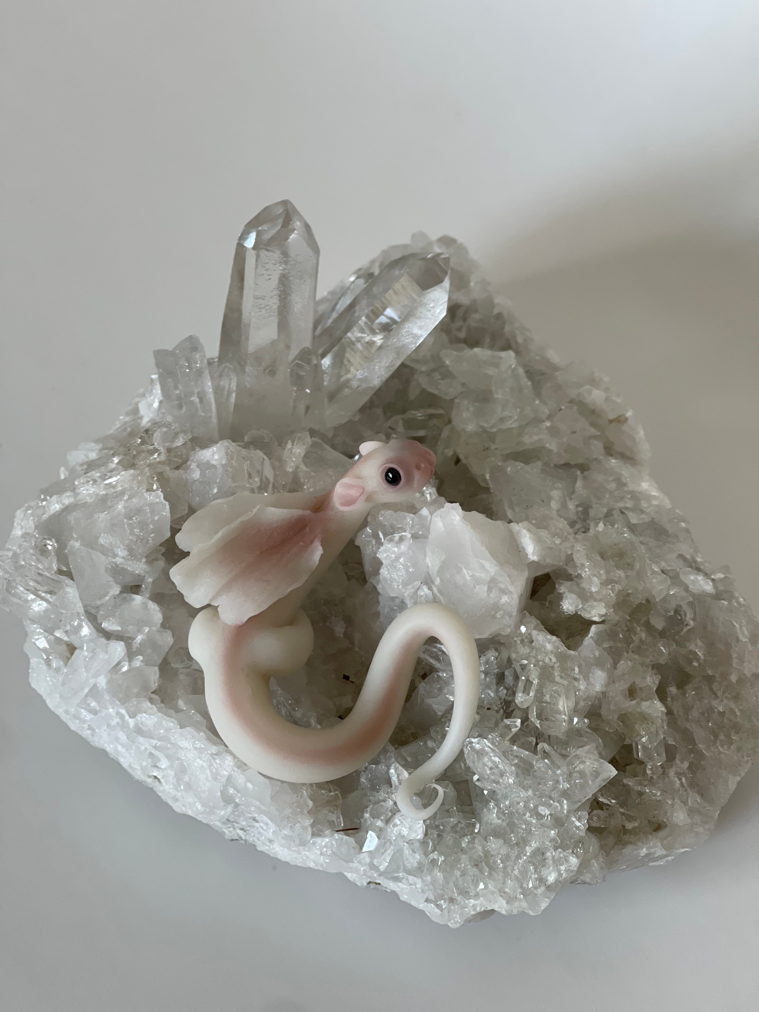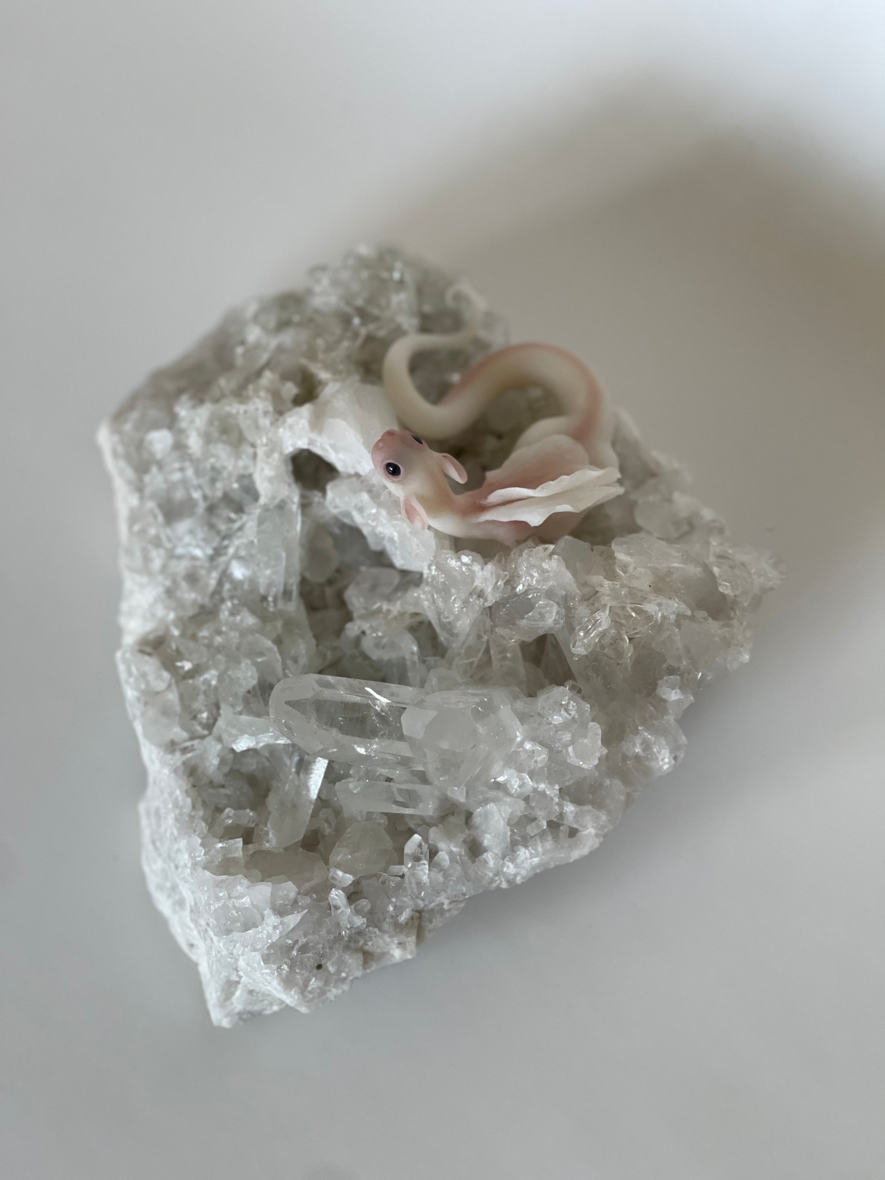 This gorgeous piece is a stand-alone sculpture. The dragon is hand sculpted from clay and painted using natural pigments. It rests on top of a beautifully unique quartz cluster.