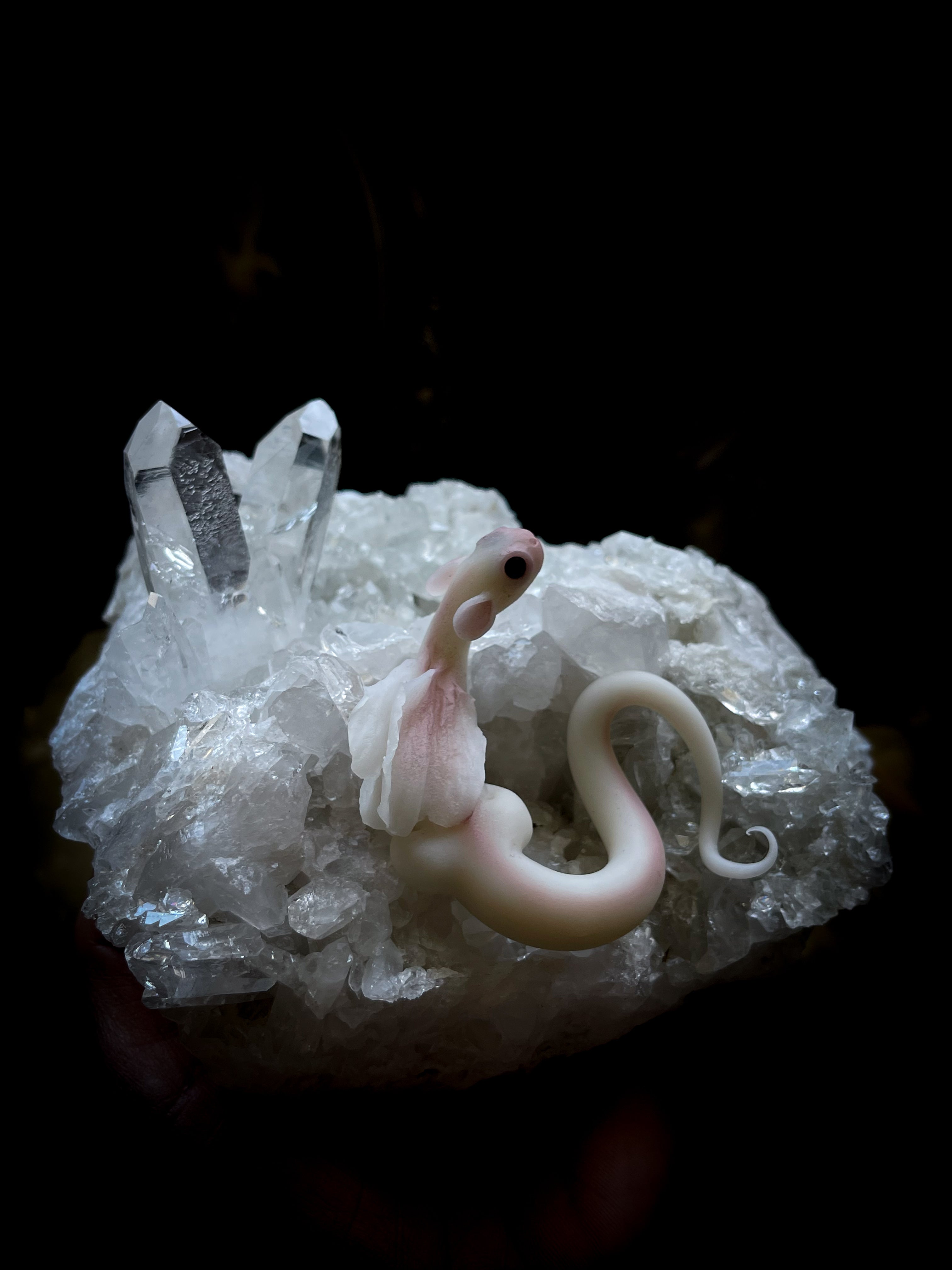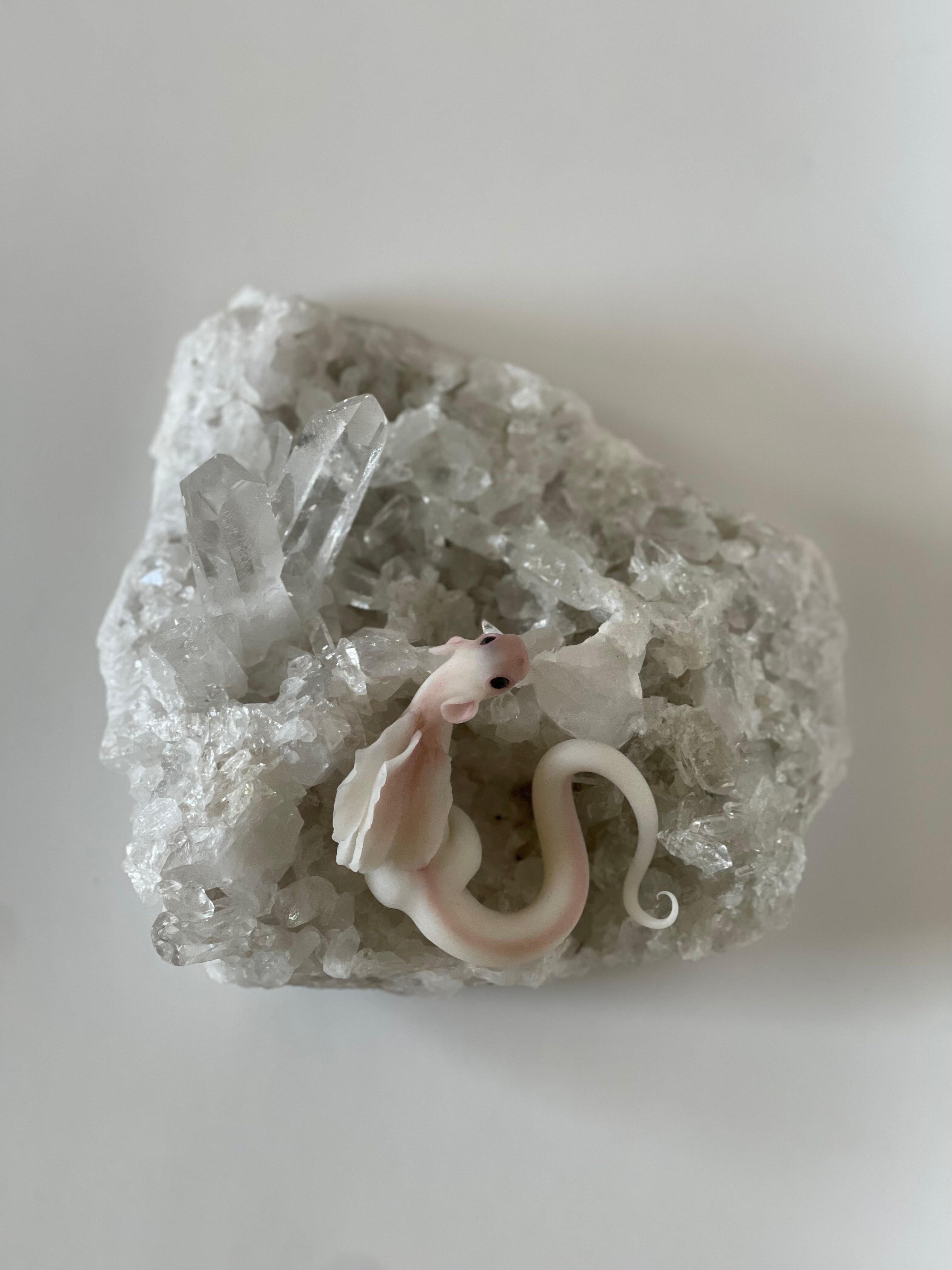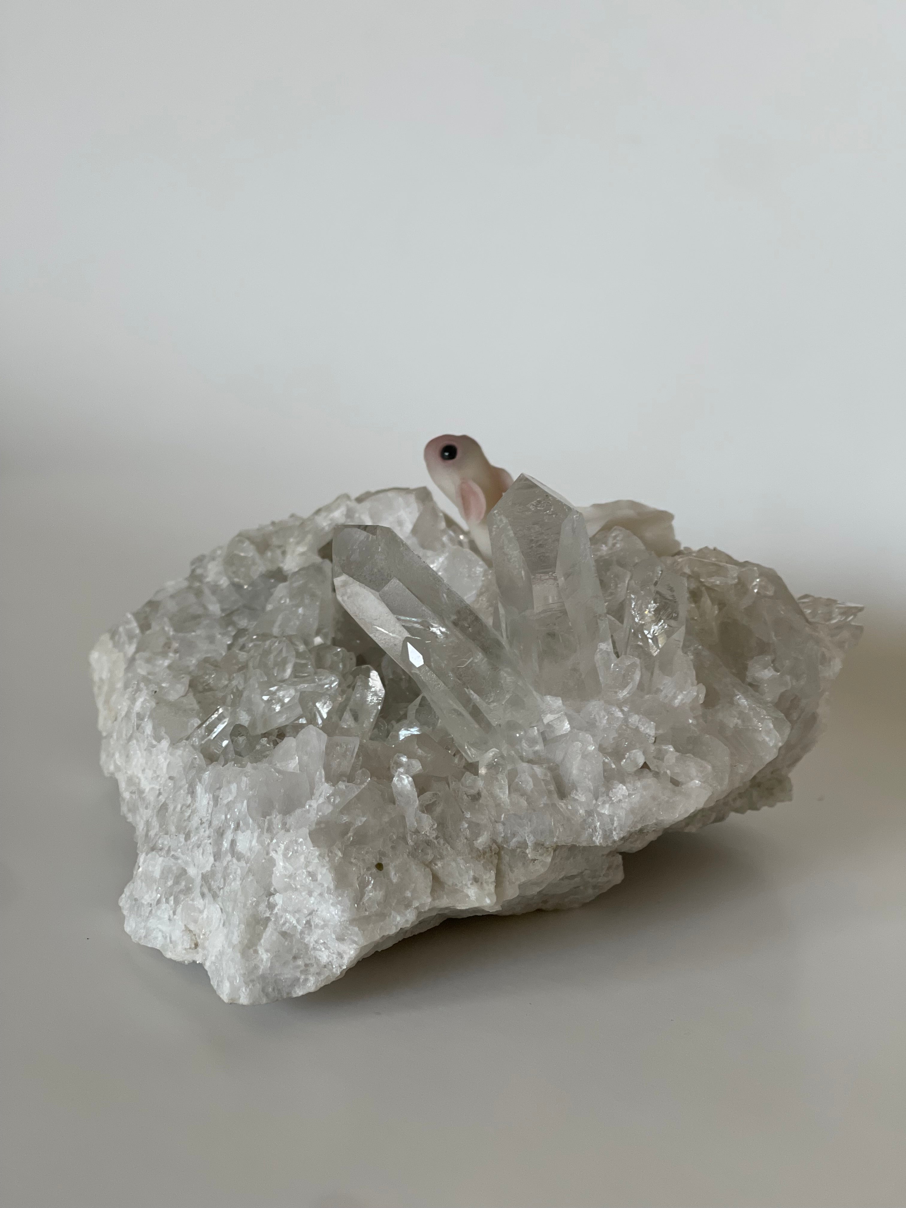 This gorgeous piece is a stand-alone sculpture. The dragon is hand sculpted from clay and painted using natural pigments. It rests on top of a beautifully unique quartz cluster.