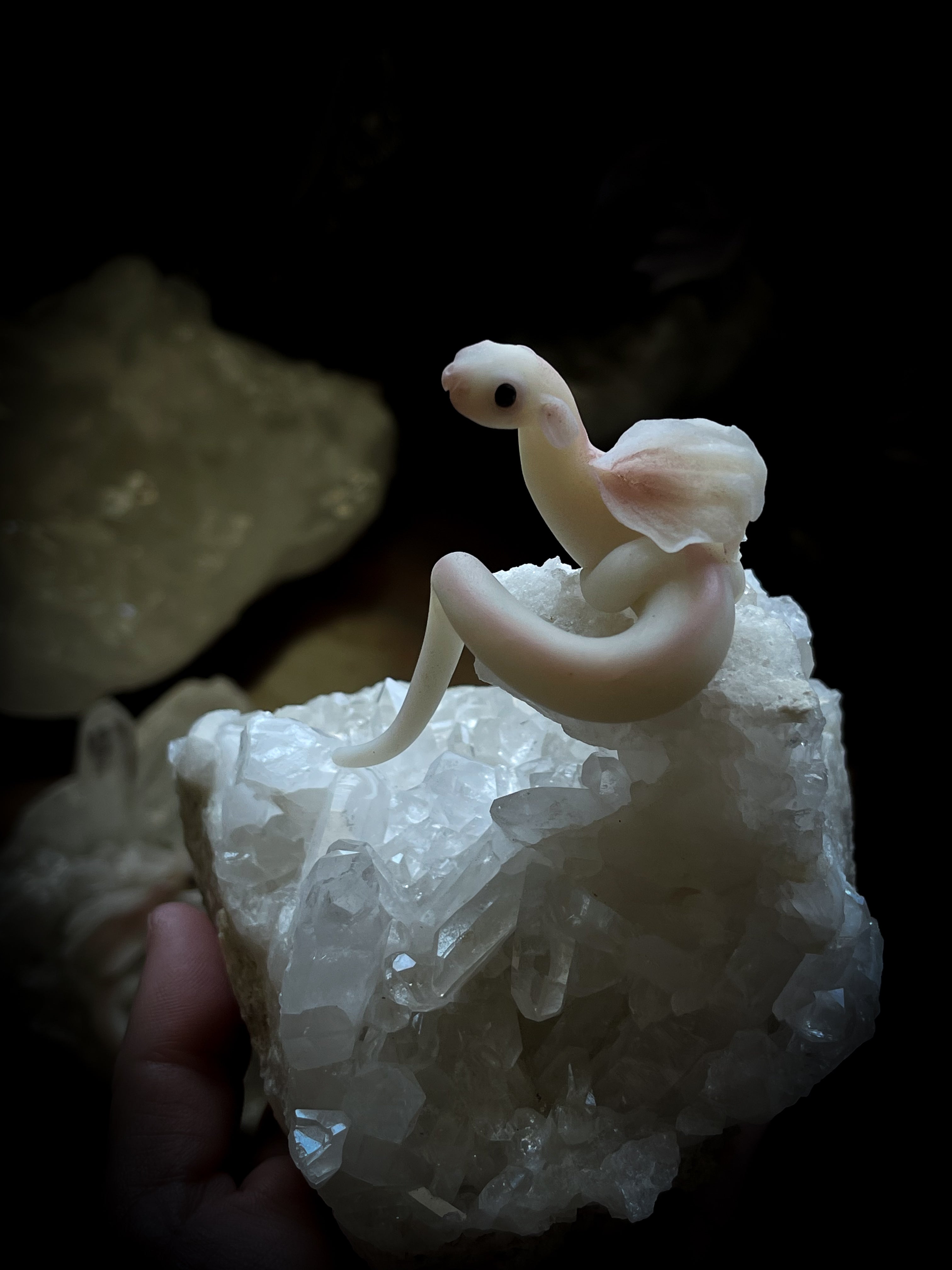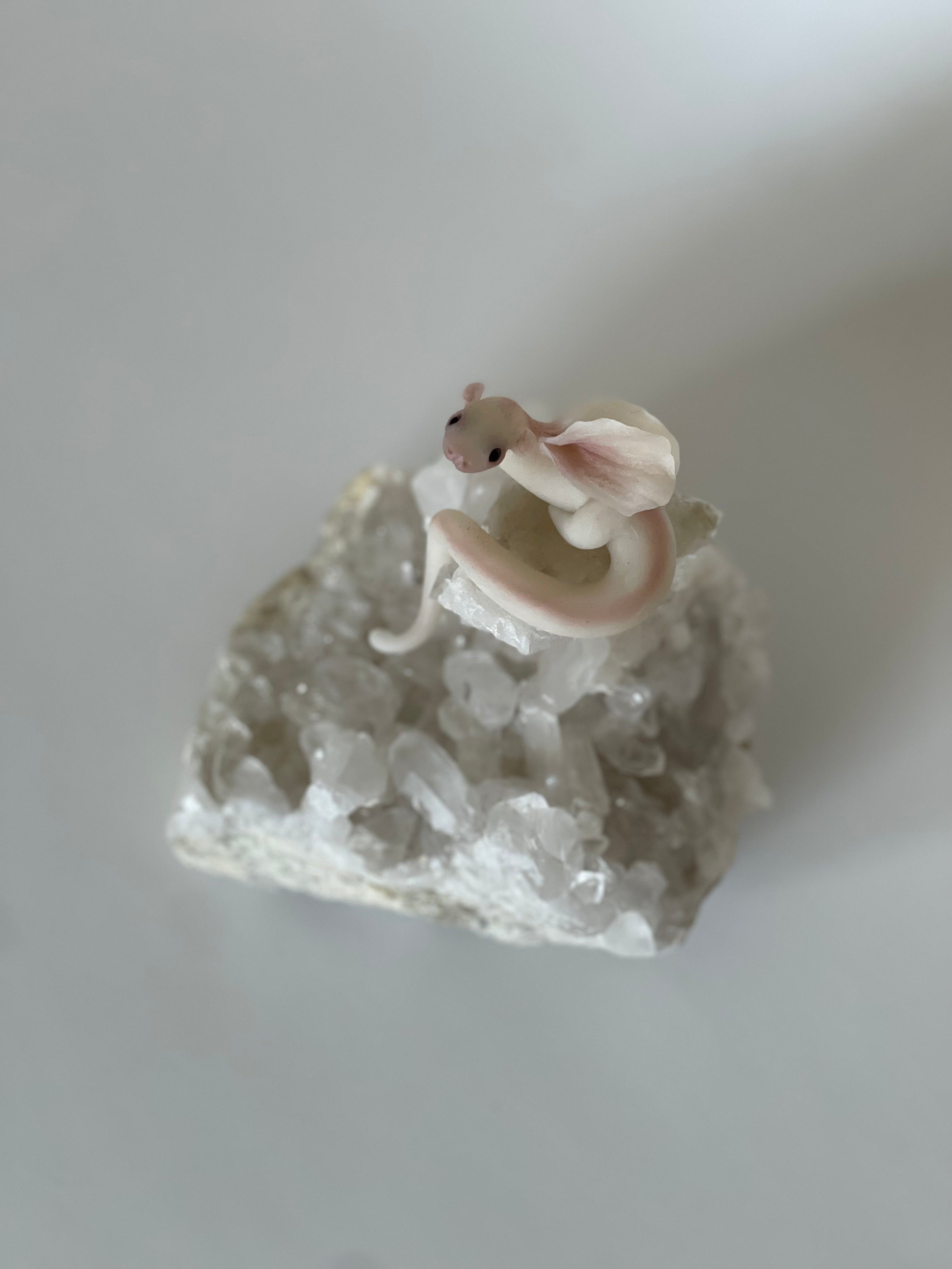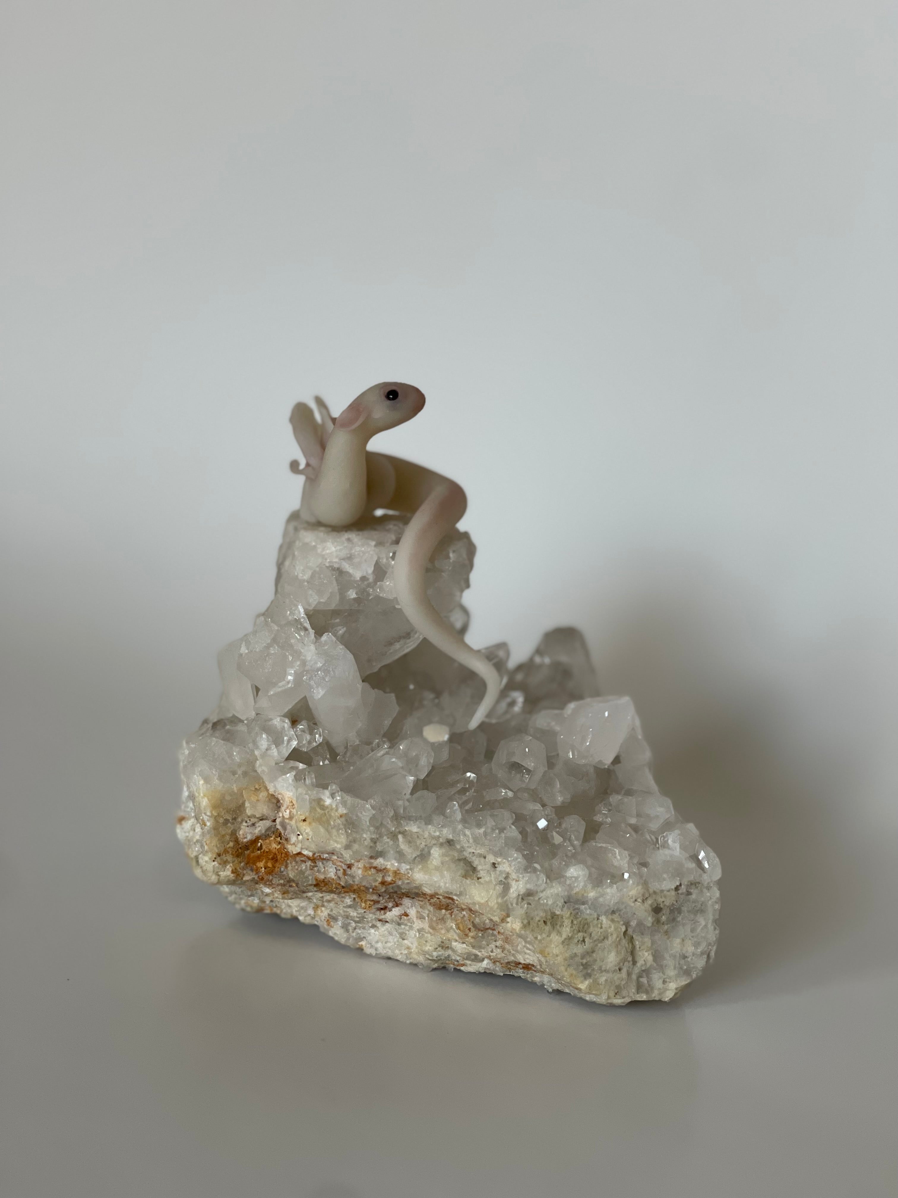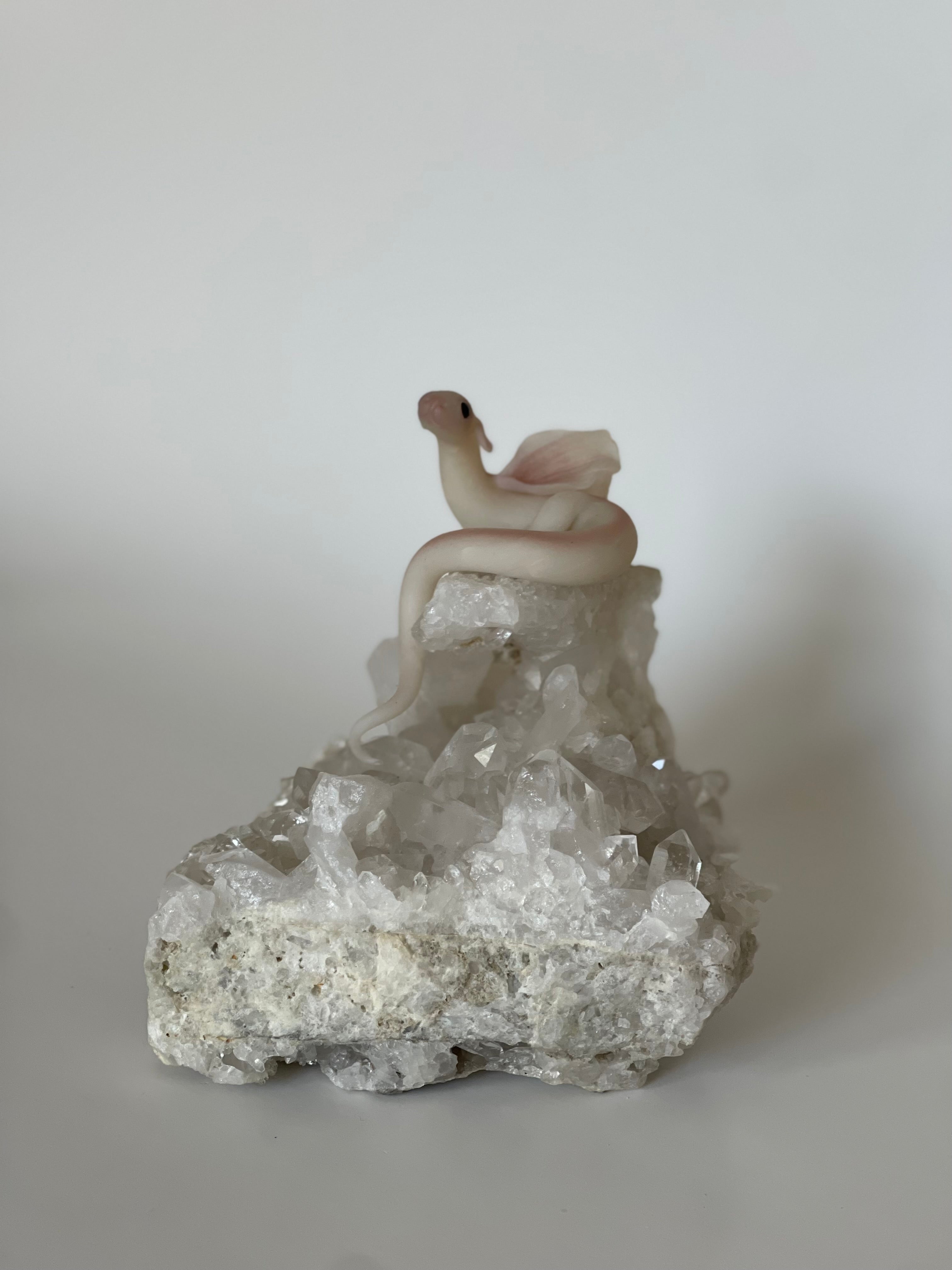 This gorgeous piece is a stand-alone sculpture. The dragon is hand sculpted from clay and painted using natural pigments. It rests on top of a beautifully unique quartz cluster.