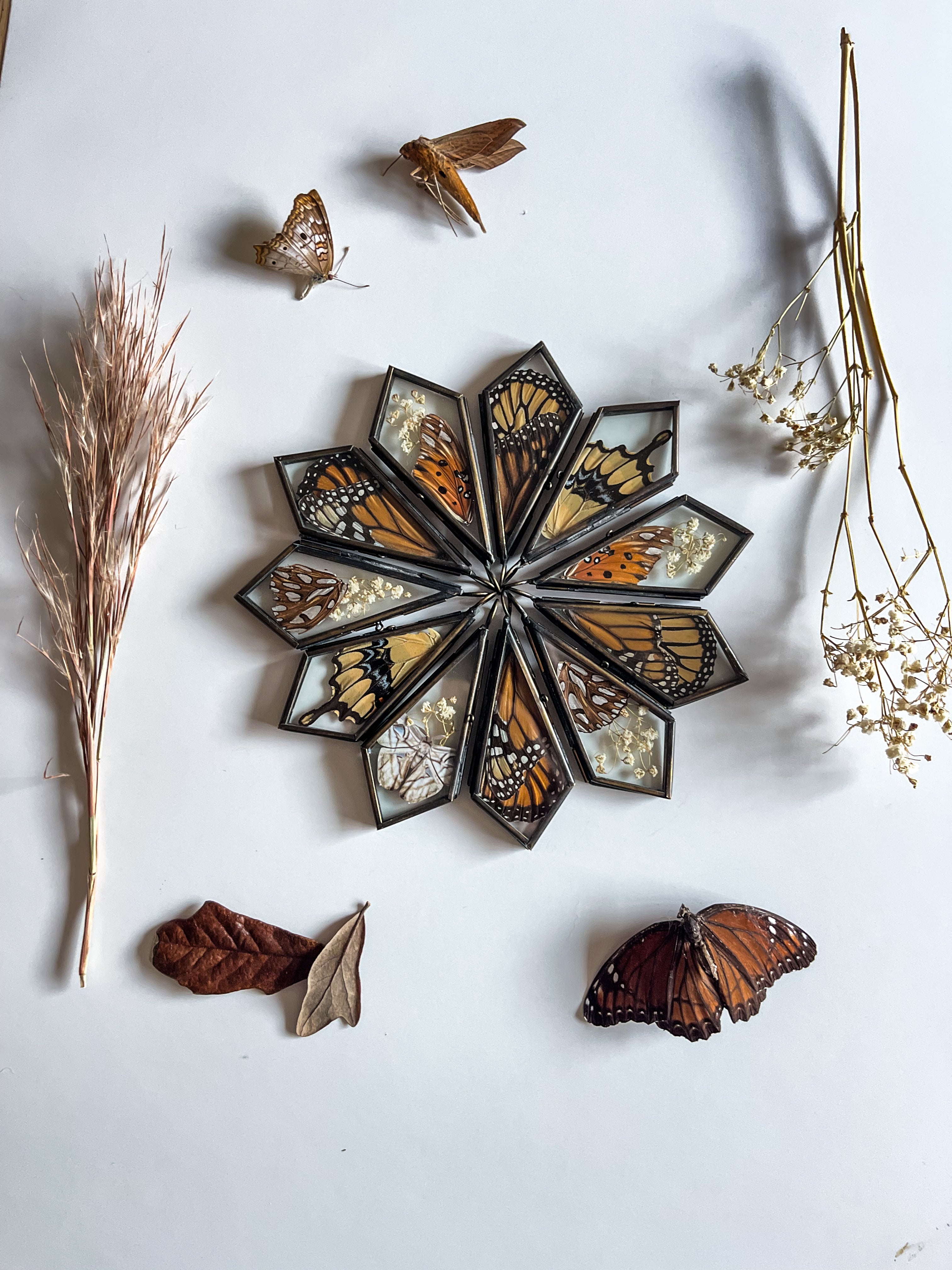 Insect wings were acquired ethically in my travels. All flora is dried by me.