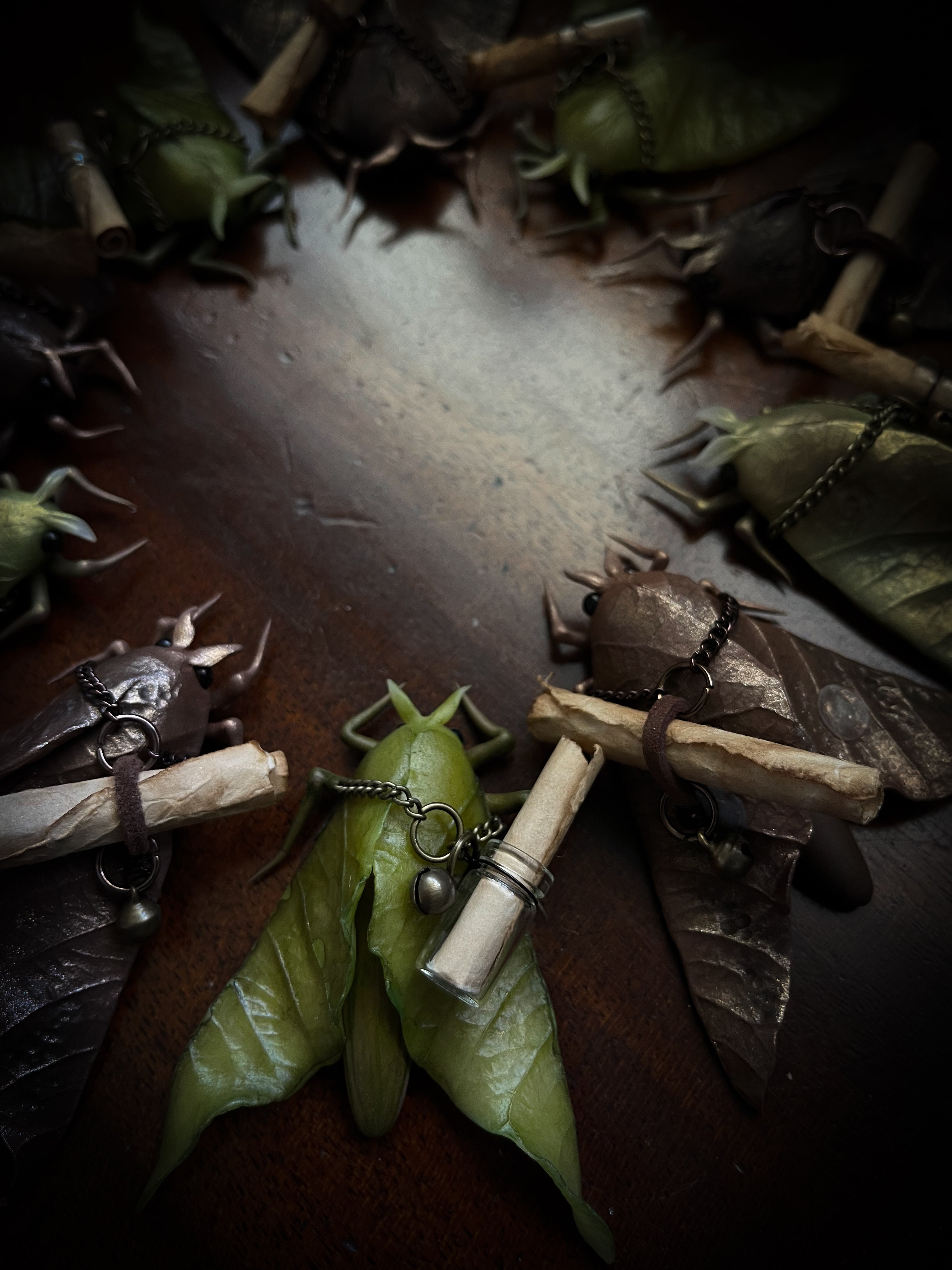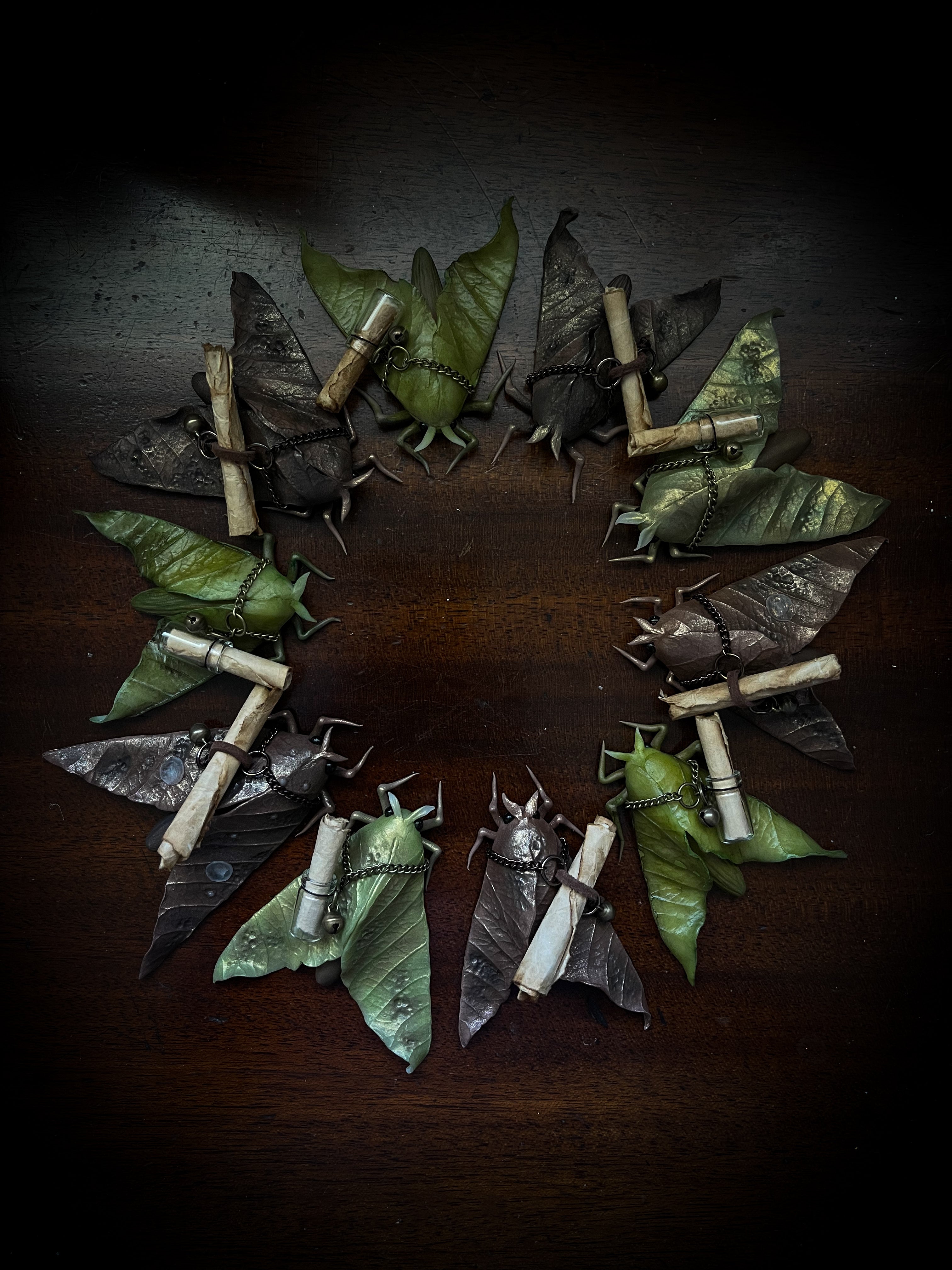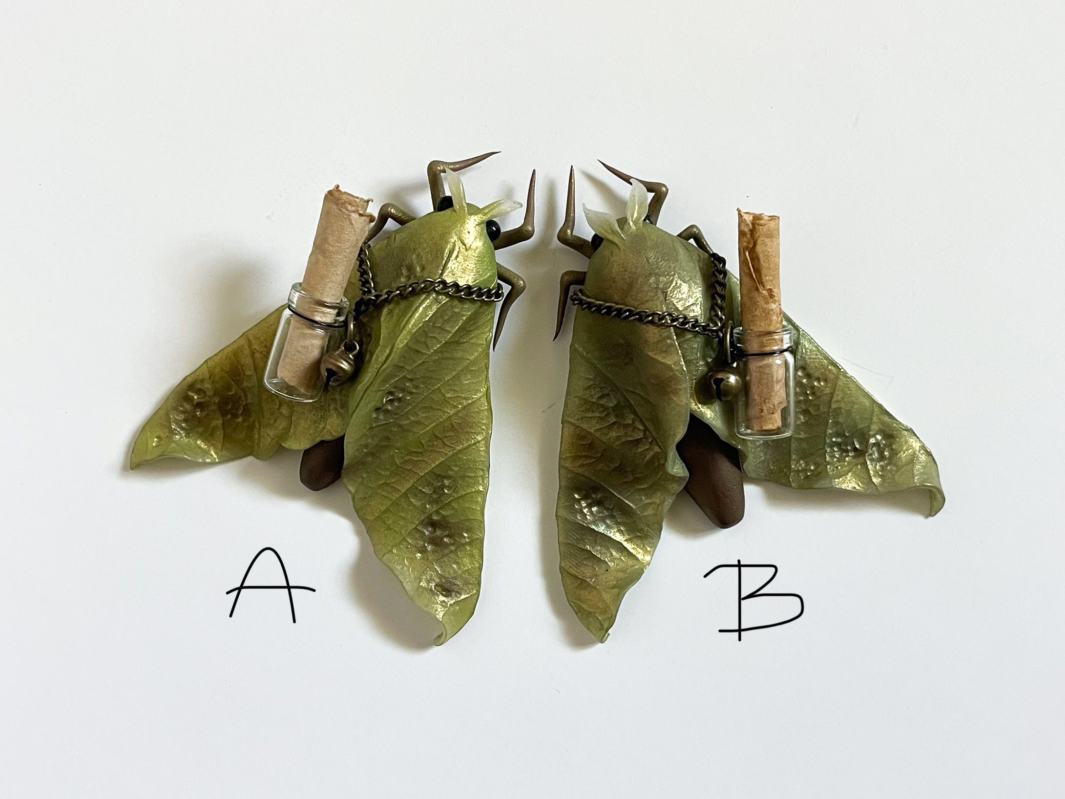These sweet little moths come to those who might need them. A message, a smile, a thought. They are hand sculpted with clay and colored using natural pigments. They each have a scroll containing a simple lyric of a song that makes me smile.