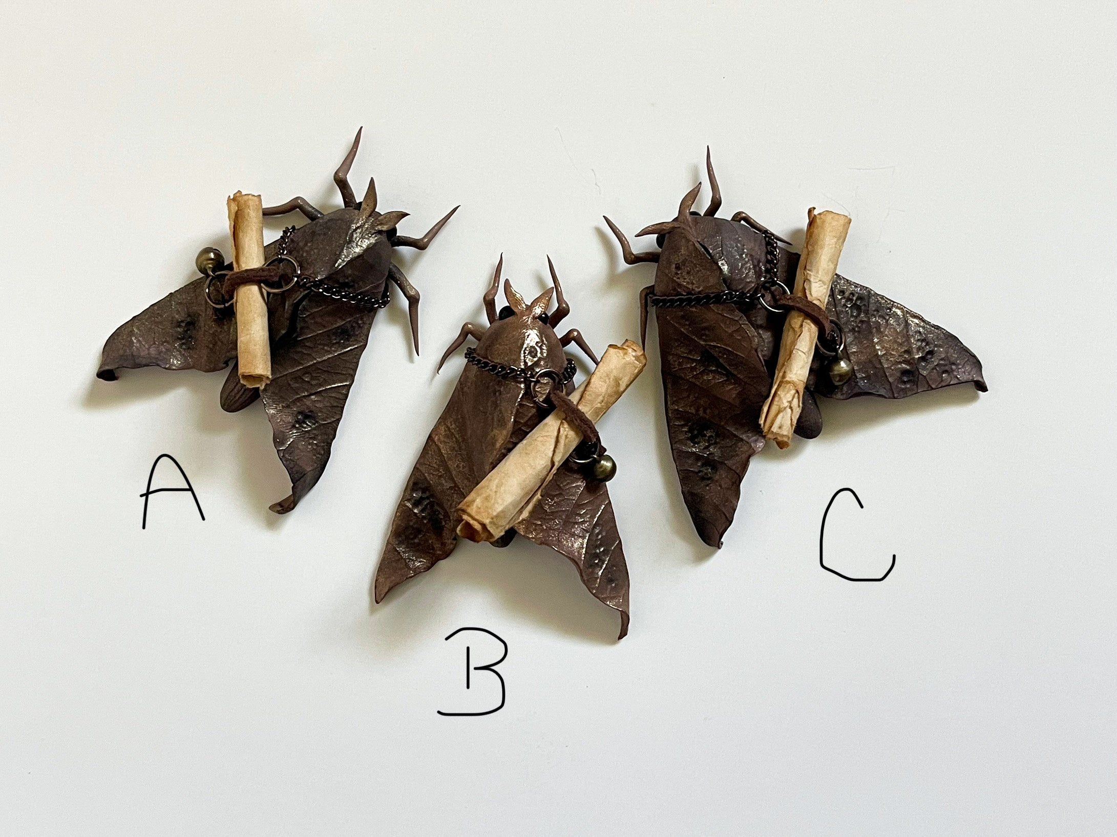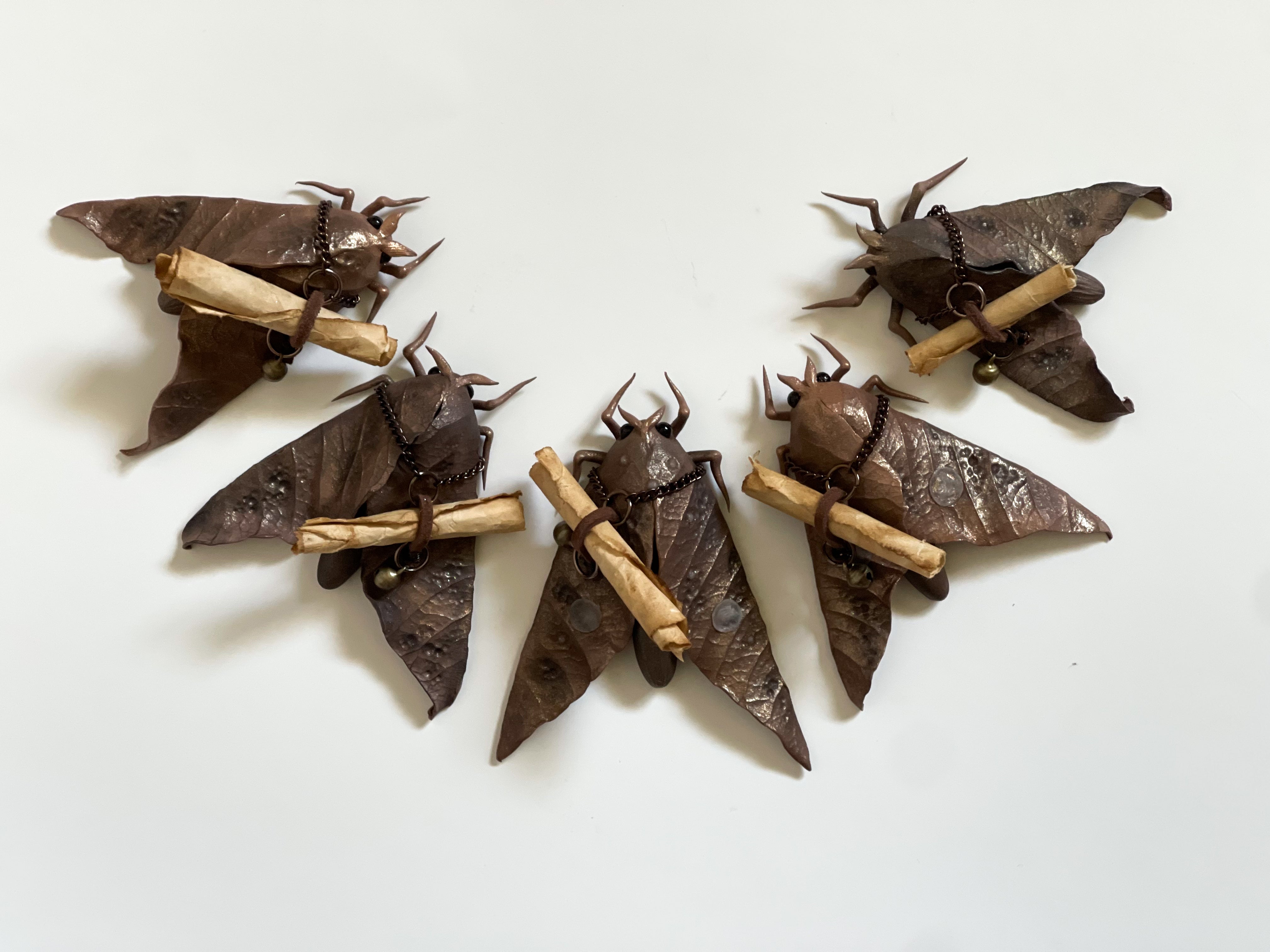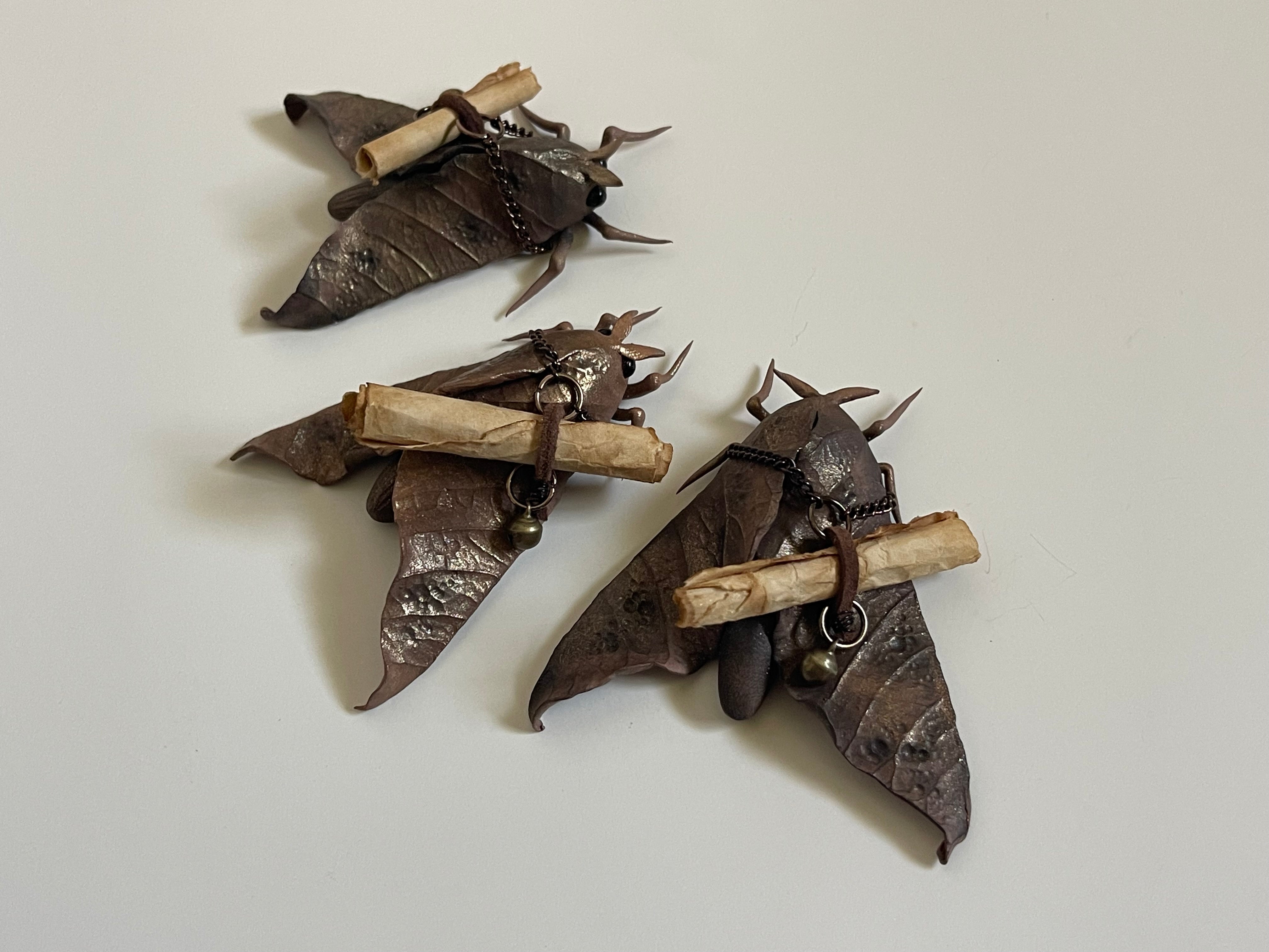 These sweet little moths come to those who might need them. A message, a smile, a thought. They are hand sculpted with clay and colored using natural pigments. They each have a scroll containing a simple lyric of a song that makes me smile.