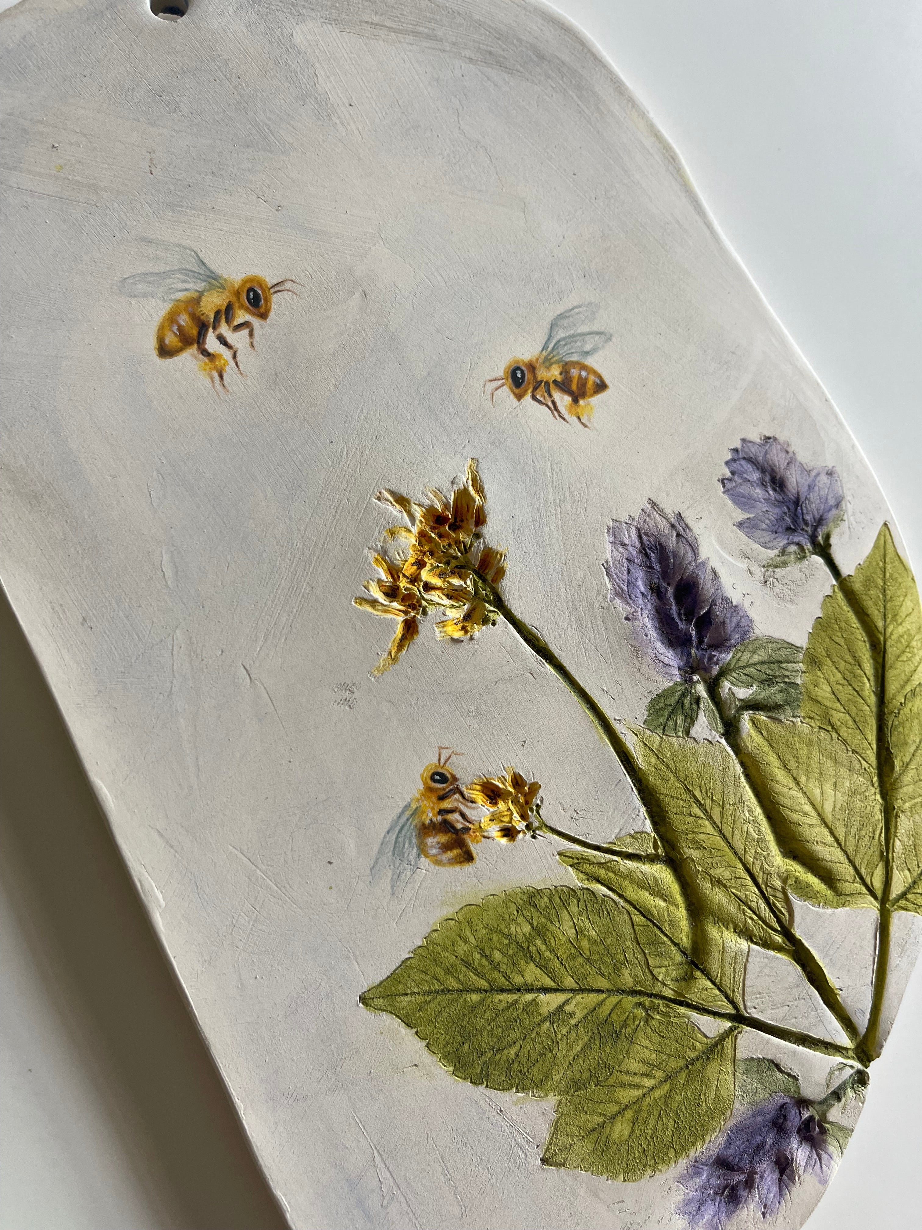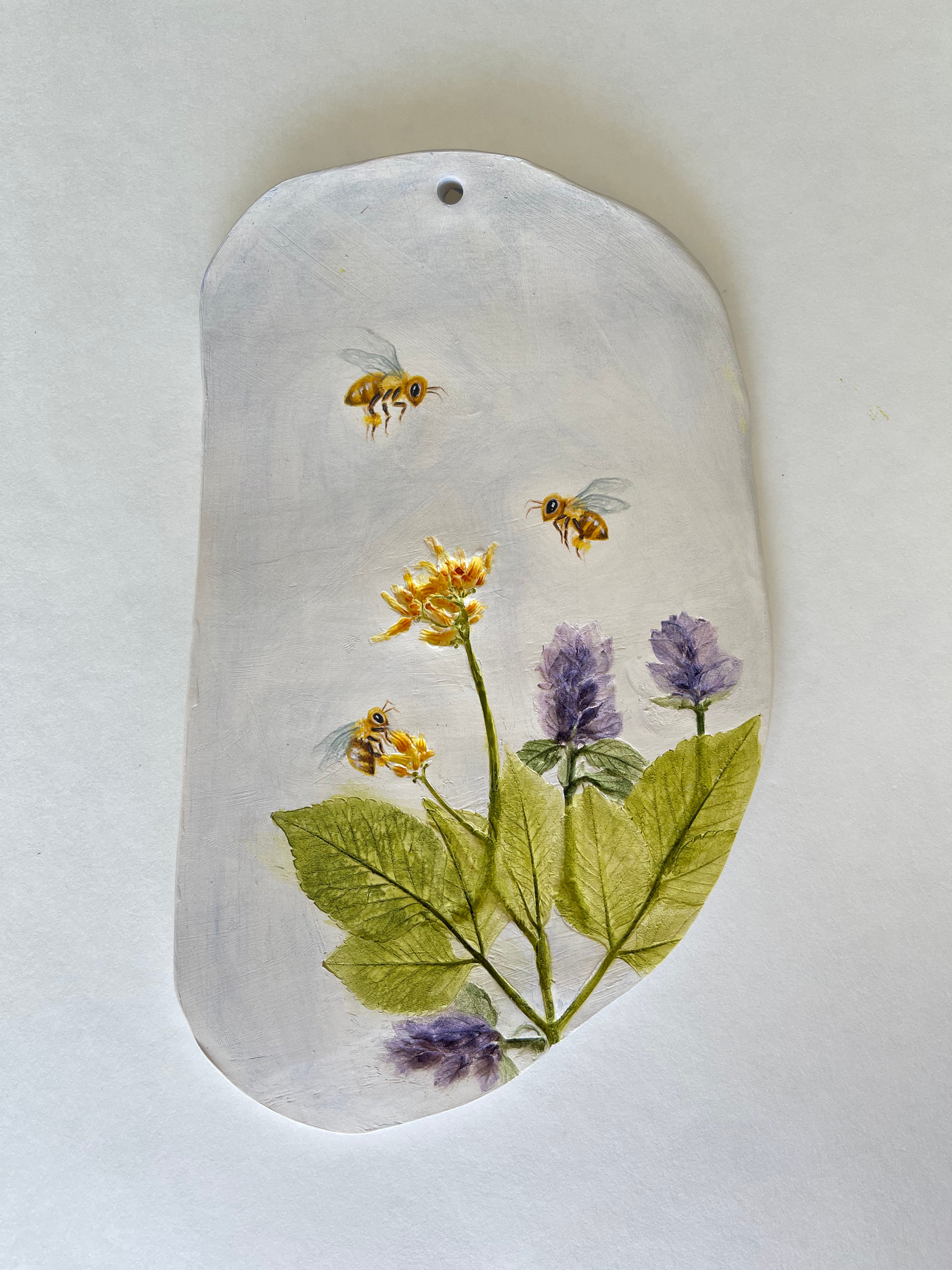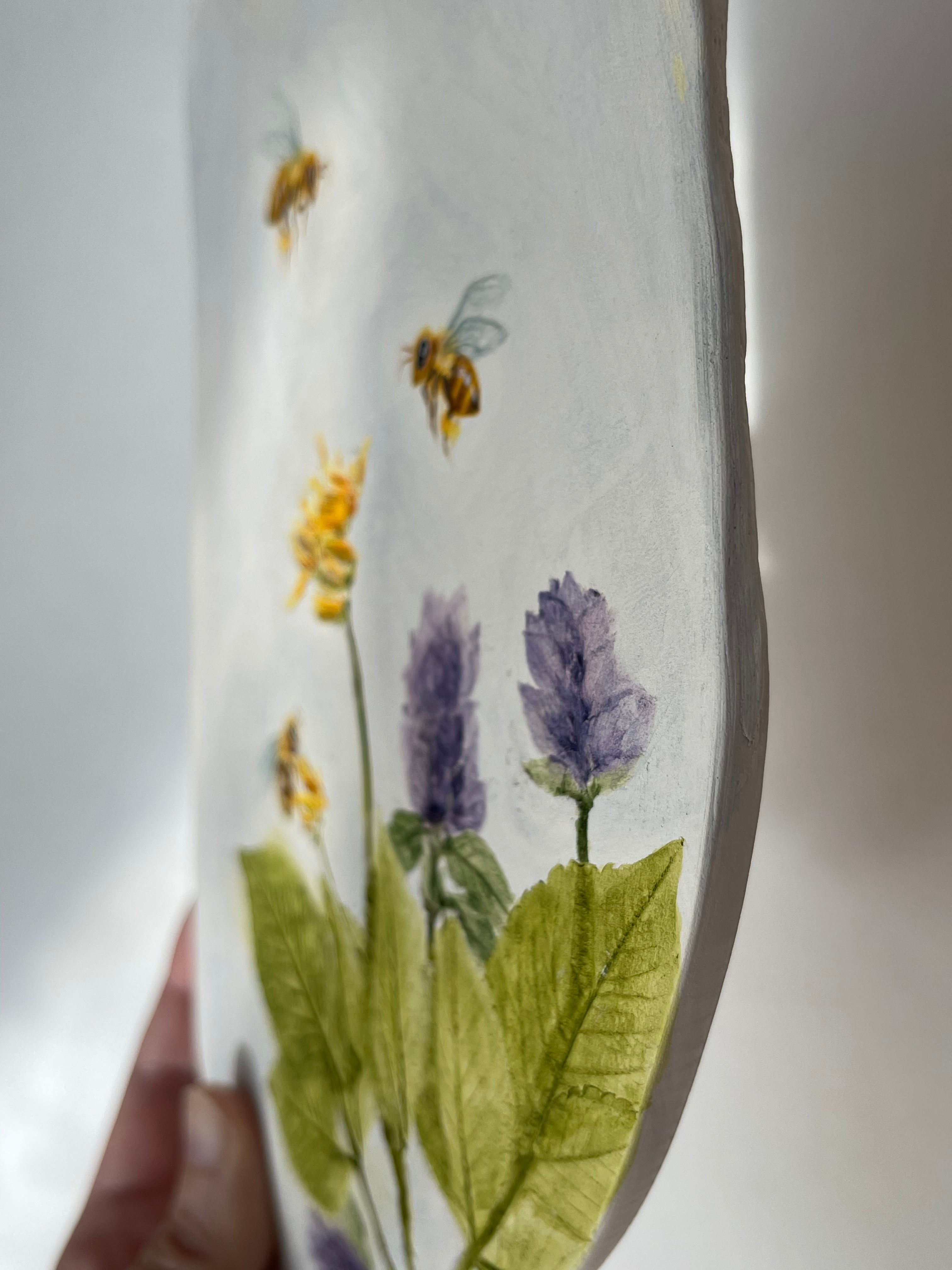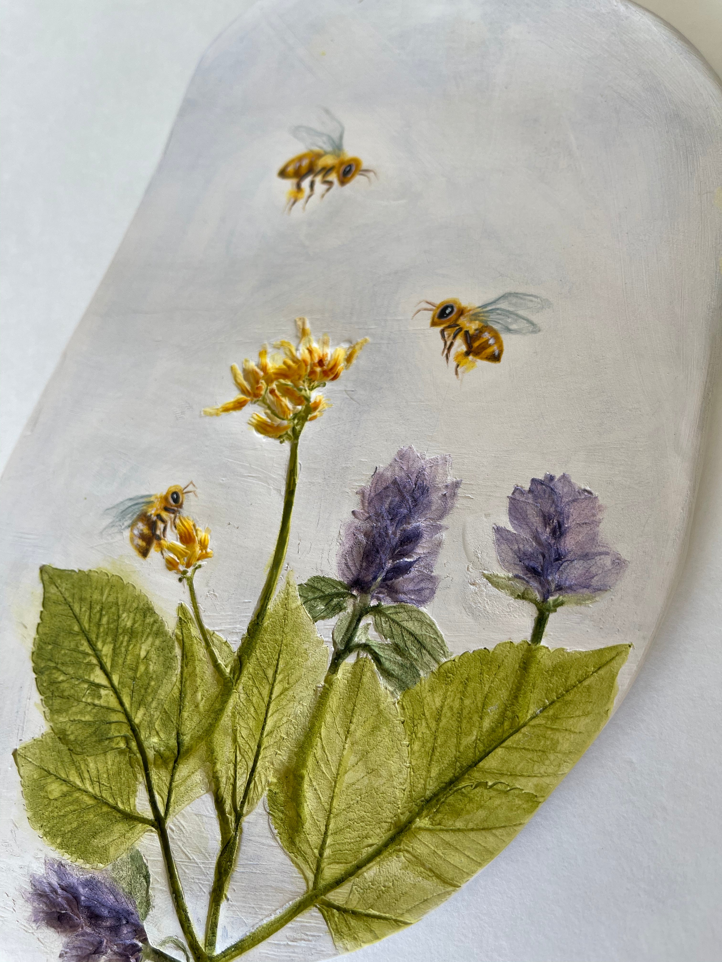 This is a ceramic slab with pressed Flora imprints and painted honey bees.