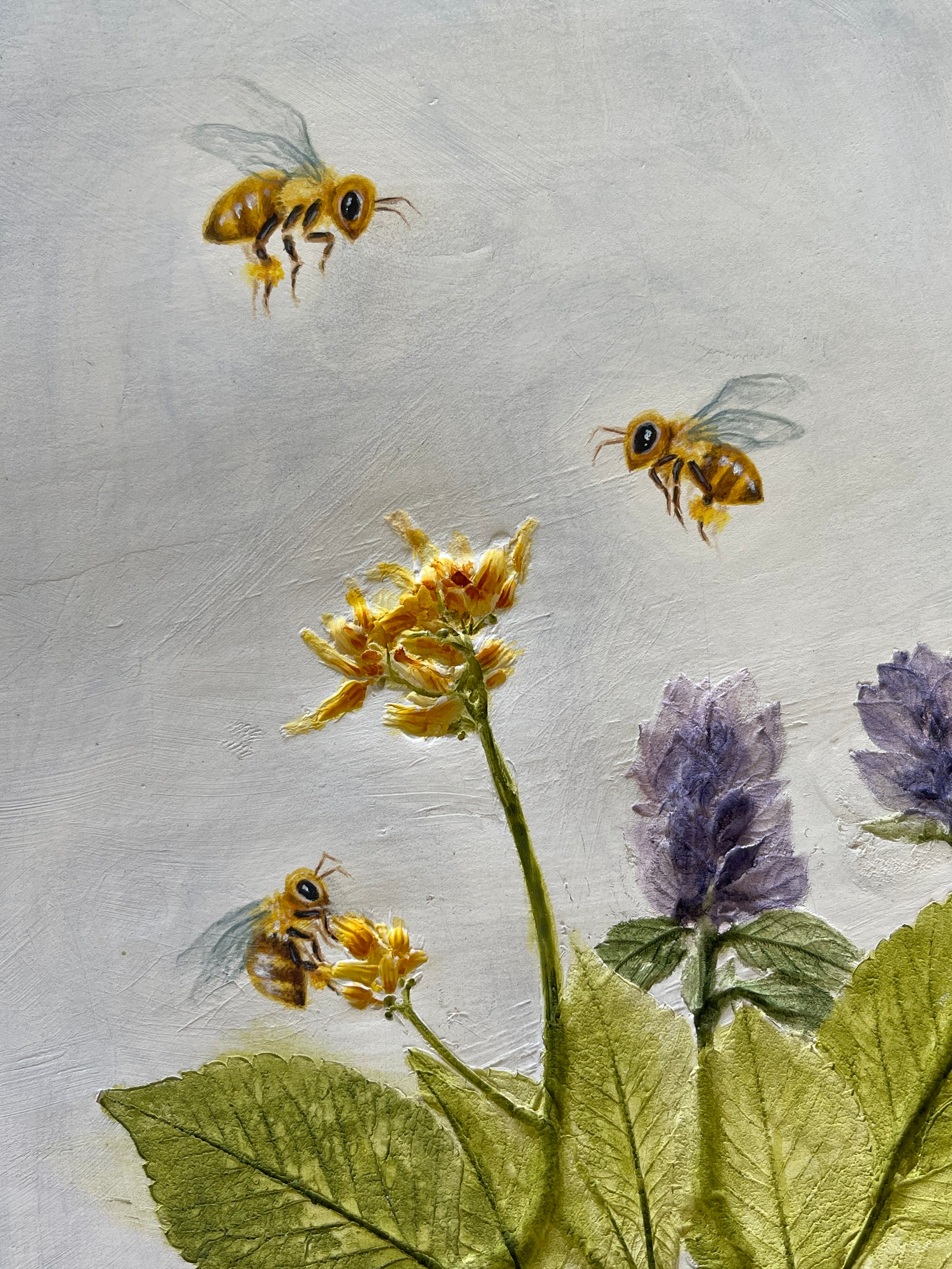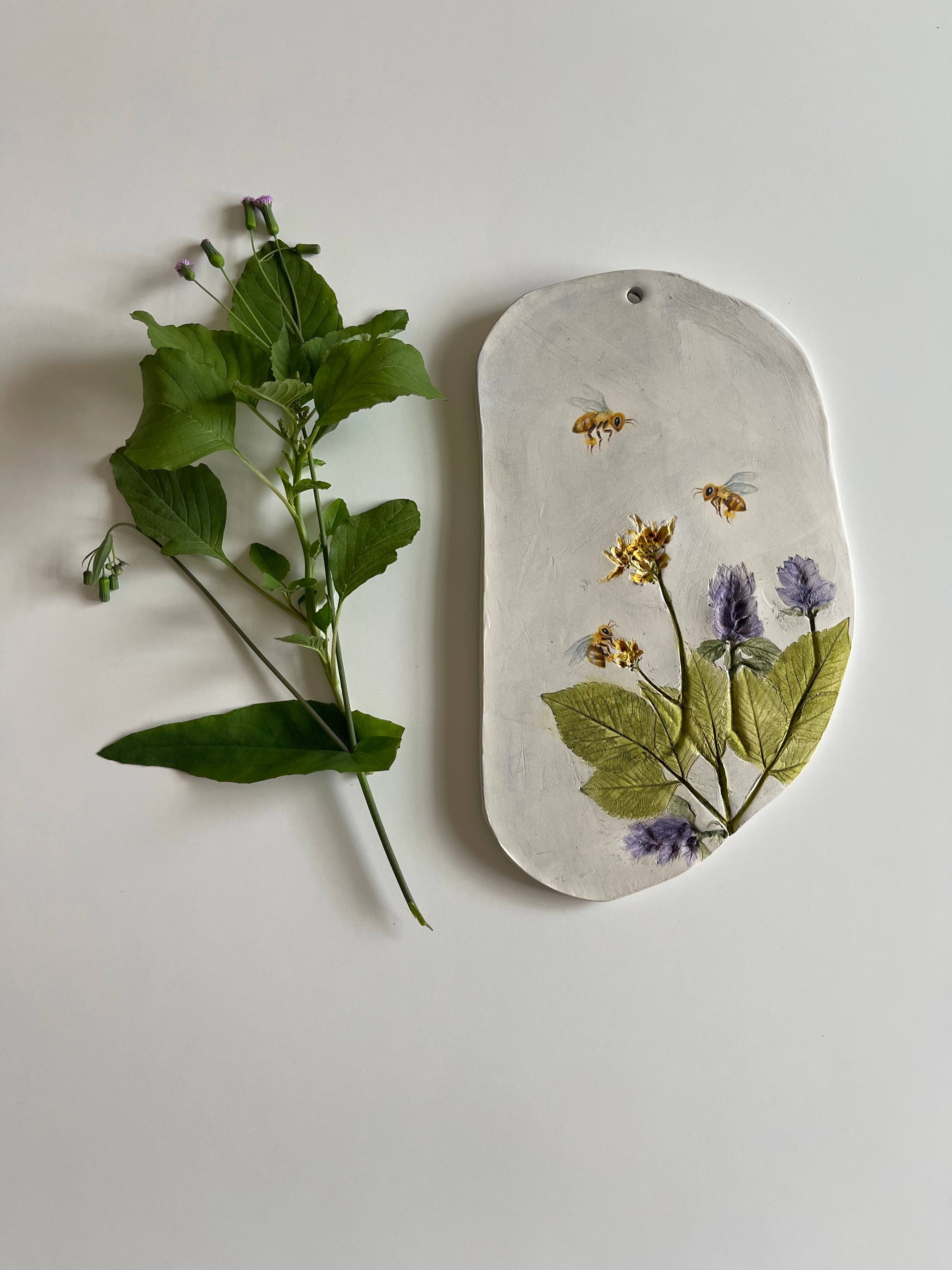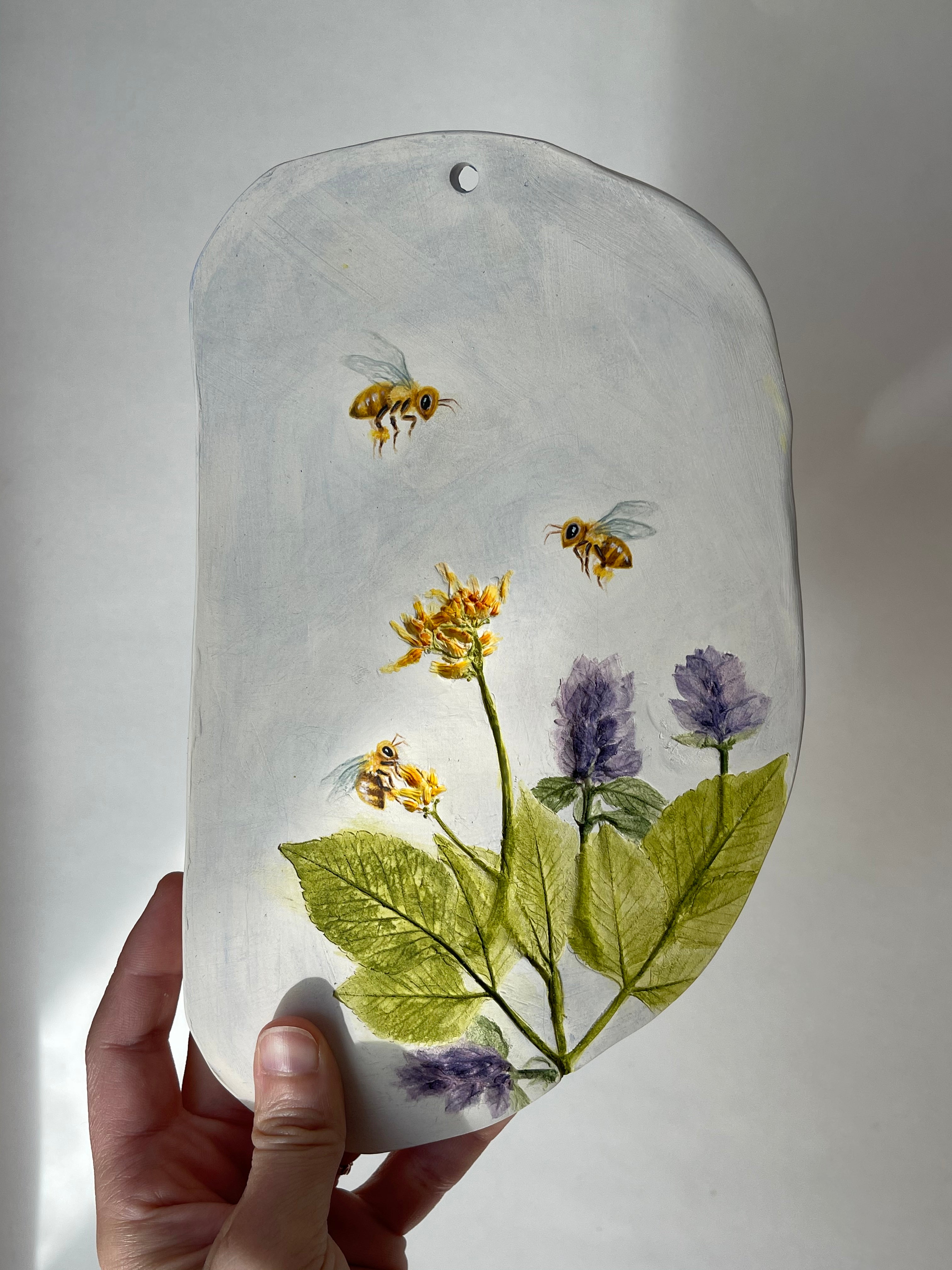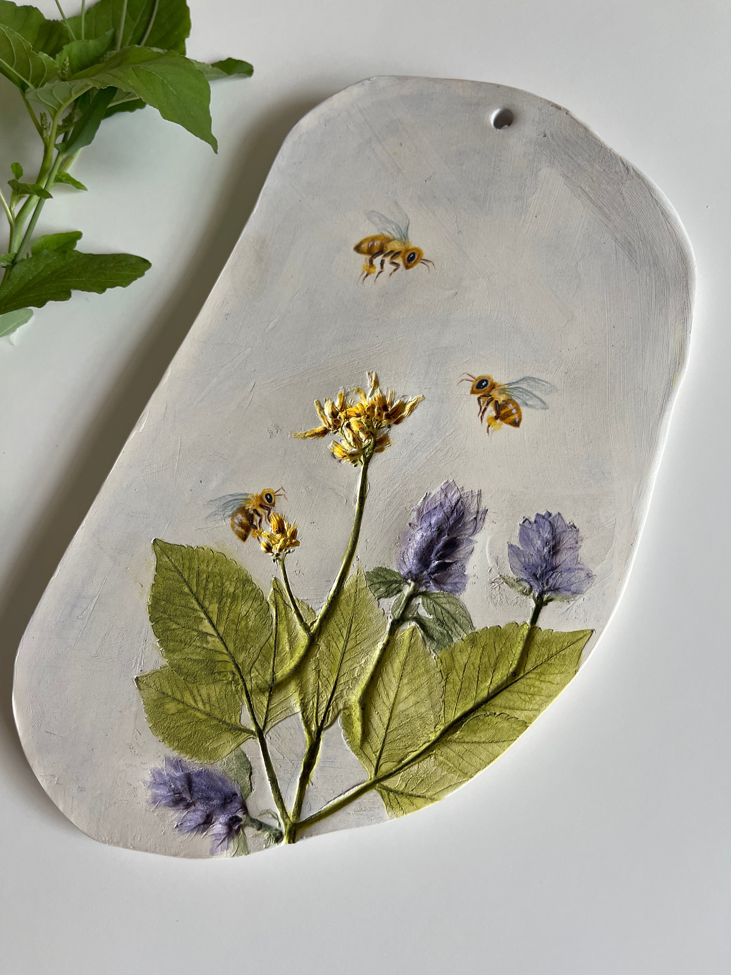 This is a ceramic slab with pressed Flora imprints and painted honey bees.