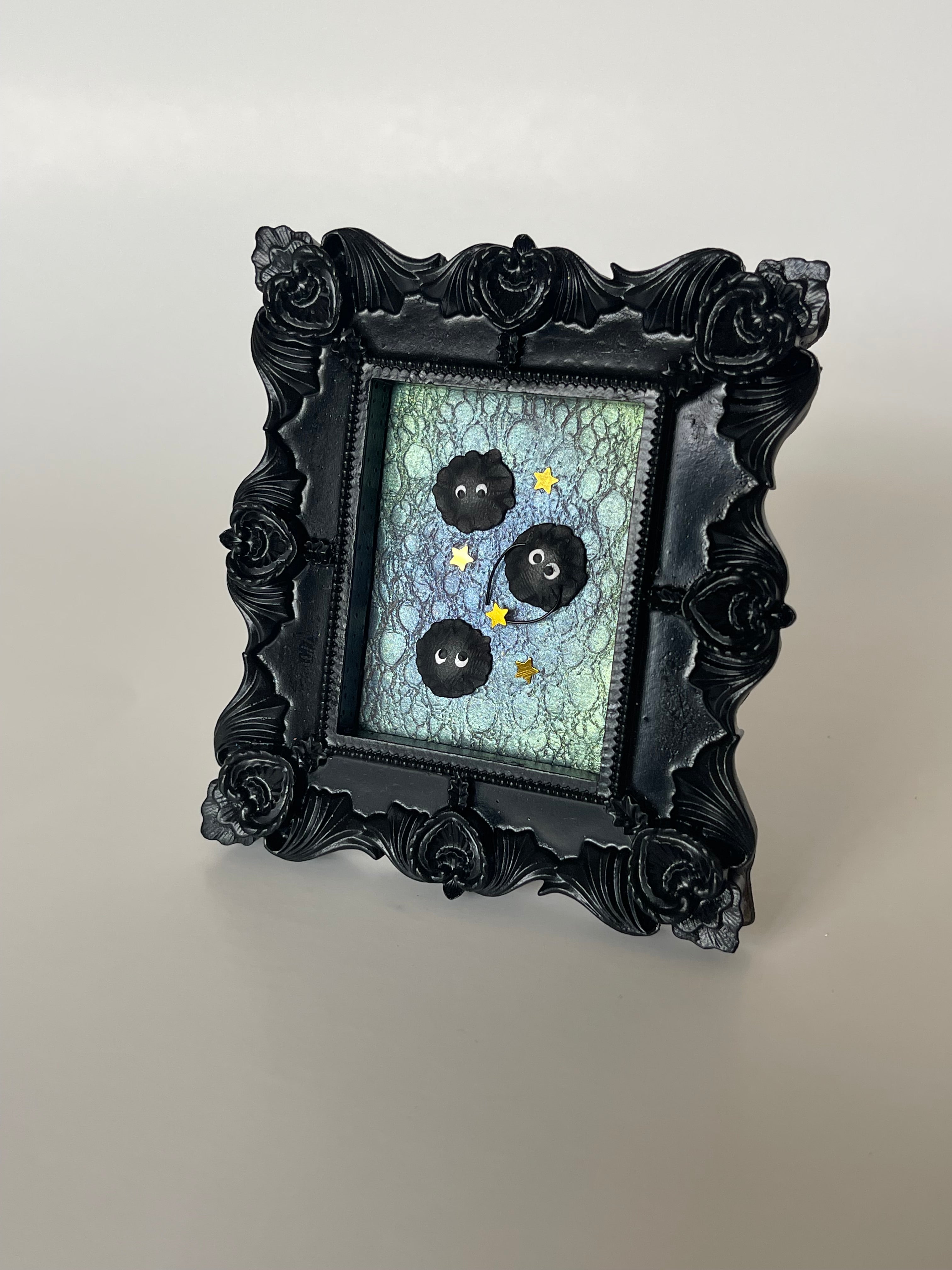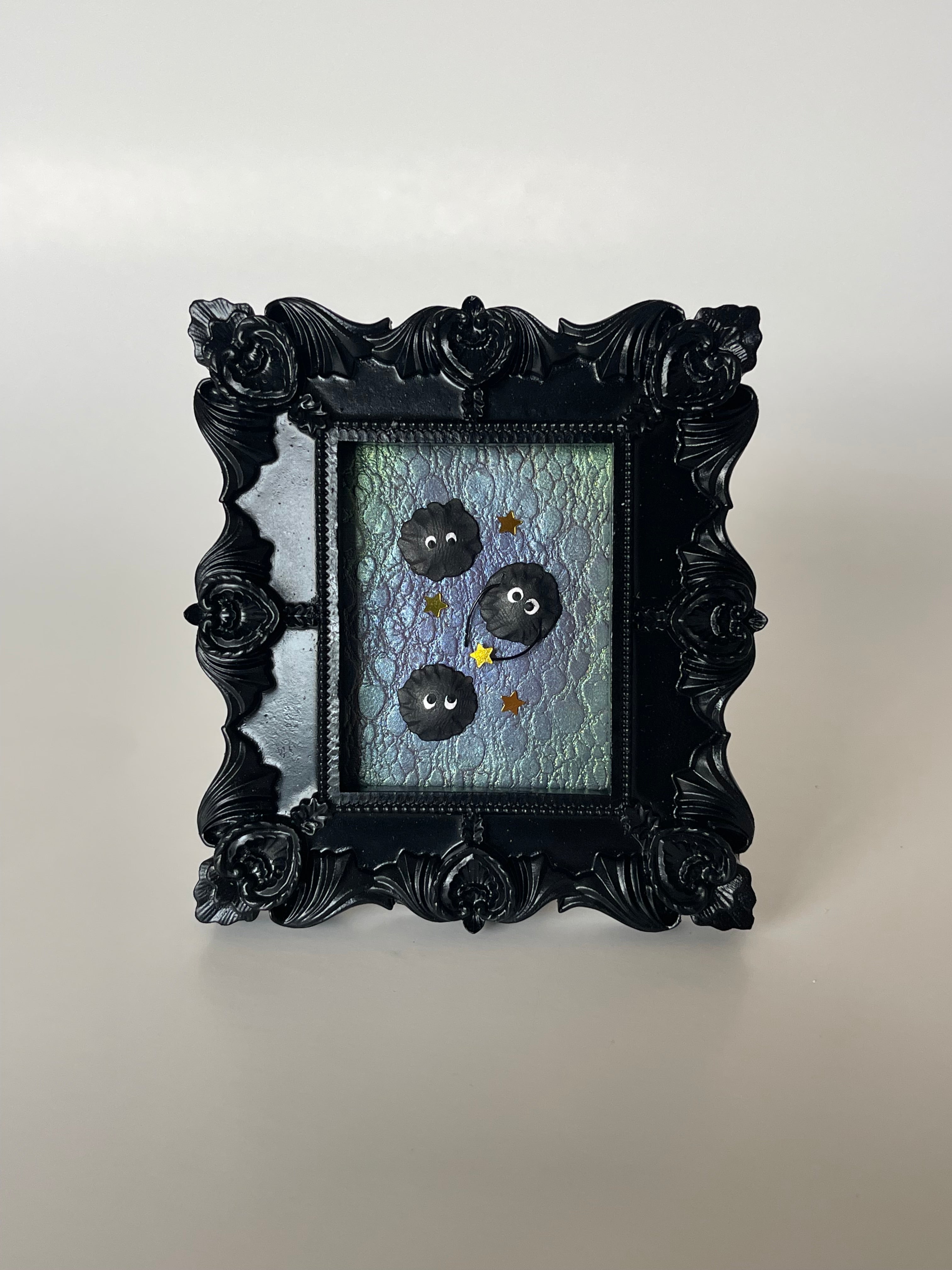 This tiny framed piece is a relief sculpture. Everything is hand sculpted and painted.